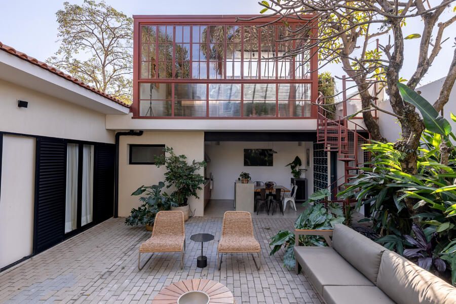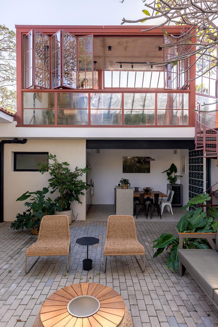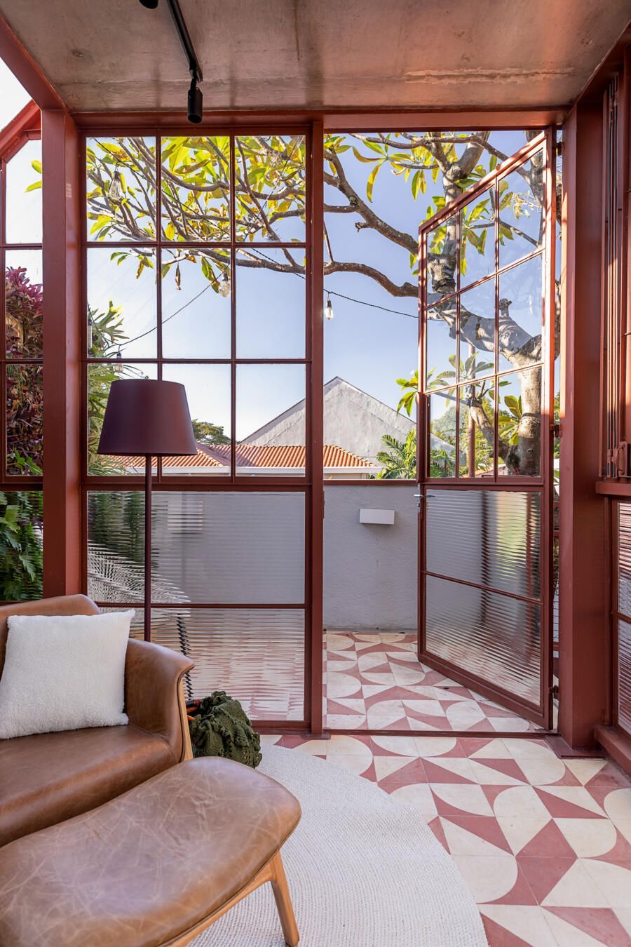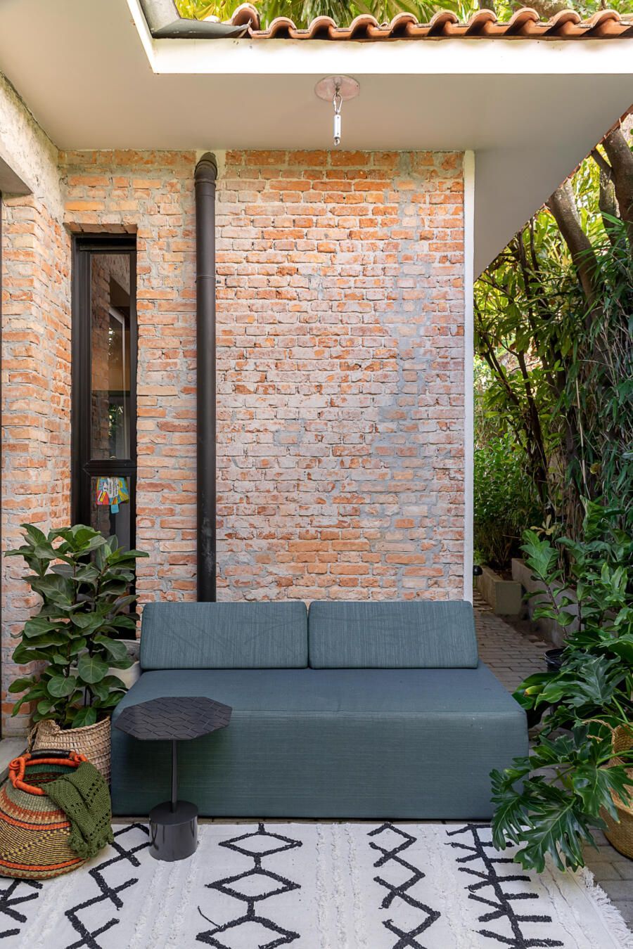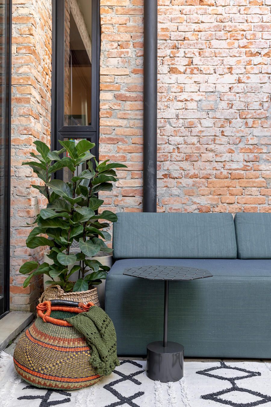 “O ladrilho hidráulico por exemplo, além de lindo, já tinha história para contar, então levamos a cor marsala dele para a estrutura metálica e marcenaria e o tom claro para a parede de fundo do escritório, mantendo a mesma linguagem. Para manter também a rusticidade dos materiais, usamos a laje em concreto aparente. A parede verde, antes abandonada, foi reativada com novas plantas. E para facilitar o cuidado dessas plantas, instalamos uma irrigação automática e ao lado dela, projetamos um canto de leitura e uma pausa no trabalho.”