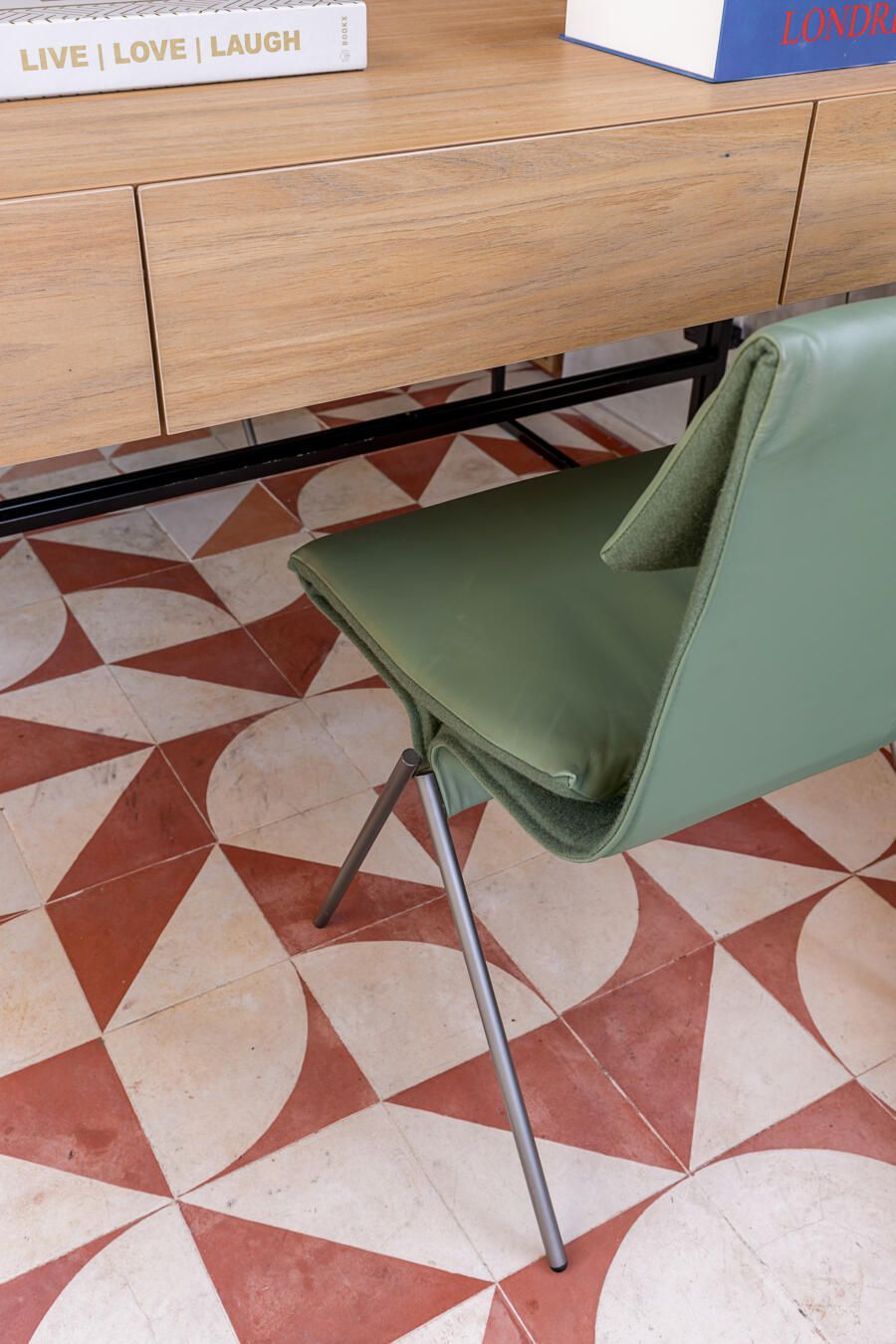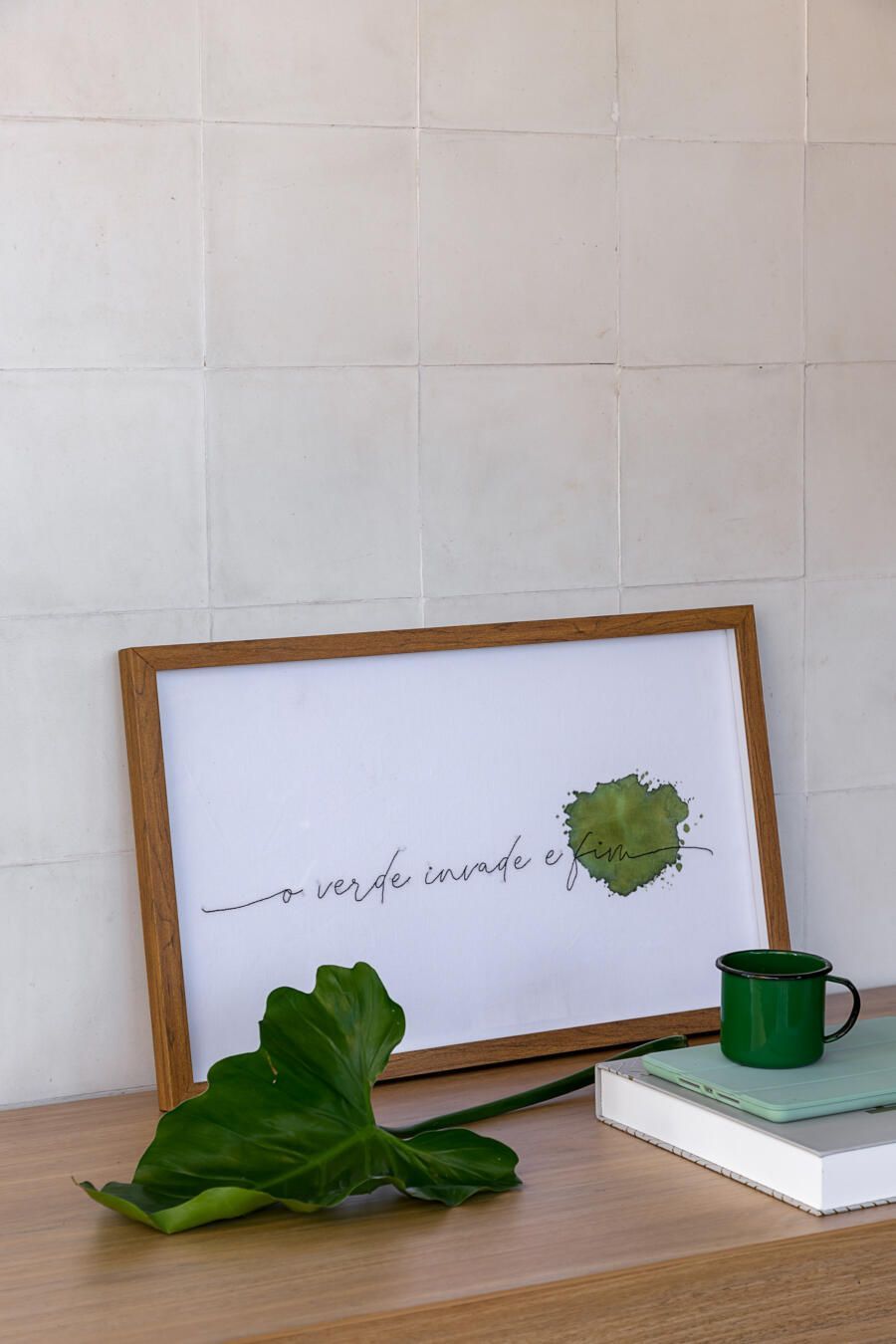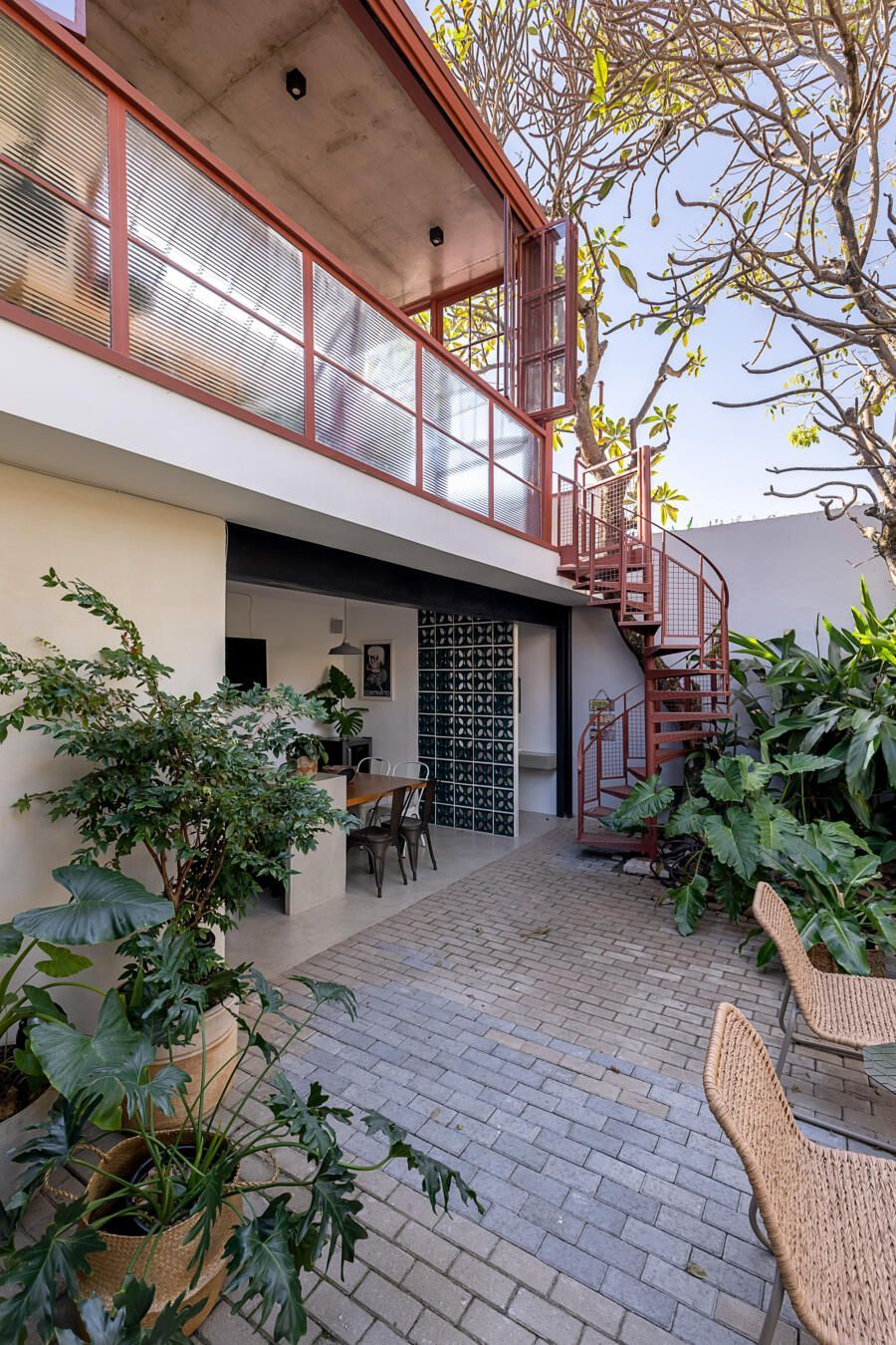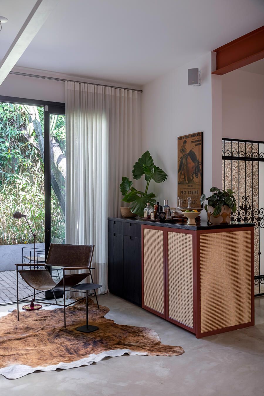 “O ladrilho hidráulico por exemplo, além de lindo, já tinha história para contar, então levamos a cor marsala dele para a estrutura metálica e marcenaria e o tom claro para a parede de fundo do escritório, mantendo a mesma linguagem. Para manter também a rusticidade dos materiais, usamos a laje em concreto aparente. A parede verde, antes abandonada, foi reativada com novas plantas. E para facilitar o cuidado dessas plantas, instalamos uma irrigação automática e ao lado dela, projetamos um canto de leitura e uma pausa no trabalho.”