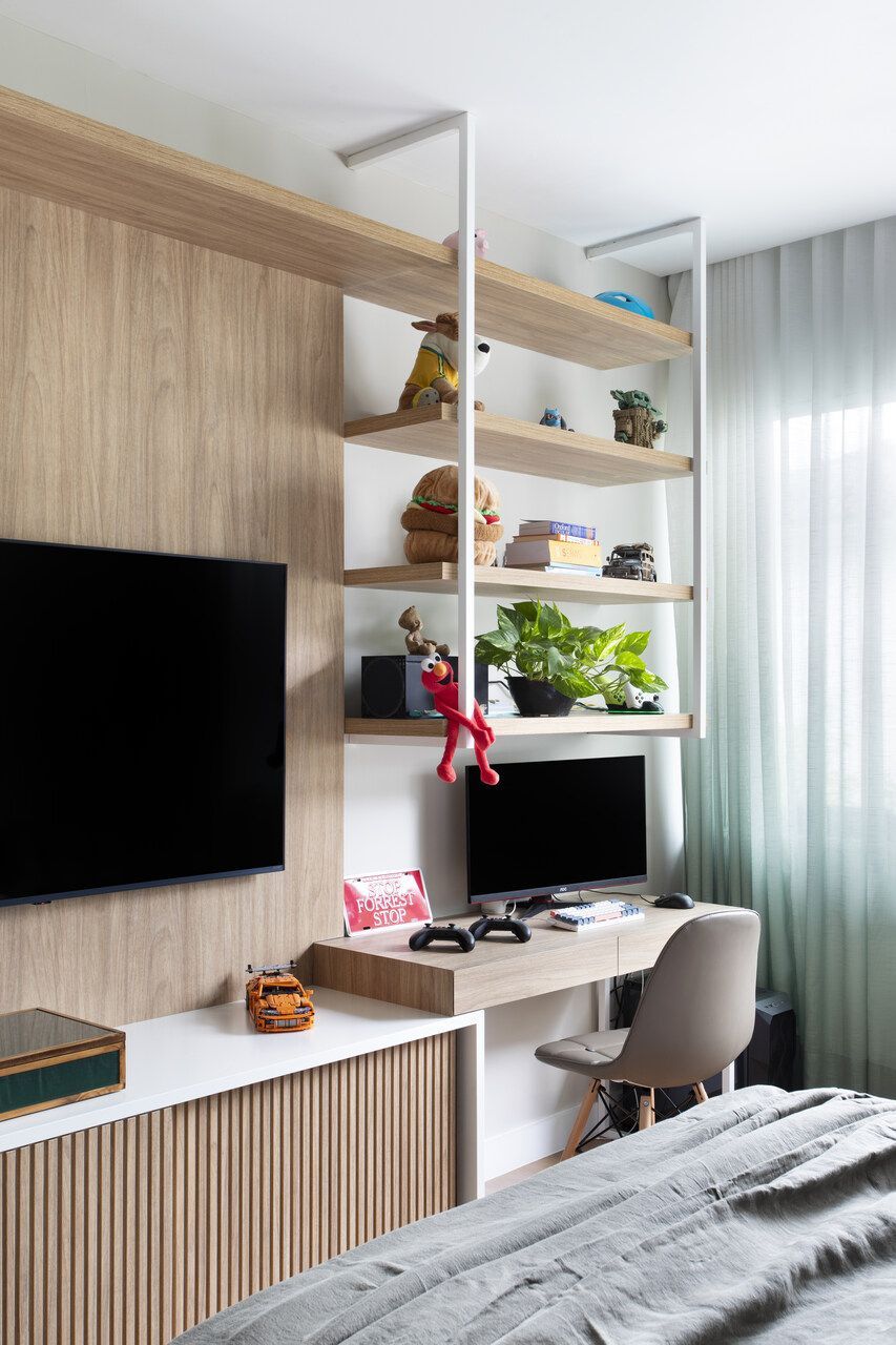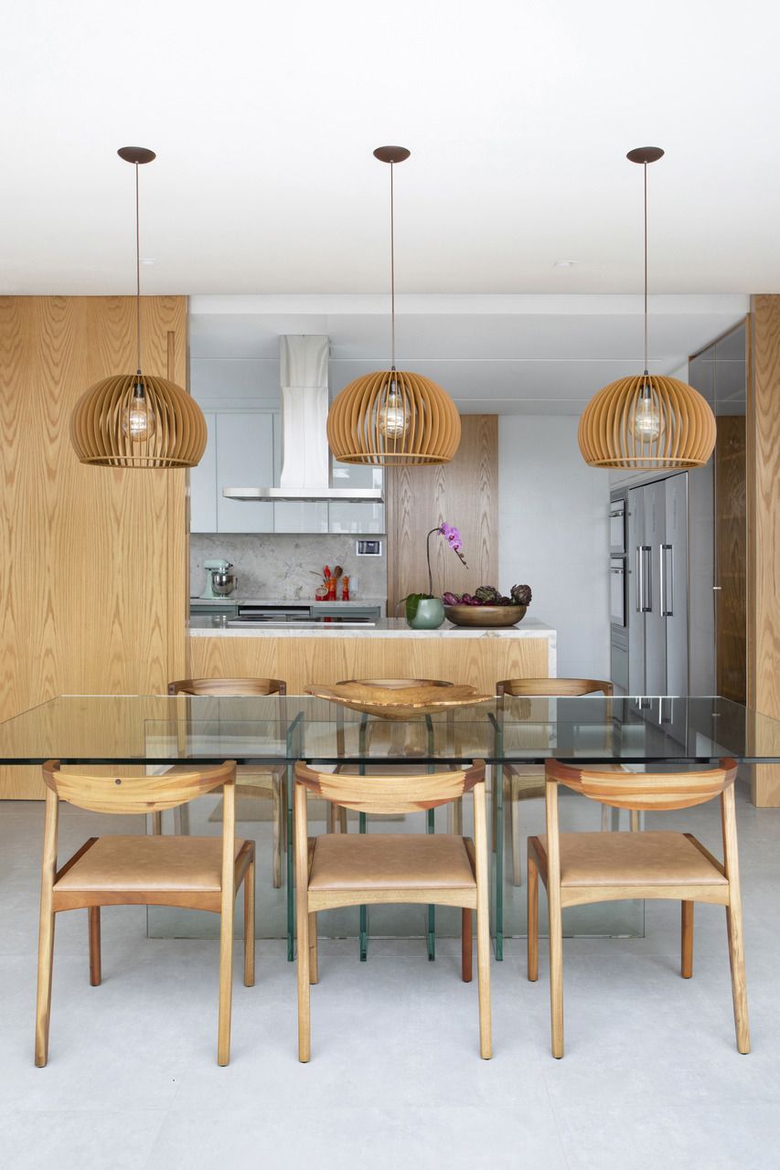 A decoração reflete o estilo de vida da família, combinando peças novas com móveis e objetos trazidos do antigo apartamento, preservando memórias afetivas. A paleta em off-white, a madeira em tom mel e a repetição de materiais entre os ambientes criam uma atmosfera acolhedora e atemporal.