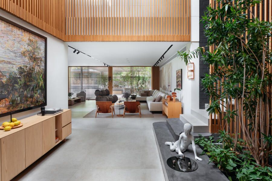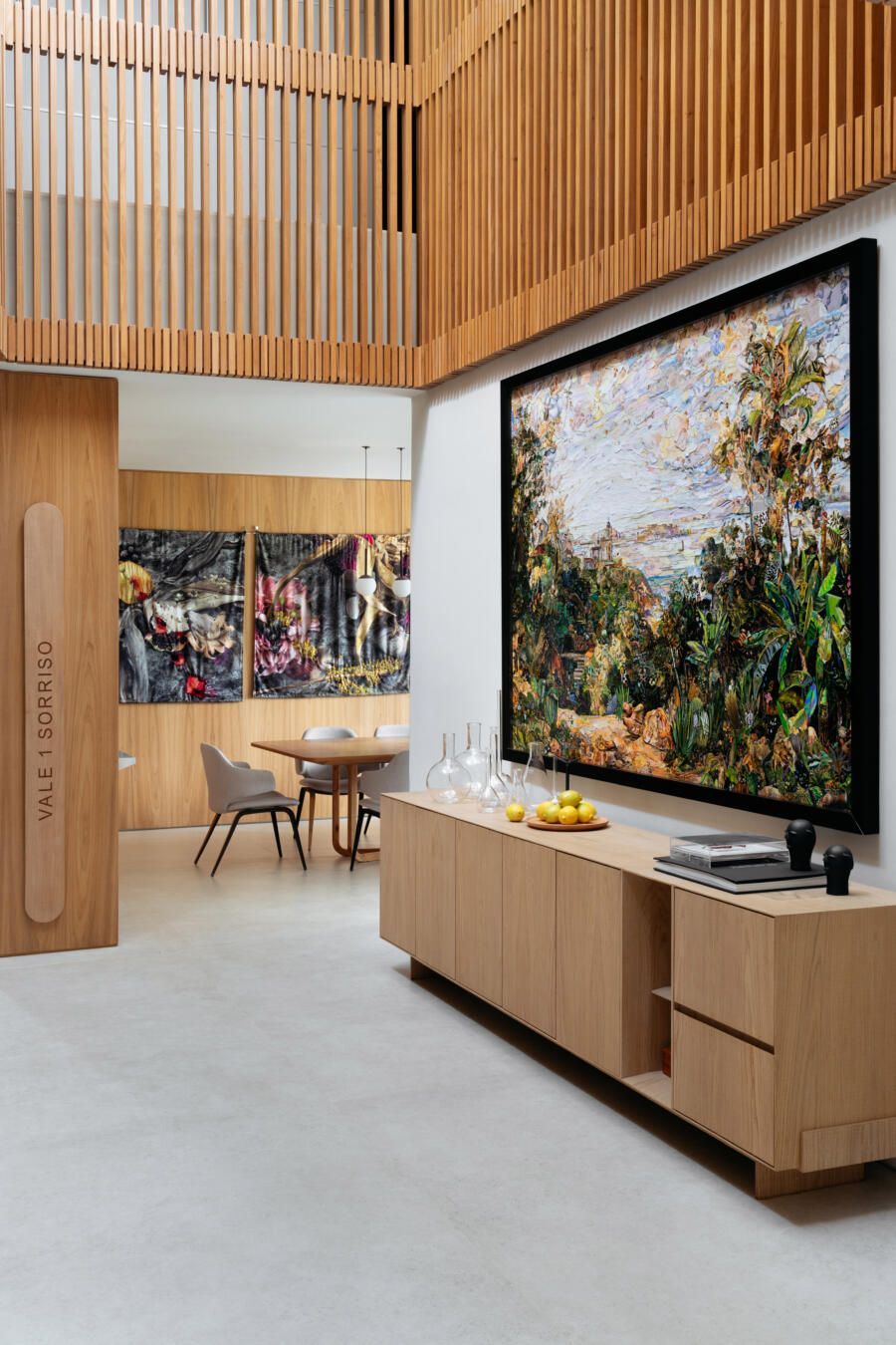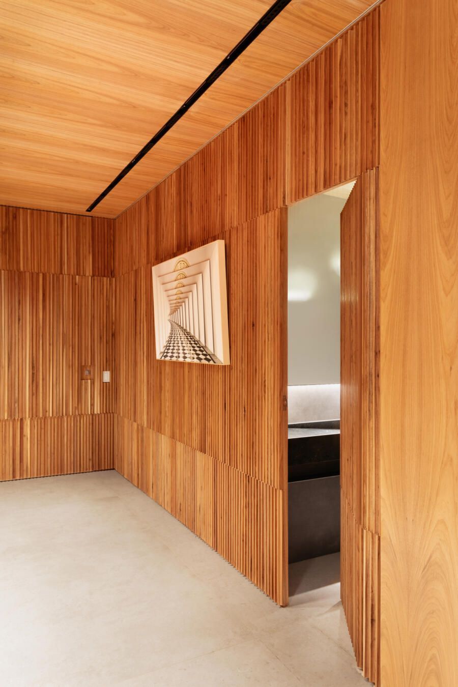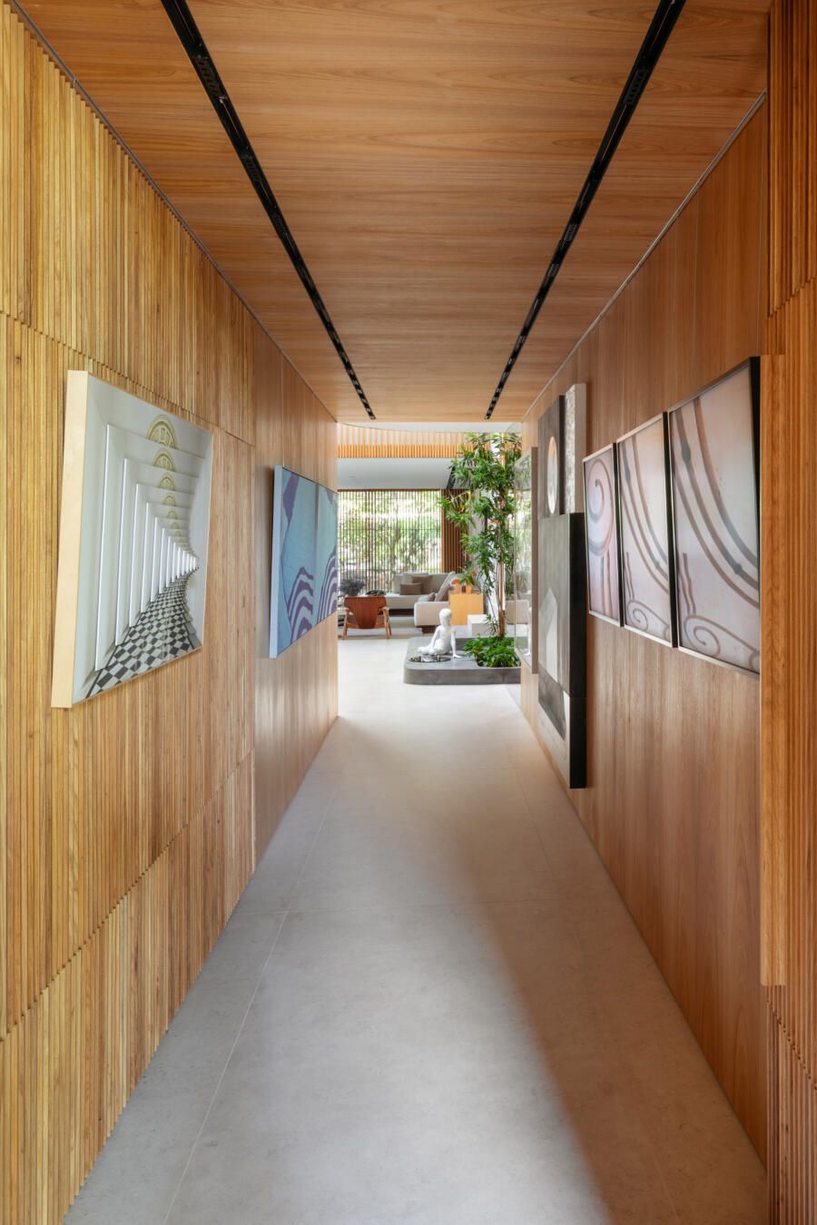 “Este foi, inclusive, o ponto de partida para a definição da galeria na entrada da casa. Criamos um conjunto em marcenaria que perfaz paredes e teto para abrigar parte da coleção de arte dos clientes e utilizamos um detalhe canelado para identificar as portas de entrada, de cozinha e de lavabo.”