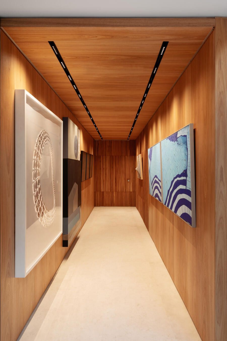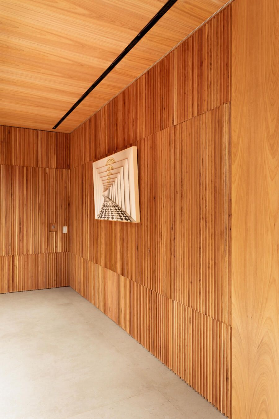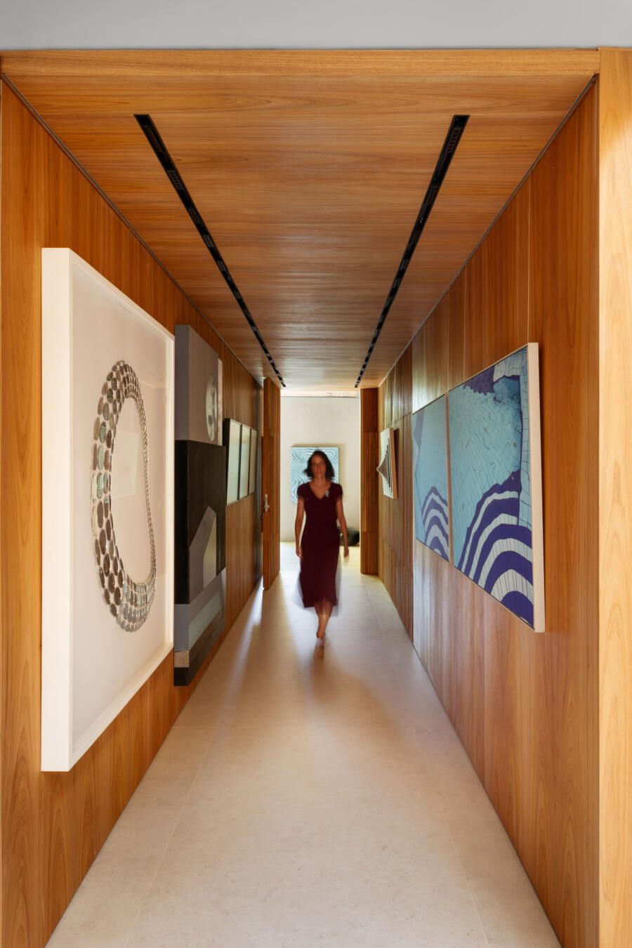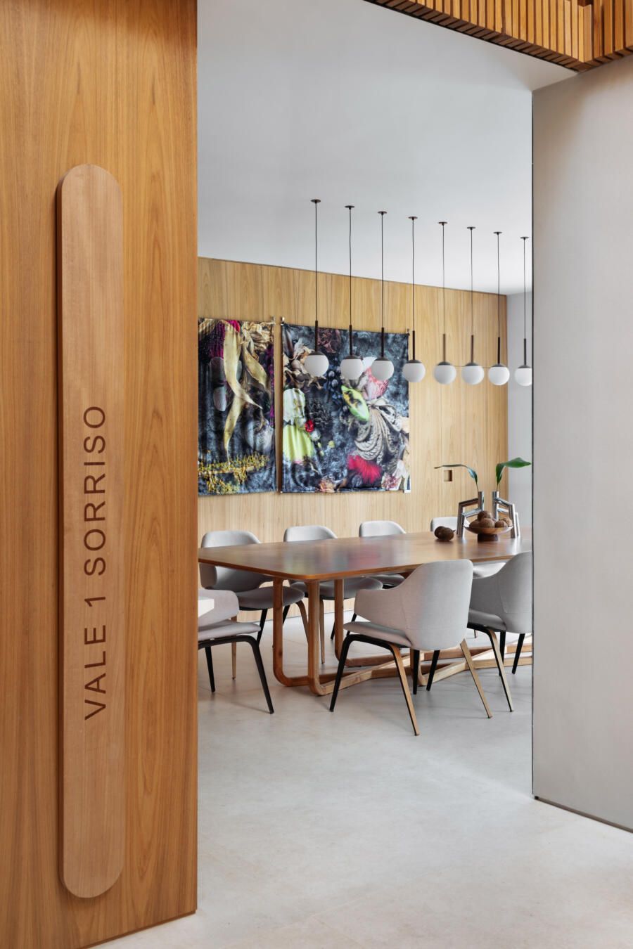 “Este foi, inclusive, o ponto de partida para a definição da galeria na entrada da casa. Criamos um conjunto em marcenaria que perfaz paredes e teto para abrigar parte da coleção de arte dos clientes e utilizamos um detalhe canelado para identificar as portas de entrada, de cozinha e de lavabo.”
