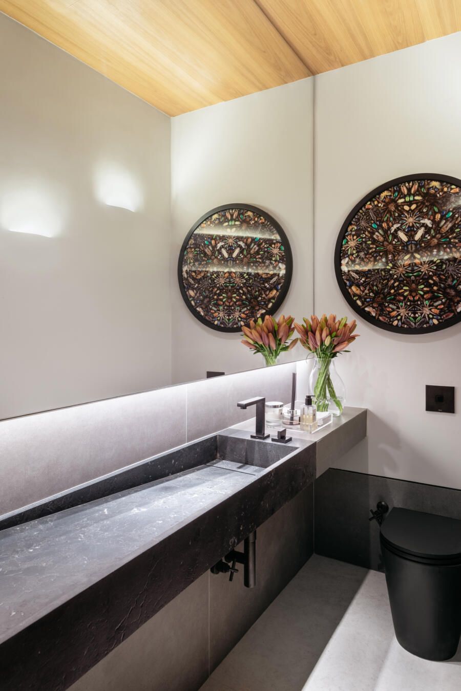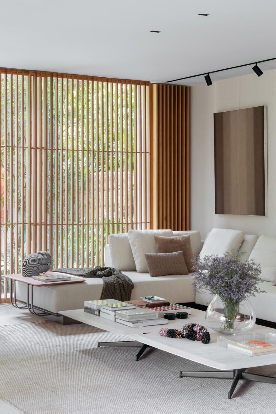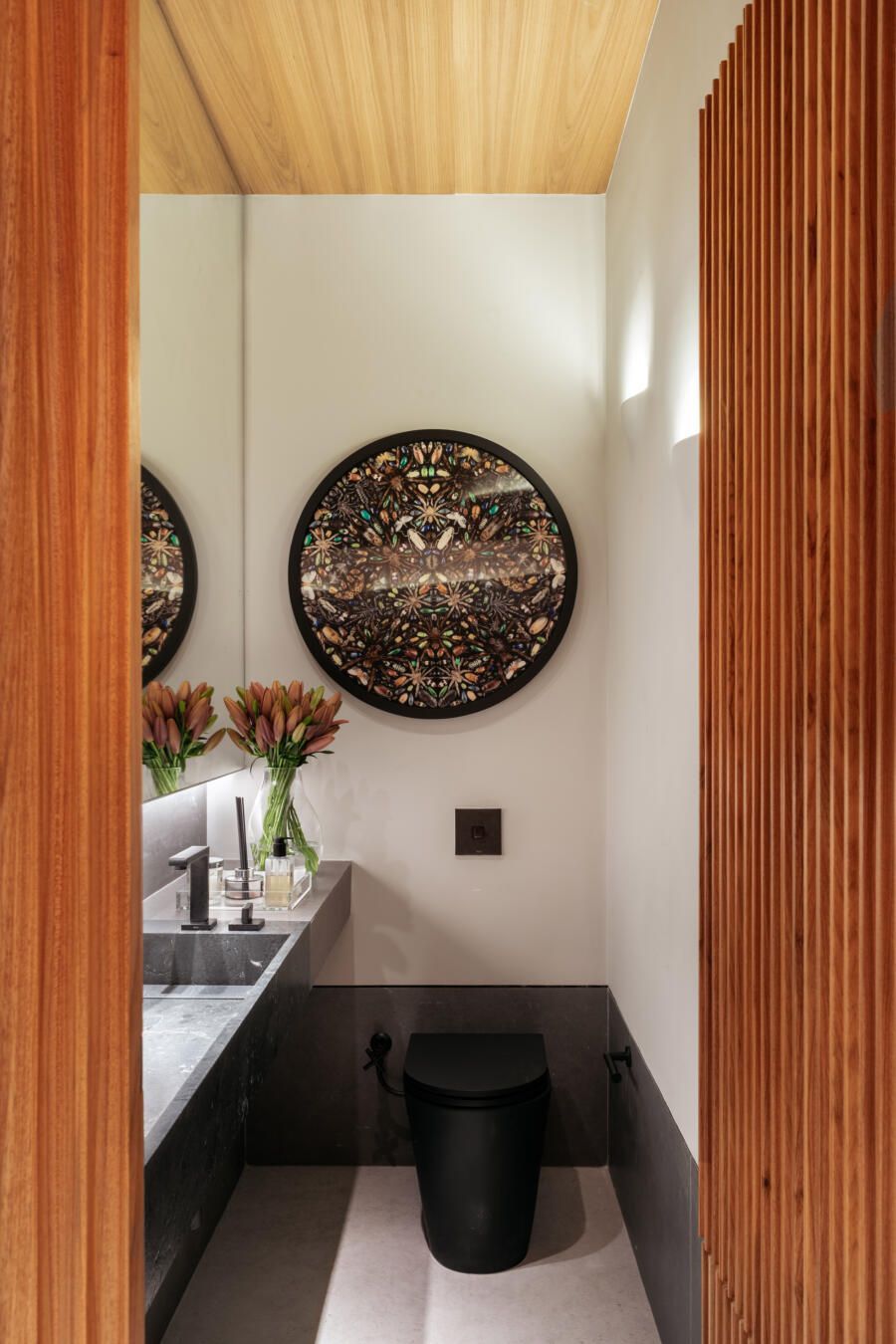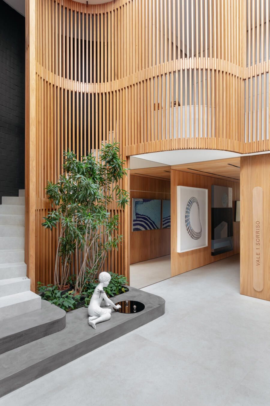 “Este foi, inclusive, o ponto de partida para a definição da galeria na entrada da casa. Criamos um conjunto em marcenaria que perfaz paredes e teto para abrigar parte da coleção de arte dos clientes e utilizamos um detalhe canelado para identificar as portas de entrada, de cozinha e de lavabo.”