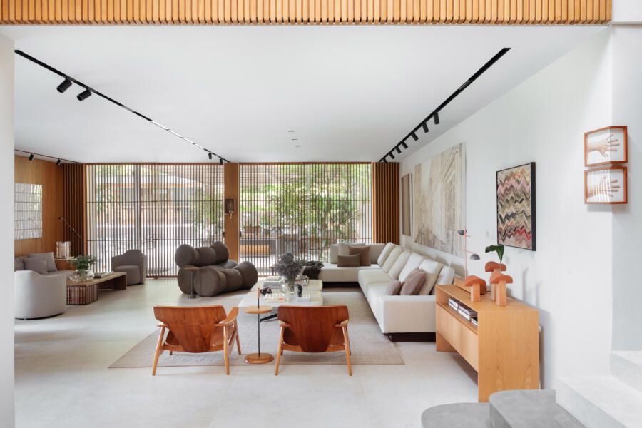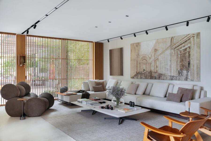 “Eles queriam um projeto que renovasse completamente a casa, em absolutamente área social, do piso aos acabamentos, passando pela iluminação e mobiliários.”