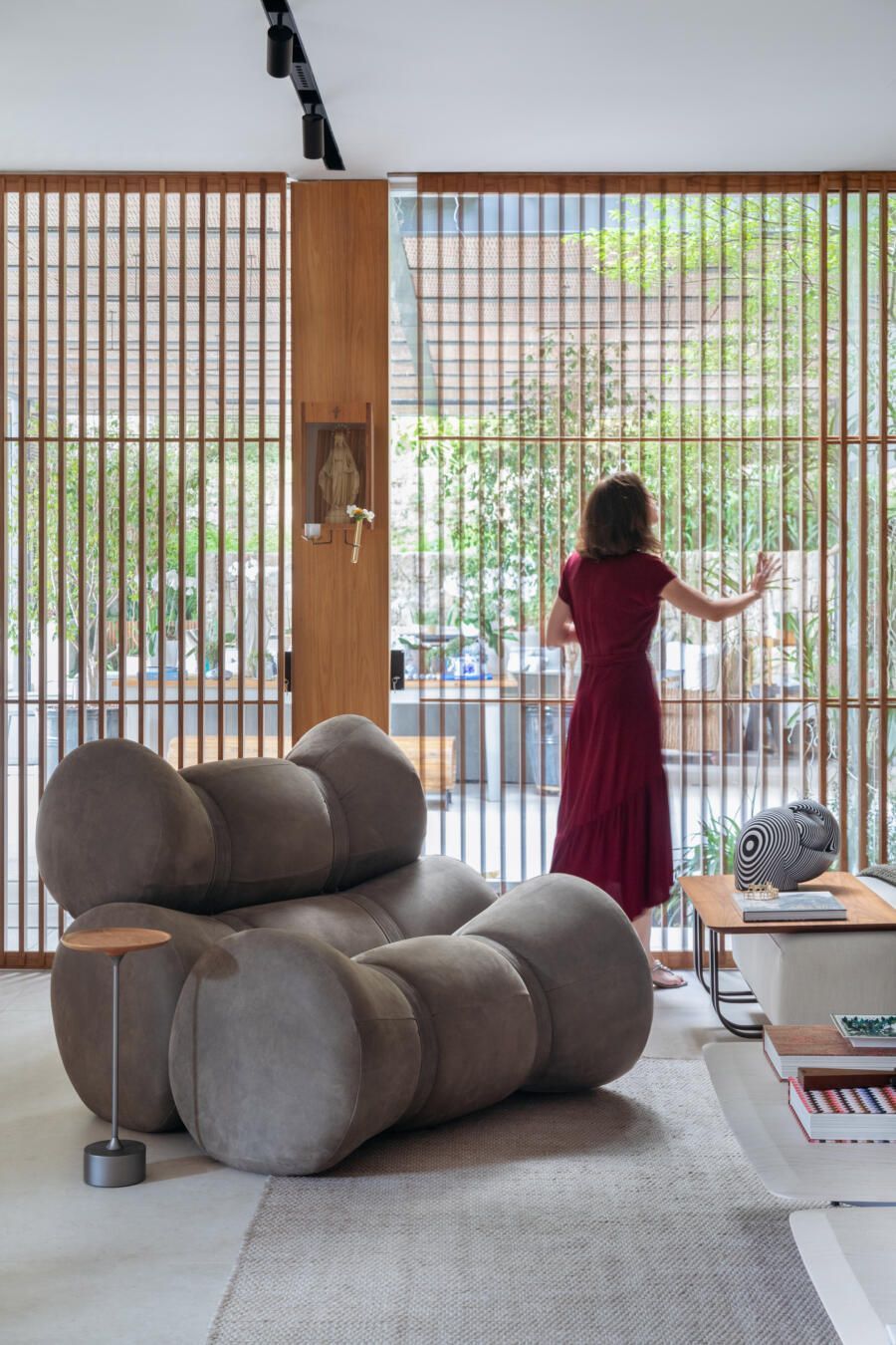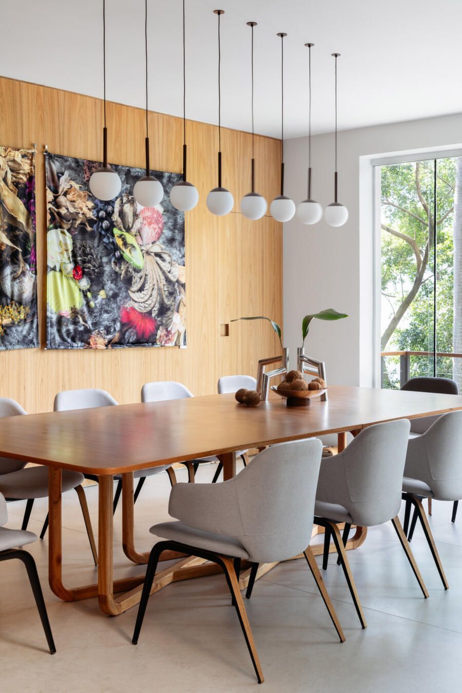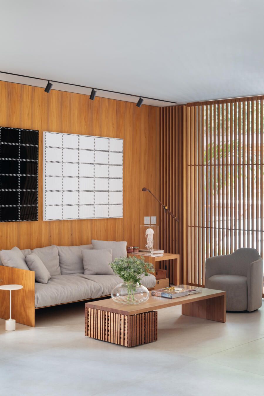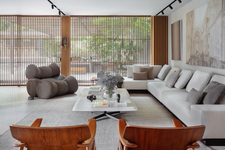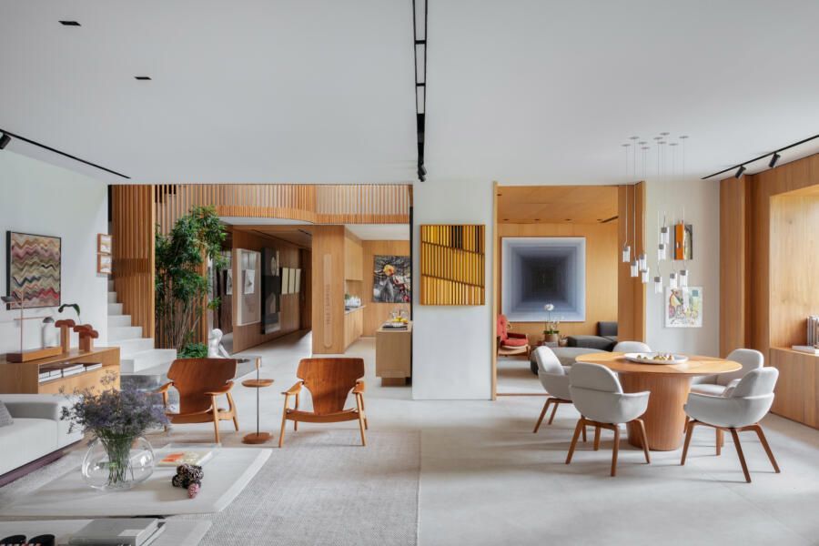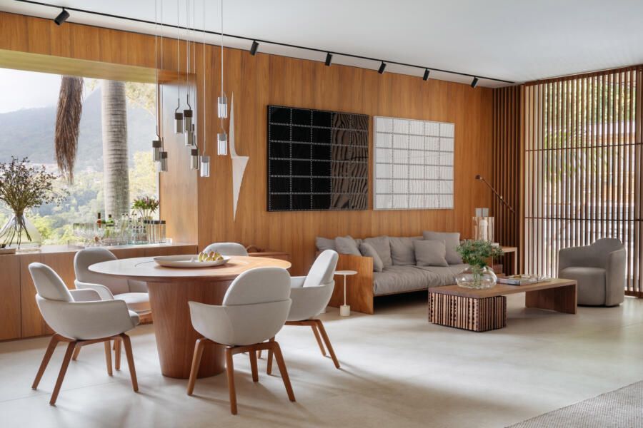 Na decoração, praticamente tudo é novo, com exceção de alguns itens pontuais como a mesa de jantar, duas poltronas Diz de Sergio Rodrigues, um aparador Chan e um sofá Matriz pequeno, ambos de Jader Almeida. Já as obras de arte são todas do acervo dos clientes, incluindo criações de Abraham Palatnik, Vik Muniz, Daniel Senise, Angelo Venosa, Mariana Palma, Gisele Camargo, Juan Parada, Maritza Caneca, Debora Engel, Miguel Rio Branco, Celina Portella, Ascanio, Nelson Leirner, Hildebrando de Castro, José Patricio, Ianelli e Todd and fitch (franceses).