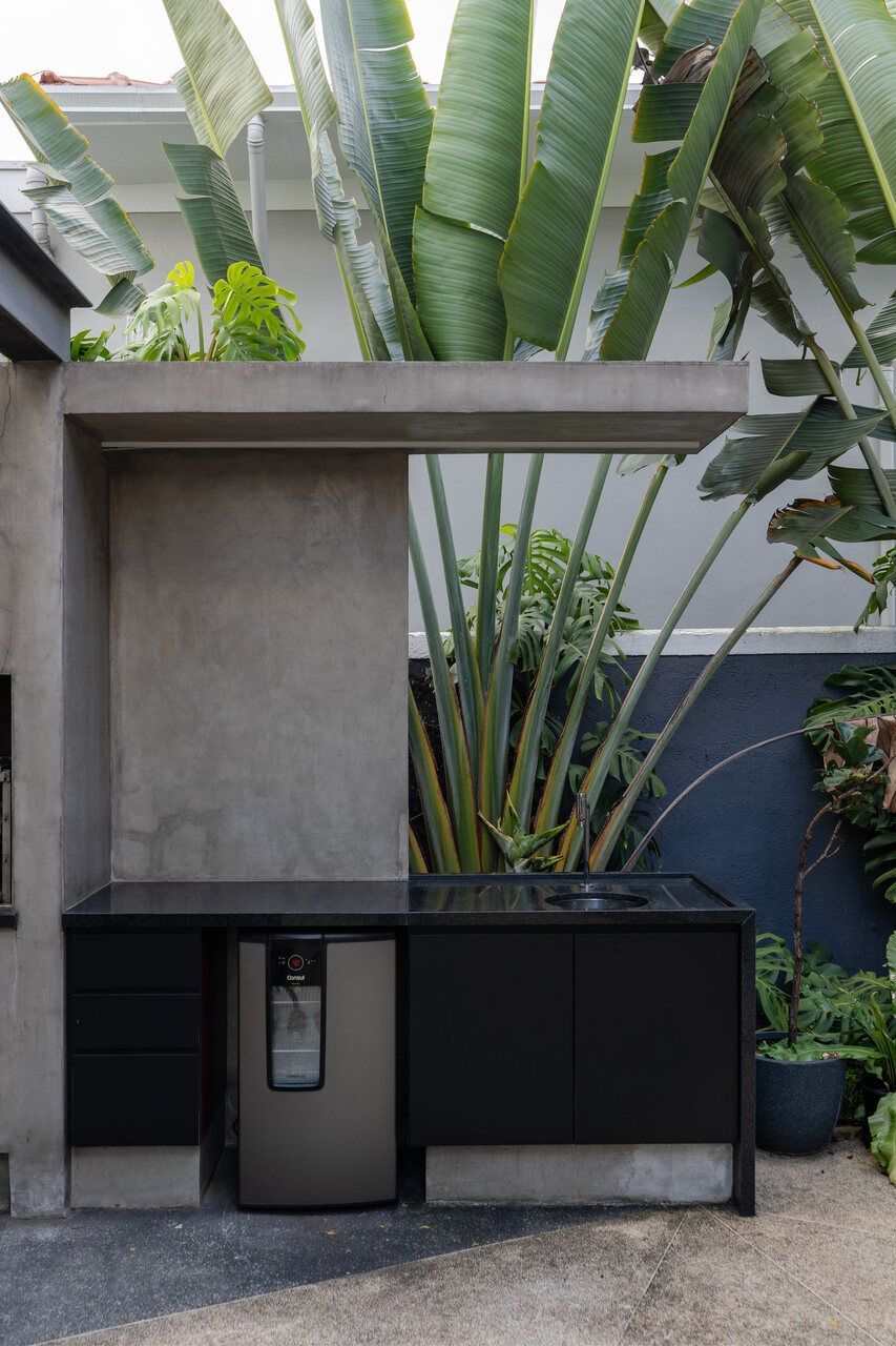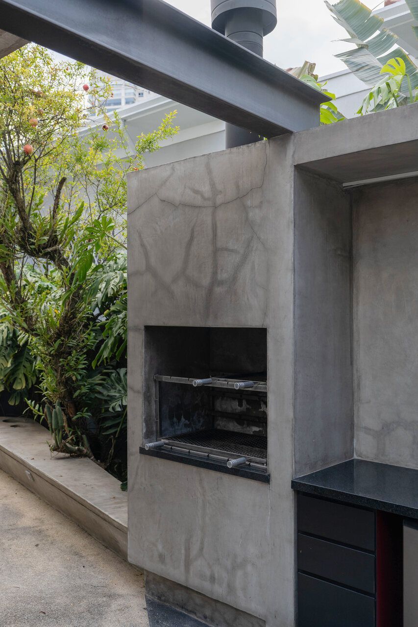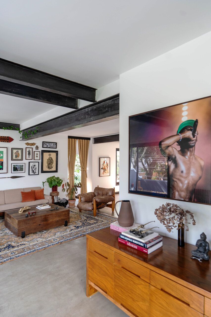 Cimento queimado, madeira Cumaru e caixilhos pretos compõem a paleta neutra, que funciona como moldura para o acervo do morador. A poltrona Mole de Sergio Rodrigues, obras autorais, peças de artistas amigos e garimpos de viagem transformam os ambientes em capítulos de uma narrativa pessoal, onde arquitetura e arte se encontram em harmonia.