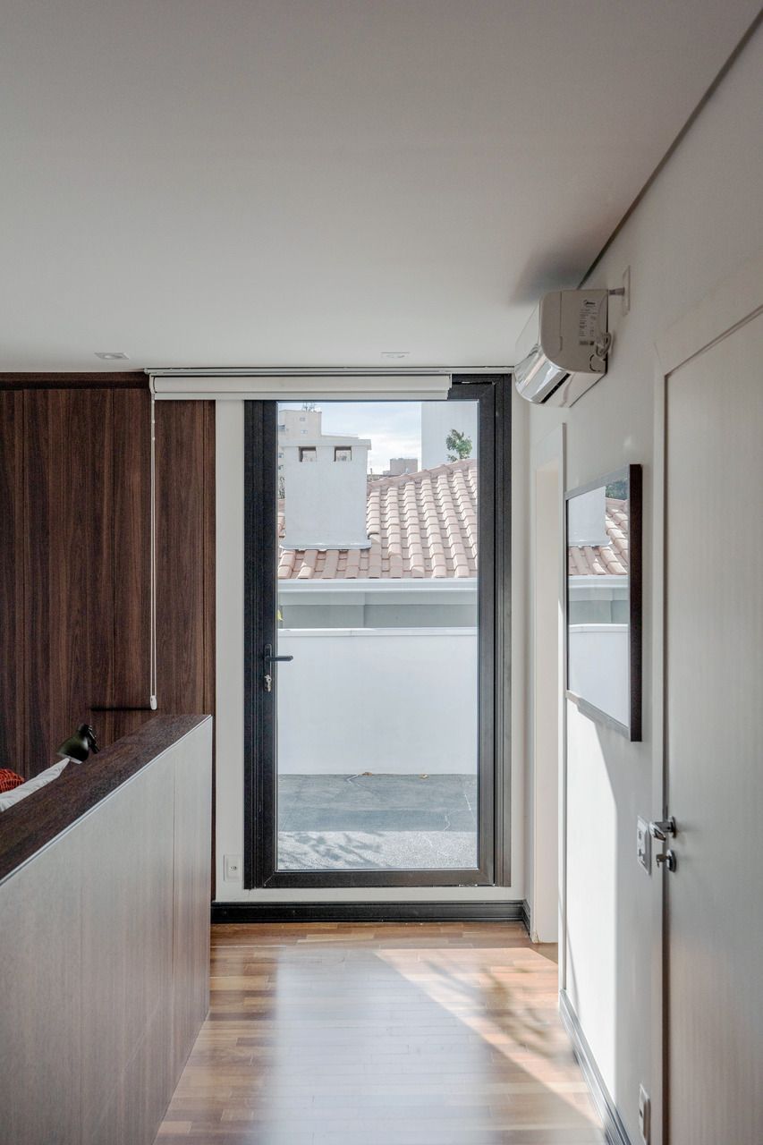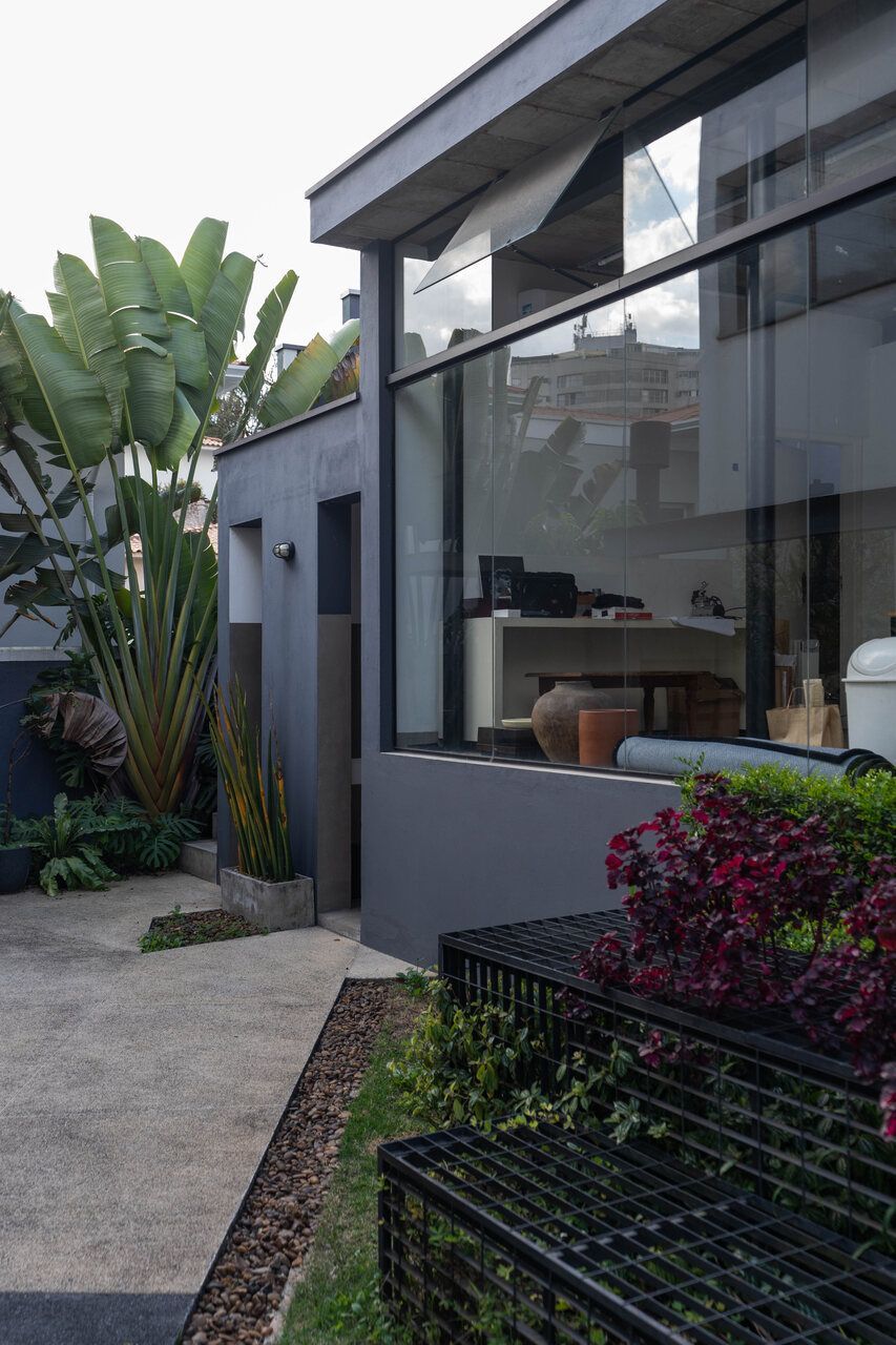 Grandes janelas rasgadas nas fachadas e estruturas metálicas aparentes revelam a força da intervenção, enquanto a ventilação cruzada e os jardins criam uma atmosfera de leveza. A cada passo, a arquitetura convida o exterior a entrar: no térreo, salas se conectam em fluidez com a cozinha e o jardim, no atelier envidraçado, a luz natural dita o ritmo do trabalho criativo, e no andar superior, a suíte principal se abre para o horizonte verde.