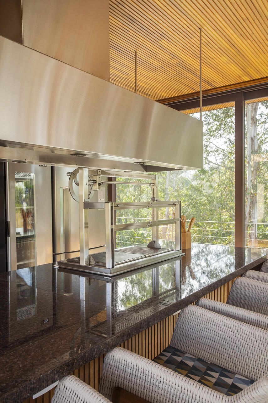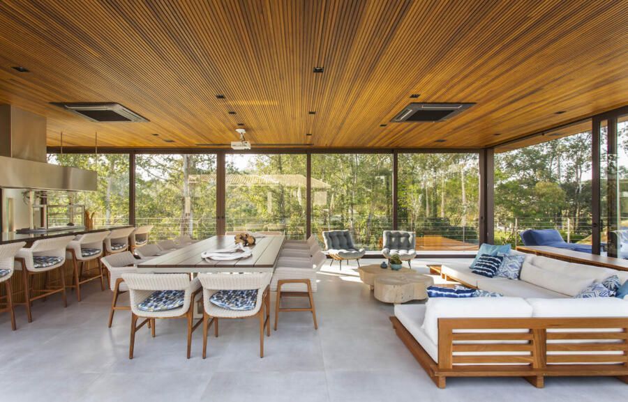 “A casa fica em um município no interior de São Paulo e por possuir uma grande metragem nada podia ficar de fora do planejamento. Mas também não tiveram problema de aproveitar o espaço para construir o anexo de lazer que antes não existia. Para isso, as arquitetas escolheram uma área estratégica e com terreno limpo, o anexo possui tanto uma vista para a mata quanto para um lago próximo. A parte superior foi toda revestida de vidro na intenção de camuflar a edificação entre as árvores.”