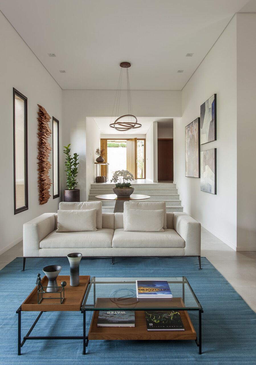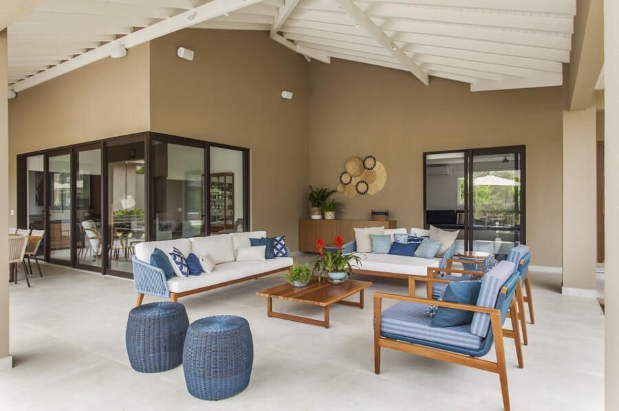 No décor, o pé-direito alto do living torna o ambiente perfeito para caprichar no uso de obras de artes. Além disso, o tamanho generoso da casa de campo permitiu mesclar estilos que giram em torno do rústico e contemporâneo, com o uso de materiais naturais e cores vivas.