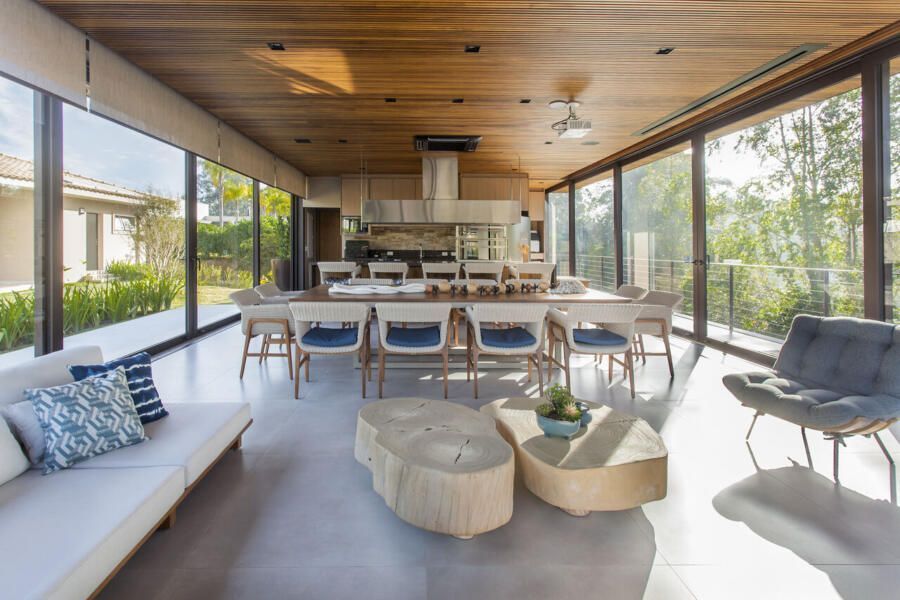 Sobre o layout da casa principal, a integração de ambientes criou fluidez e amplitude, como explicam os arquitetos: