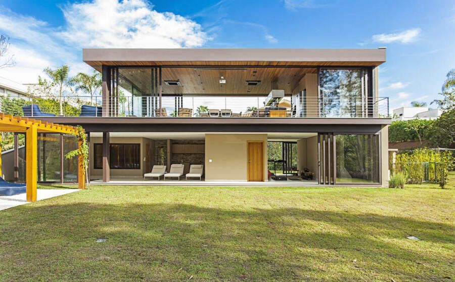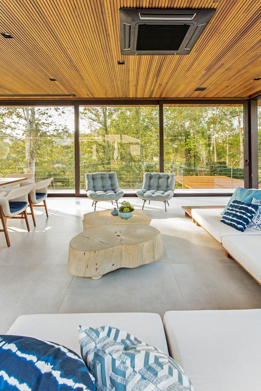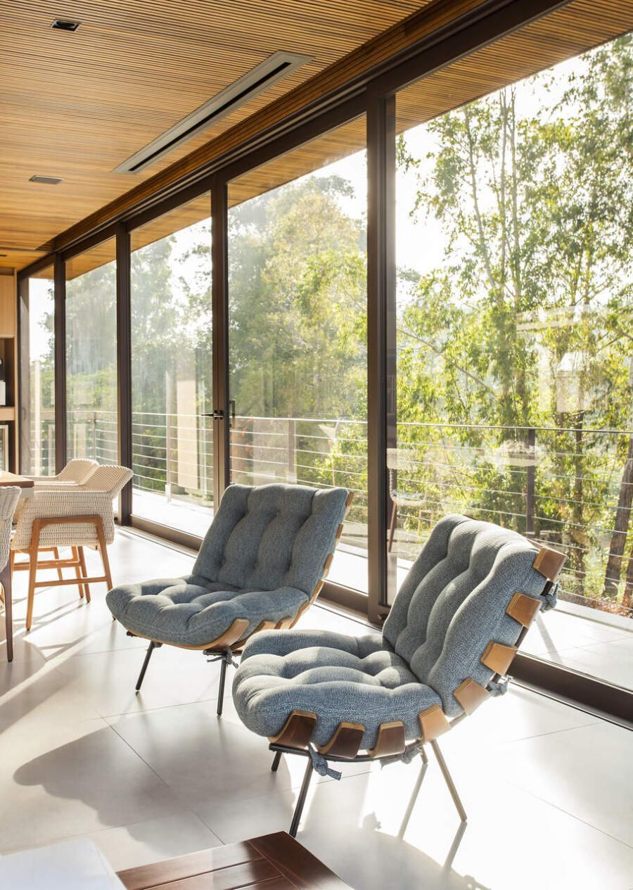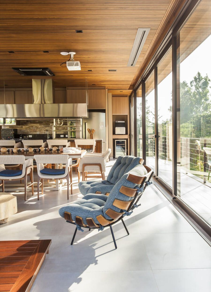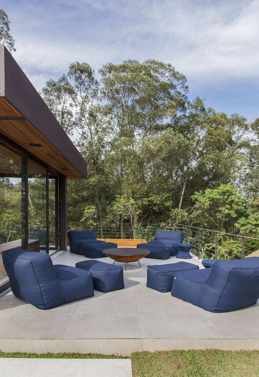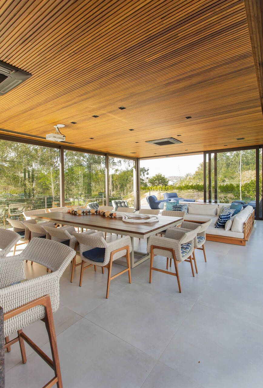 “A casa fica em um município no interior de São Paulo e por possuir uma grande metragem nada podia ficar de fora do planejamento. Mas também não tiveram problema de aproveitar o espaço para construir o anexo de lazer que antes não existia. Para isso, as arquitetas escolheram uma área estratégica e com terreno limpo, o anexo possui tanto uma vista para a mata quanto para um lago próximo. A parte superior foi toda revestida de vidro na intenção de camuflar a edificação entre as árvores.”