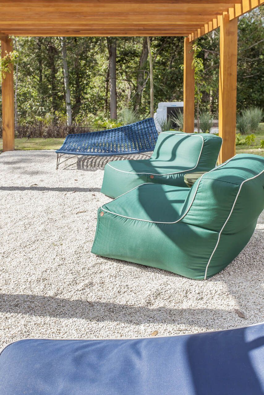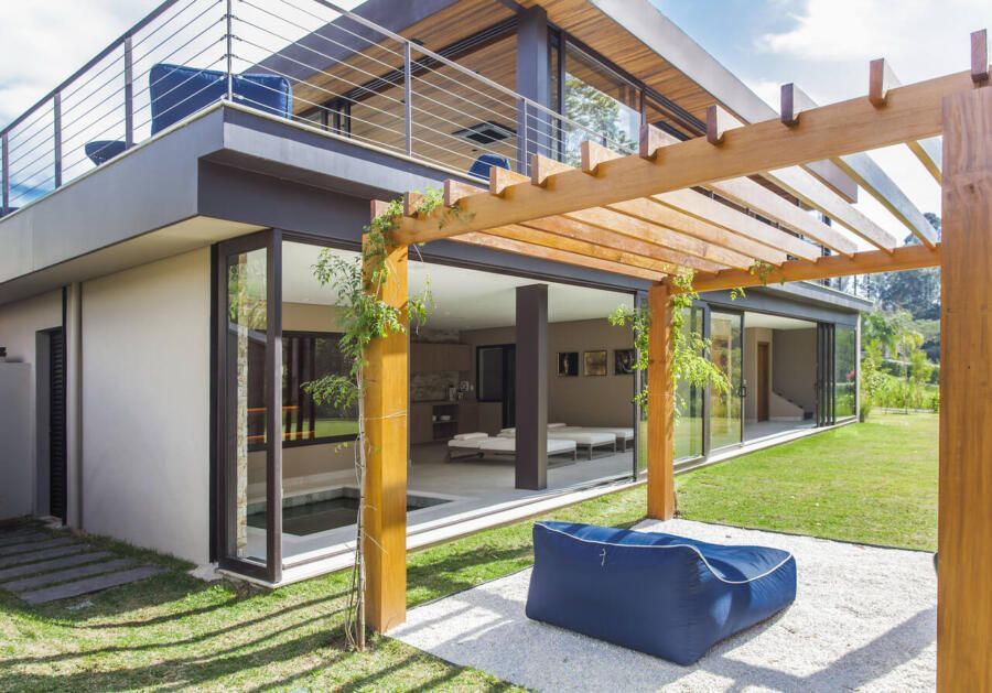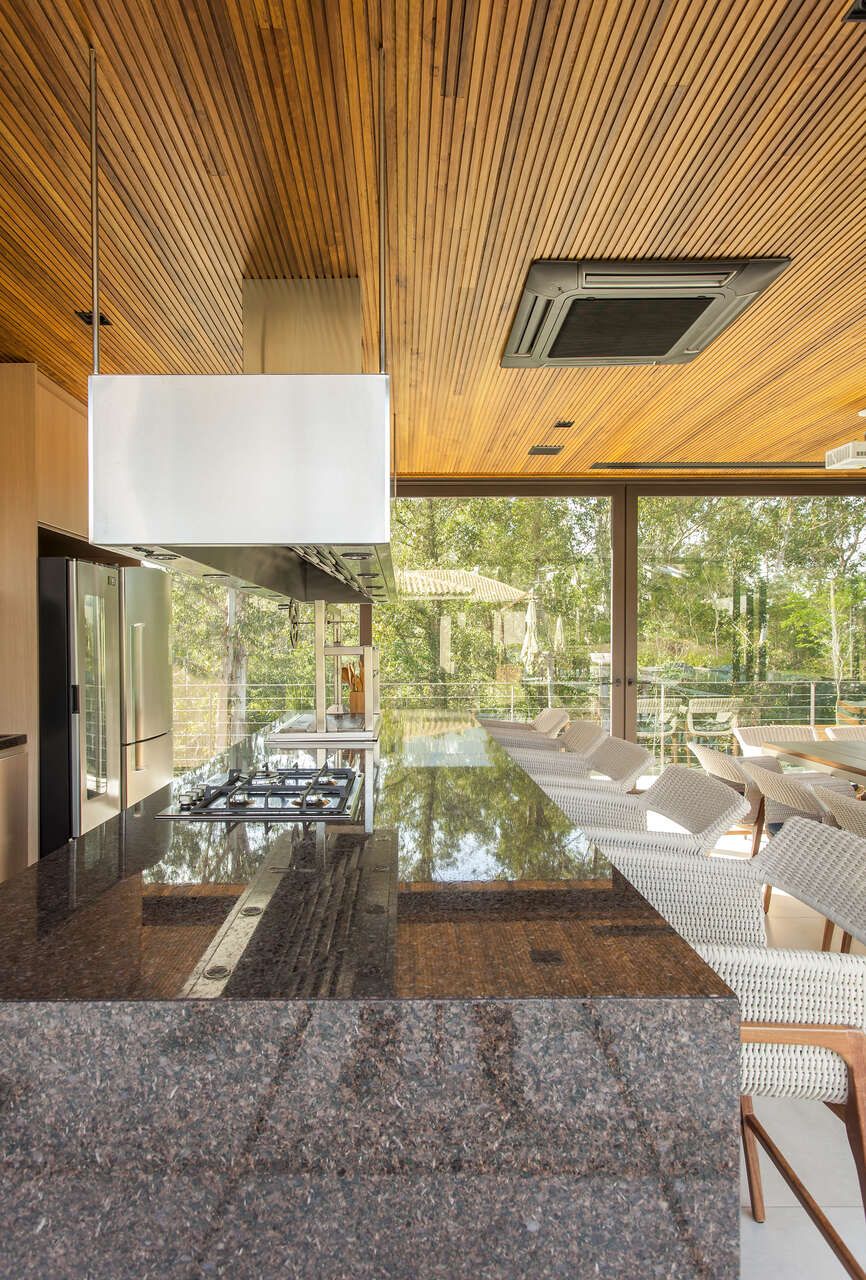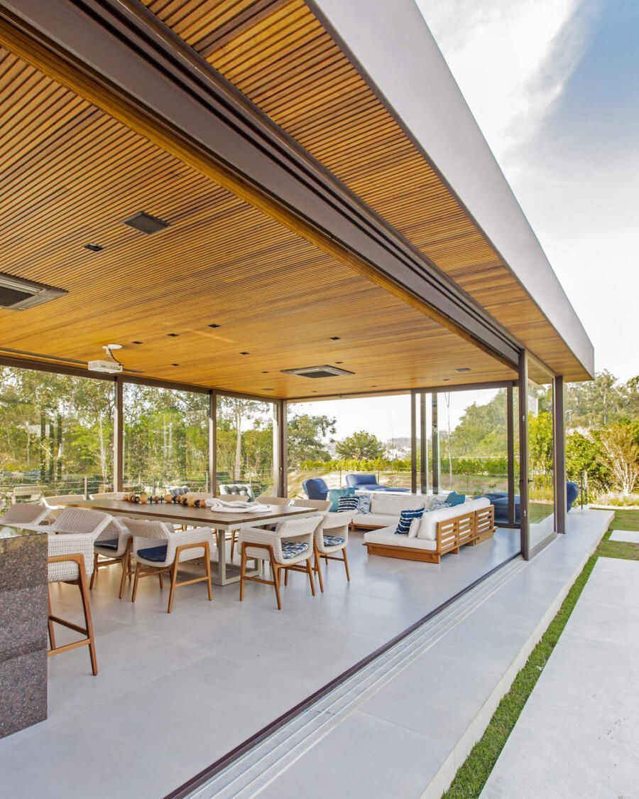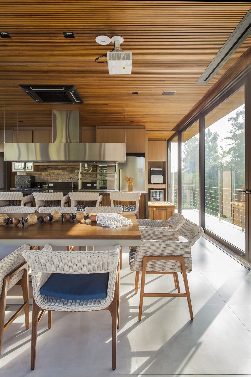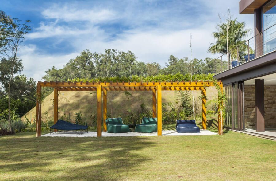 “A casa fica em um município no interior de São Paulo e por possuir uma grande metragem nada podia ficar de fora do planejamento. Mas também não tiveram problema de aproveitar o espaço para construir o anexo de lazer que antes não existia. Para isso, as arquitetas escolheram uma área estratégica e com terreno limpo, o anexo possui tanto uma vista para a mata quanto para um lago próximo. A parte superior foi toda revestida de vidro na intenção de camuflar a edificação entre as árvores.”