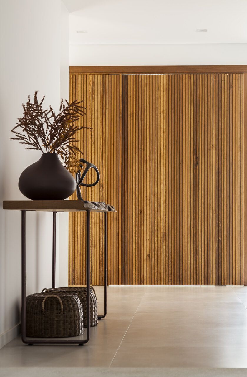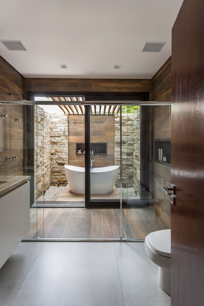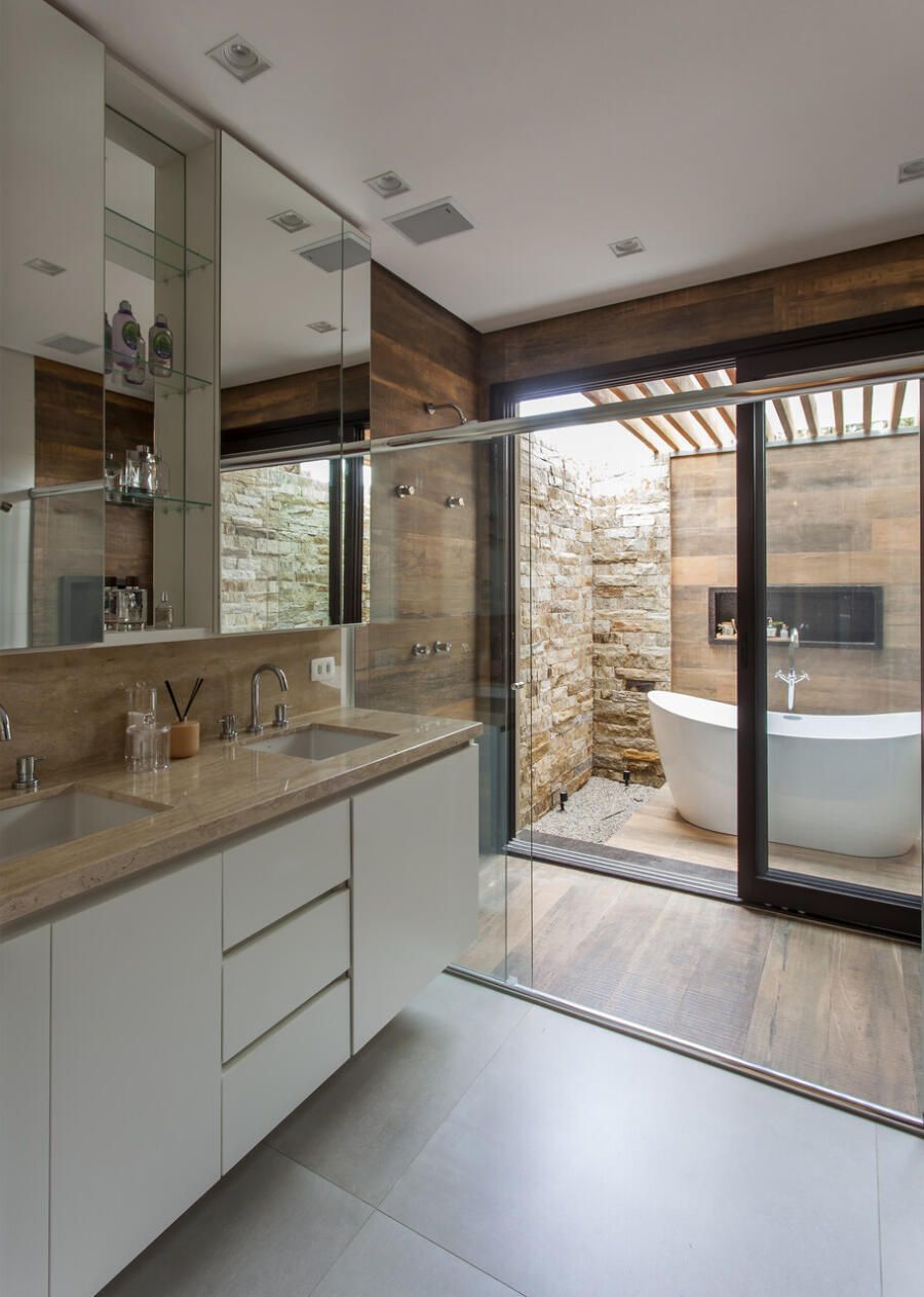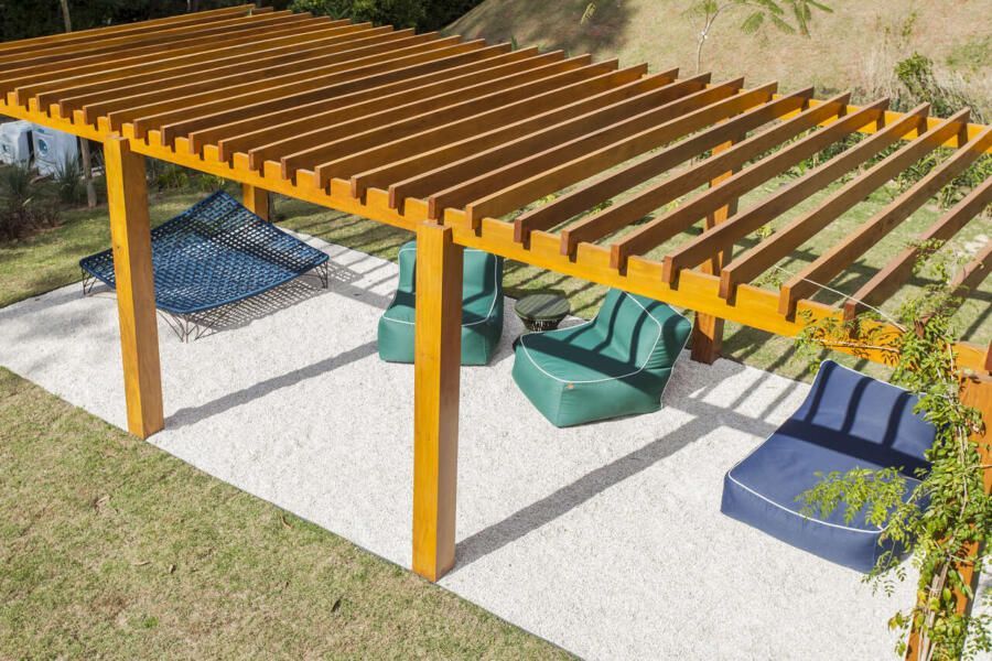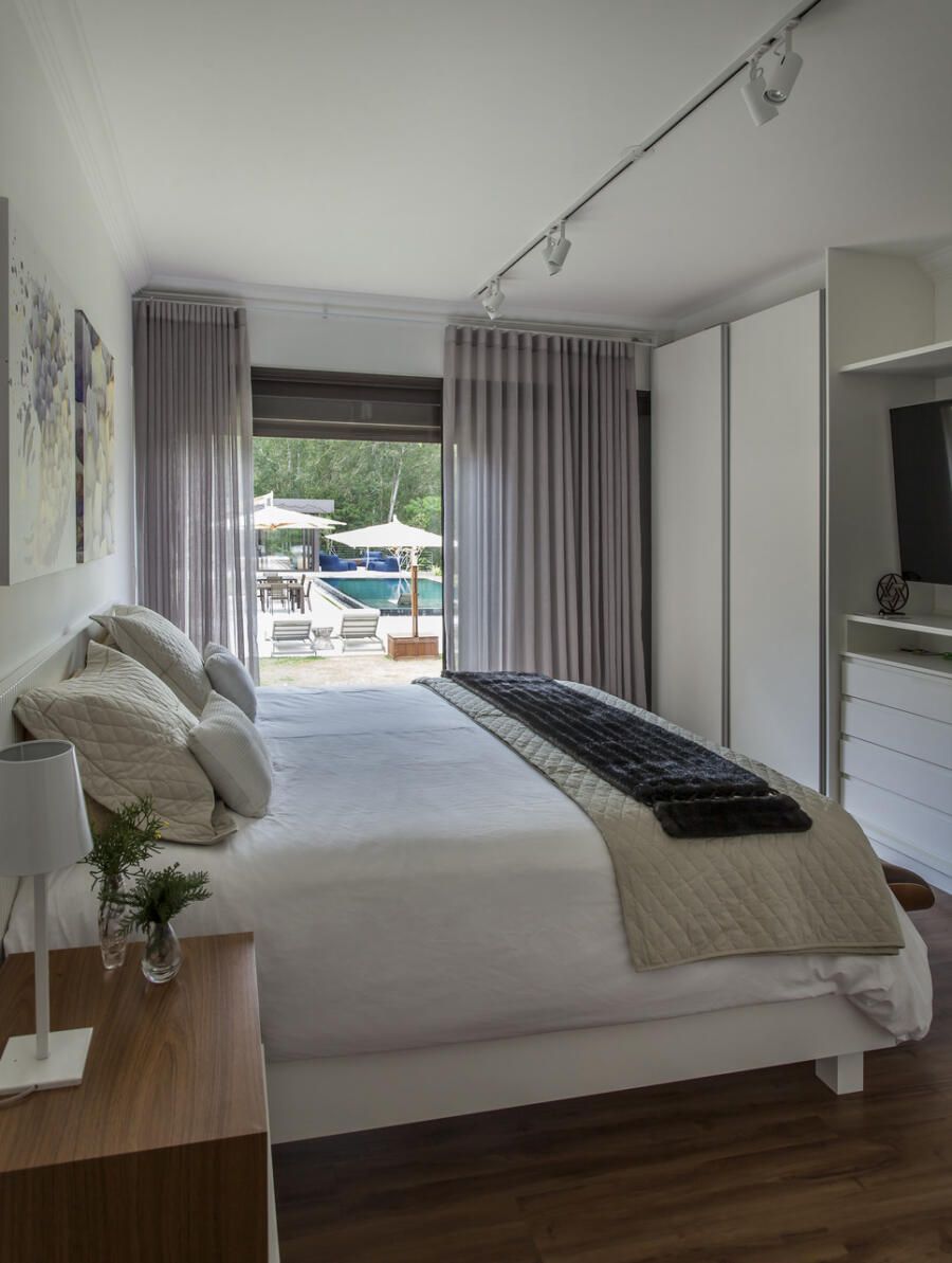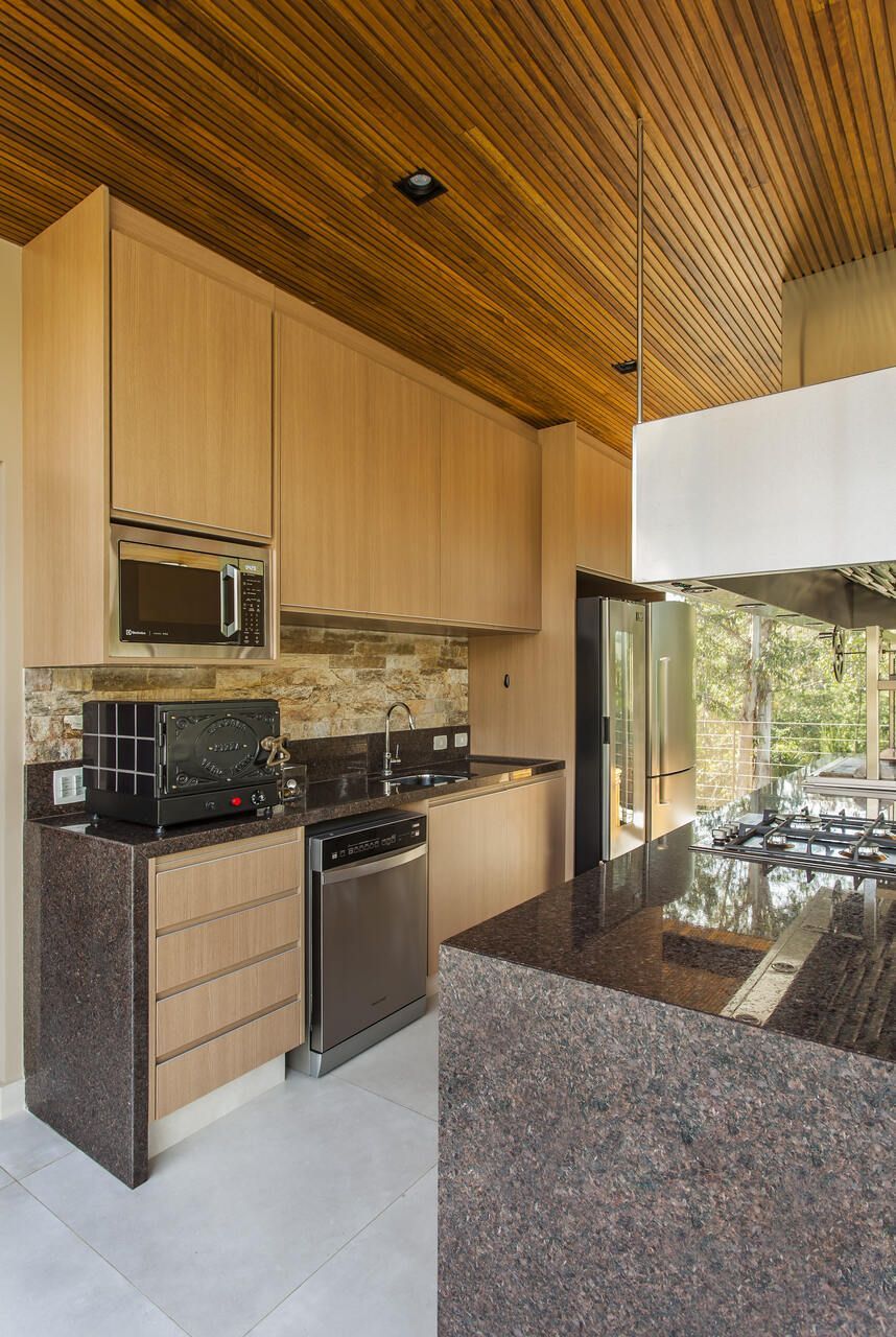 “A casa fica em um município no interior de São Paulo e por possuir uma grande metragem nada podia ficar de fora do planejamento. Mas também não tiveram problema de aproveitar o espaço para construir o anexo de lazer que antes não existia. Para isso, as arquitetas escolheram uma área estratégica e com terreno limpo, o anexo possui tanto uma vista para a mata quanto para um lago próximo. A parte superior foi toda revestida de vidro na intenção de camuflar a edificação entre as árvores.”