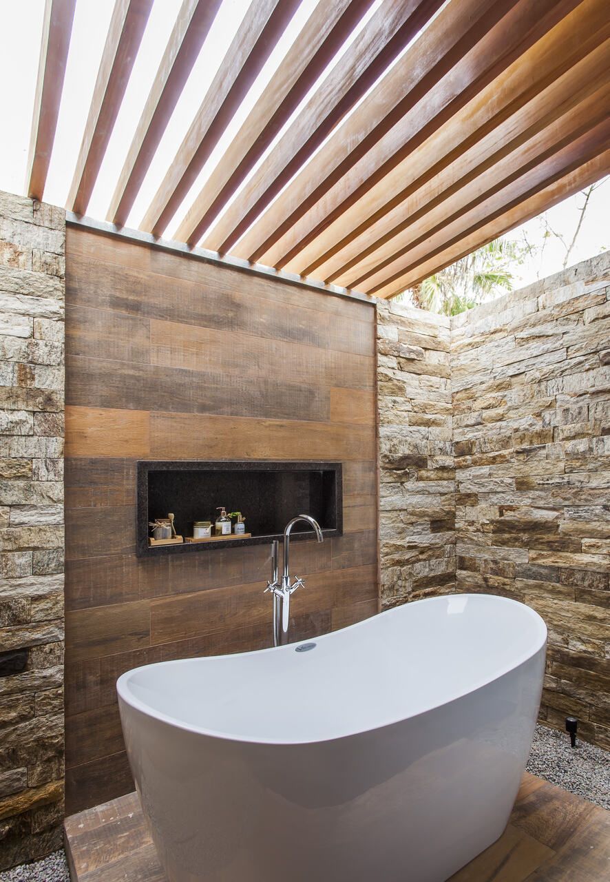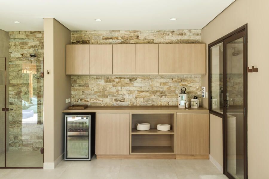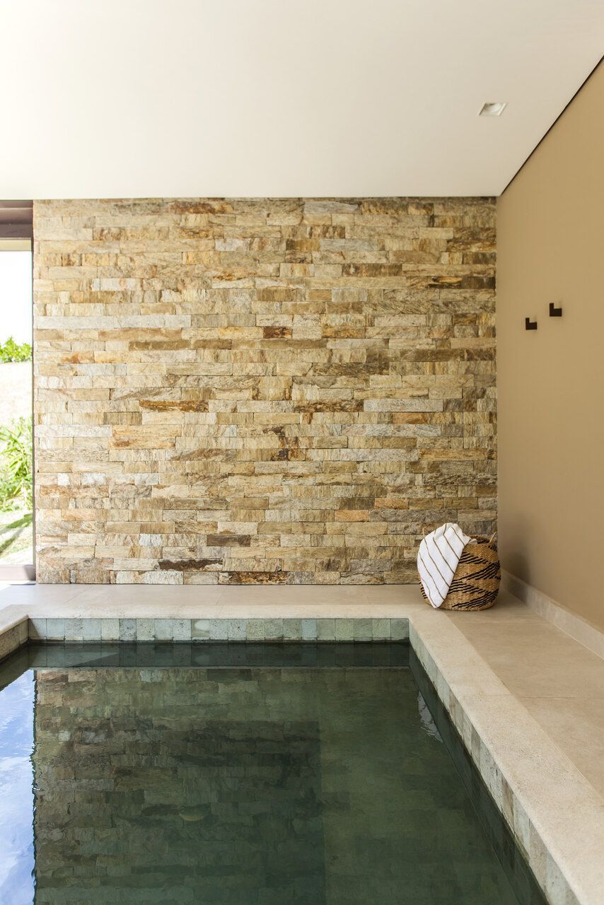 Muitos materiais locais foram aproveitados para revestimento, como o uso da pedra madeira, típica de Itu, na parede da piscina, do spa e do banheiro da suíte. Essa escolha trouxe um quê de rústico e aconchegante ao projeto.