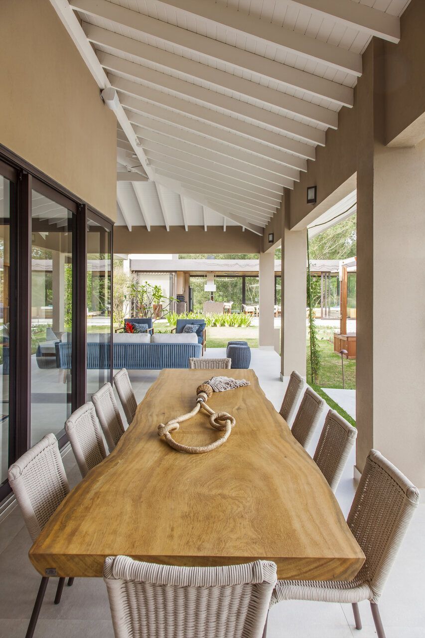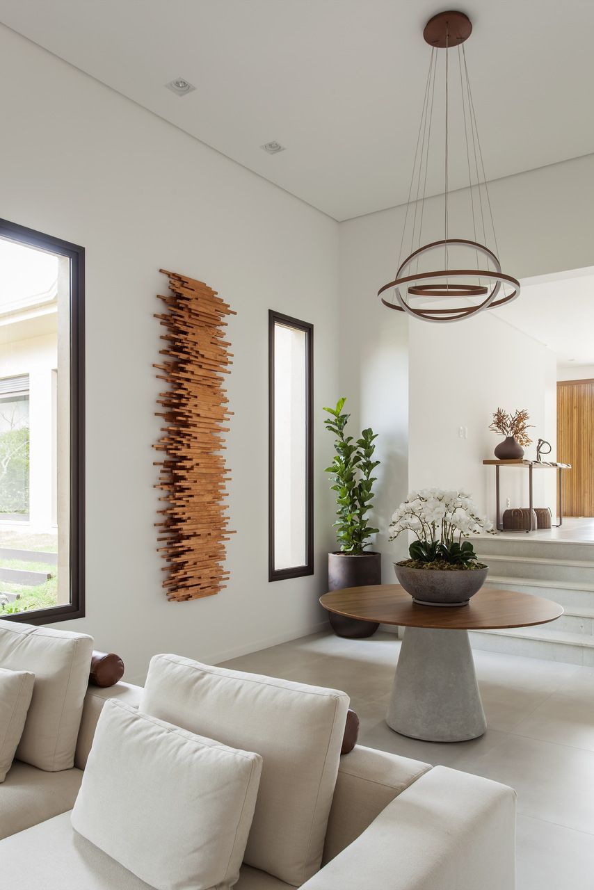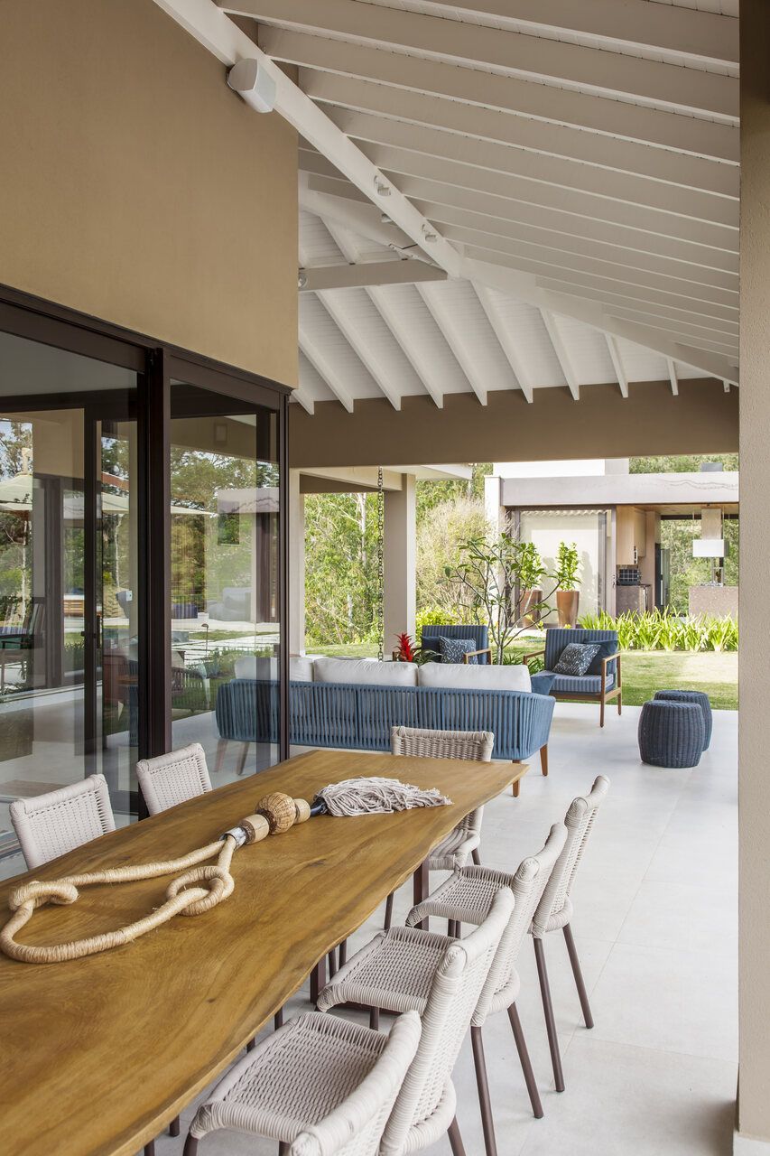 No décor, o pé-direito alto do living torna o ambiente perfeito para caprichar no uso de obras de artes. Além disso, o tamanho generoso da casa de campo permitiu mesclar estilos que giram em torno do rústico e contemporâneo, com o uso de materiais naturais e cores vivas.