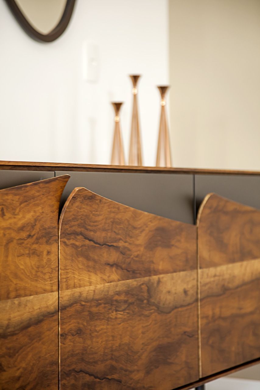 “Uma dica e tendência atual é a integração de ambientes, pois reforça amplitude e permite maior convivência entre as pessoas. Através desse conceito, retiramos a parede onde terminava a casa e a expandimos, o que permitiu ter uma sala de televisão e uma saída melhor para o anexo de lazer. Para aproveitar a coluna, propusemos uma lareira escultural com base de alvenaria e recoberta com granito apicoado. Esse elemento será bem utilizado nas noites de inverno e foi encaixado abaixo da TV.”