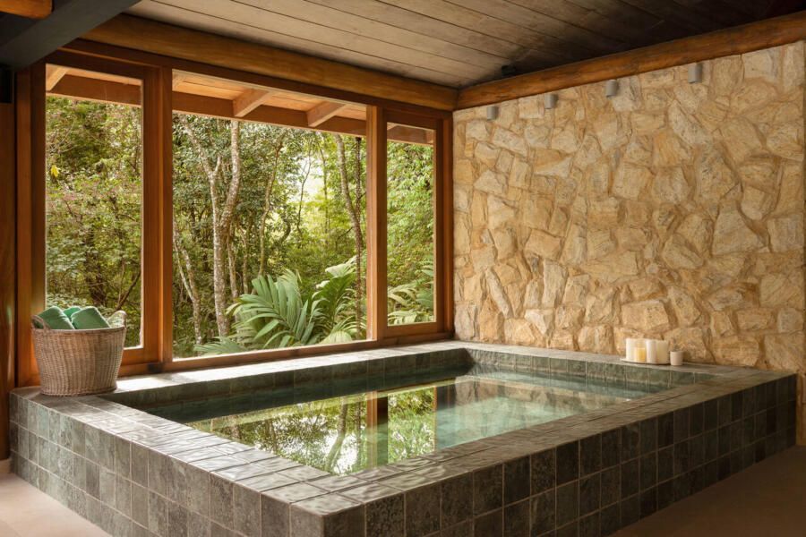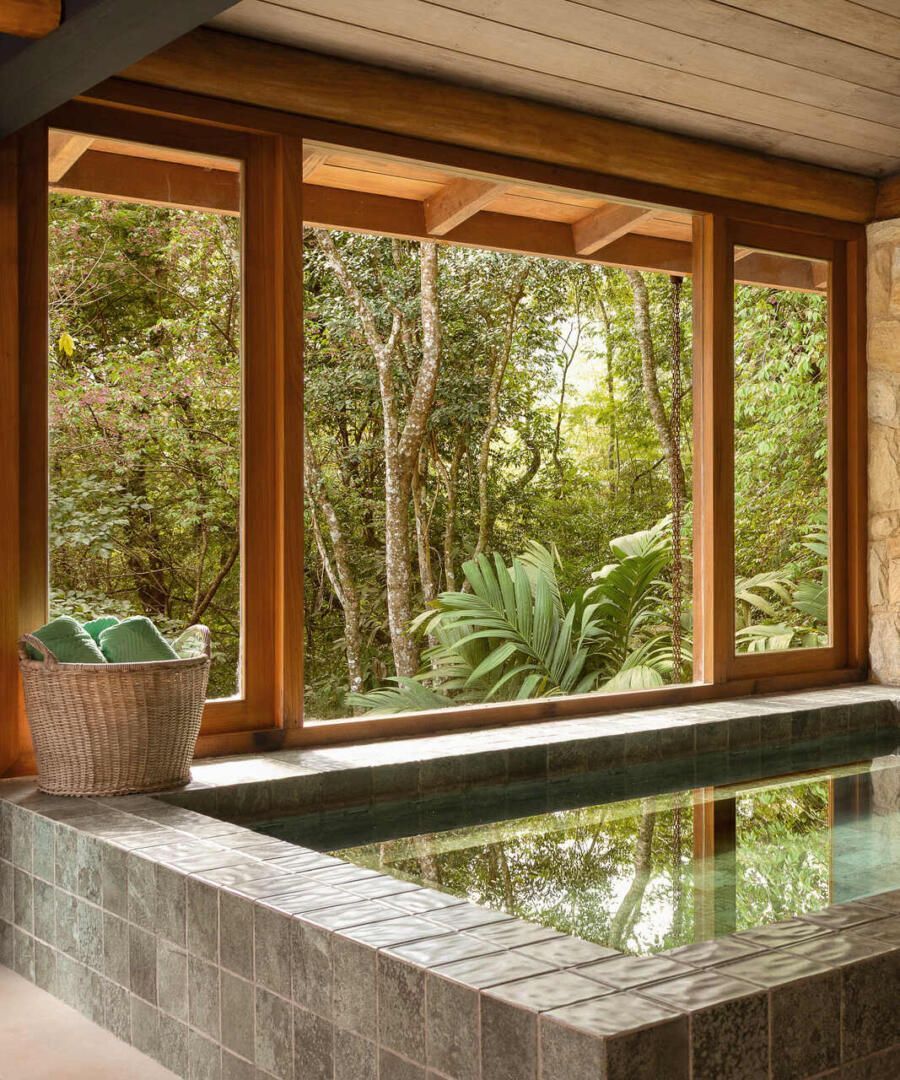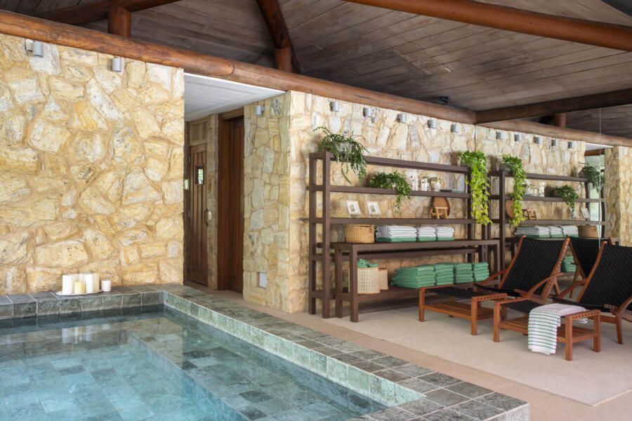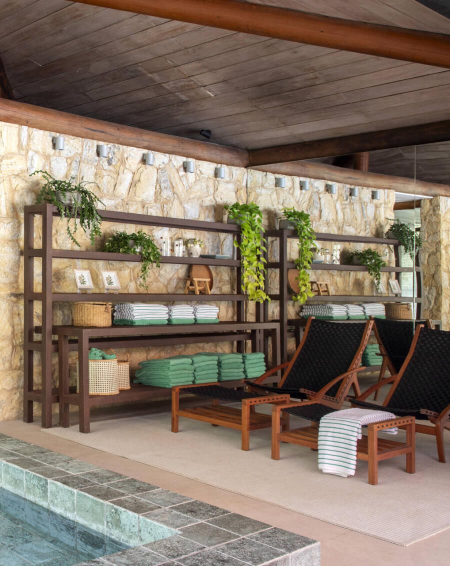 Com cerca de 210m² de área coberta e outros 270m² dedicados ao deck e à piscina, o anexo foi concebido como uma extensão natural da residência. A escolha dos materiais reforça essa integração: madeira, pedra e vidro aparecem combinados em uma paleta inspirada nos tons da serra — beges, marrons e terrosos que dialogam diretamente com o entorno. Nas paredes, a pedra madeira almofadada aplicada manualmente traz textura e calor visual, enquanto as esquadrias de madeira e vidro ampliam a relação entre interior e exterior.