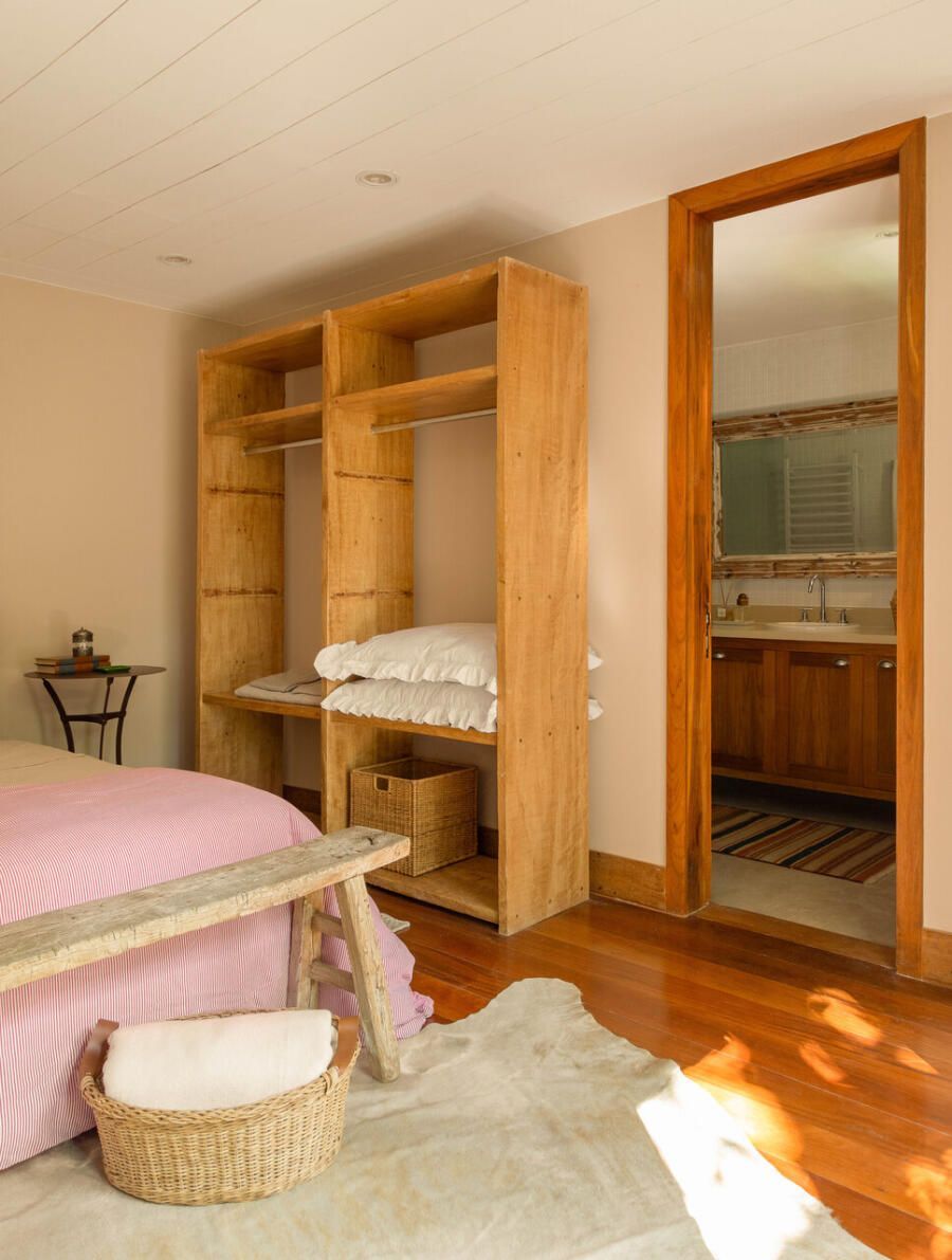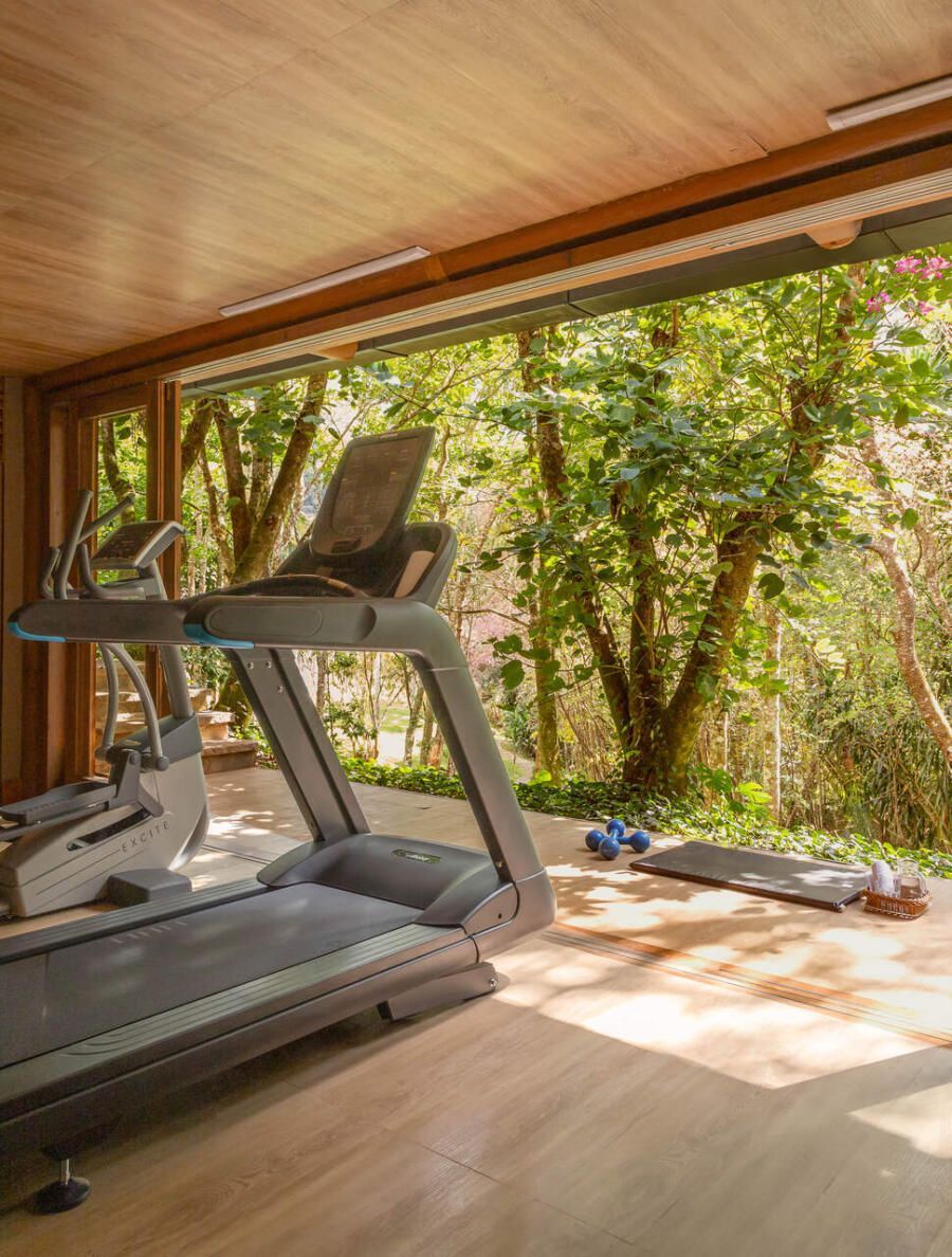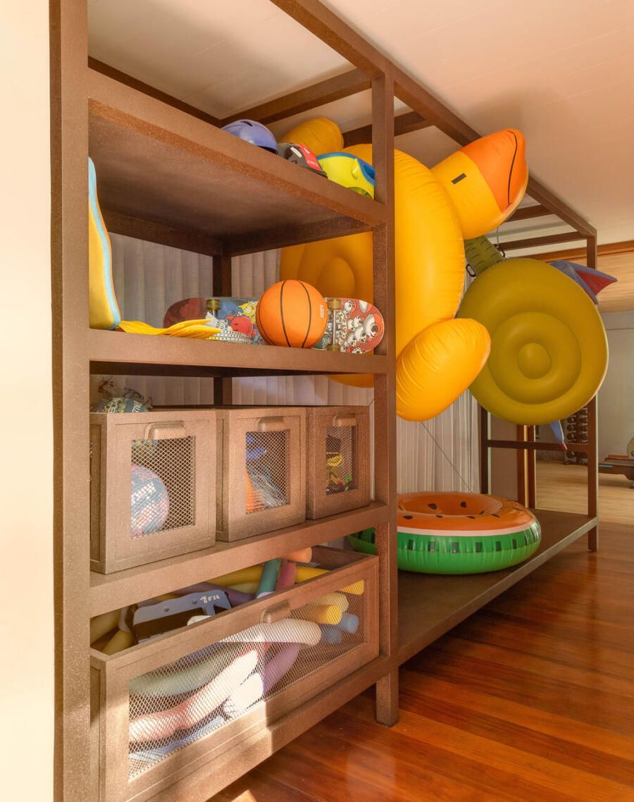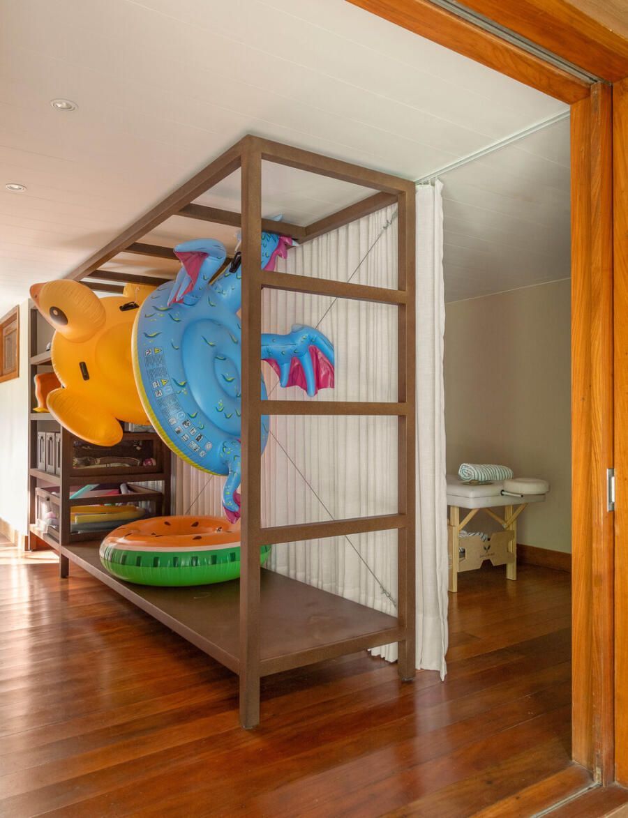 O programa do anexo foi distribuído em dois níveis. No patamar inferior, acessado por escadas e rampa, ficam os ambientes mais funcionais: sala de massagem, academia e uma suíte de hóspedes. Esses espaços são conectados por um corredor marcado por uma estante aberta que abriga boias e brinquedos molhados, uma solução prática que reforça o espírito despretensioso da casa de campo.