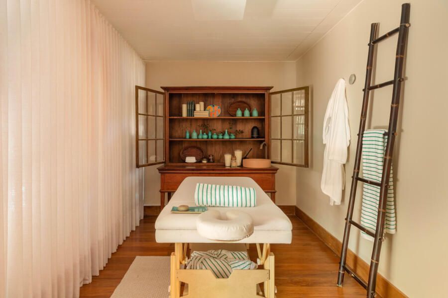 A decoração segue um caminho contemporâneo e afetivo, combinando peças novas com móveis que já pertenciam ao cliente e foram restaurados ou ressignificados. Mesas de refeição, o sofá da área de TV e até um antigo móvel transformado em bancada na sala de massagem reforçam a atmosfera pessoal do espaço.