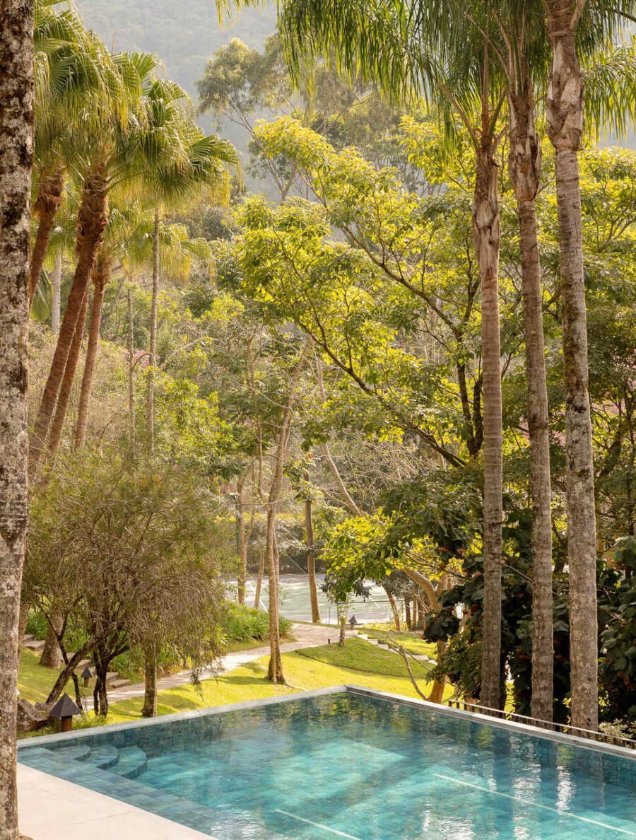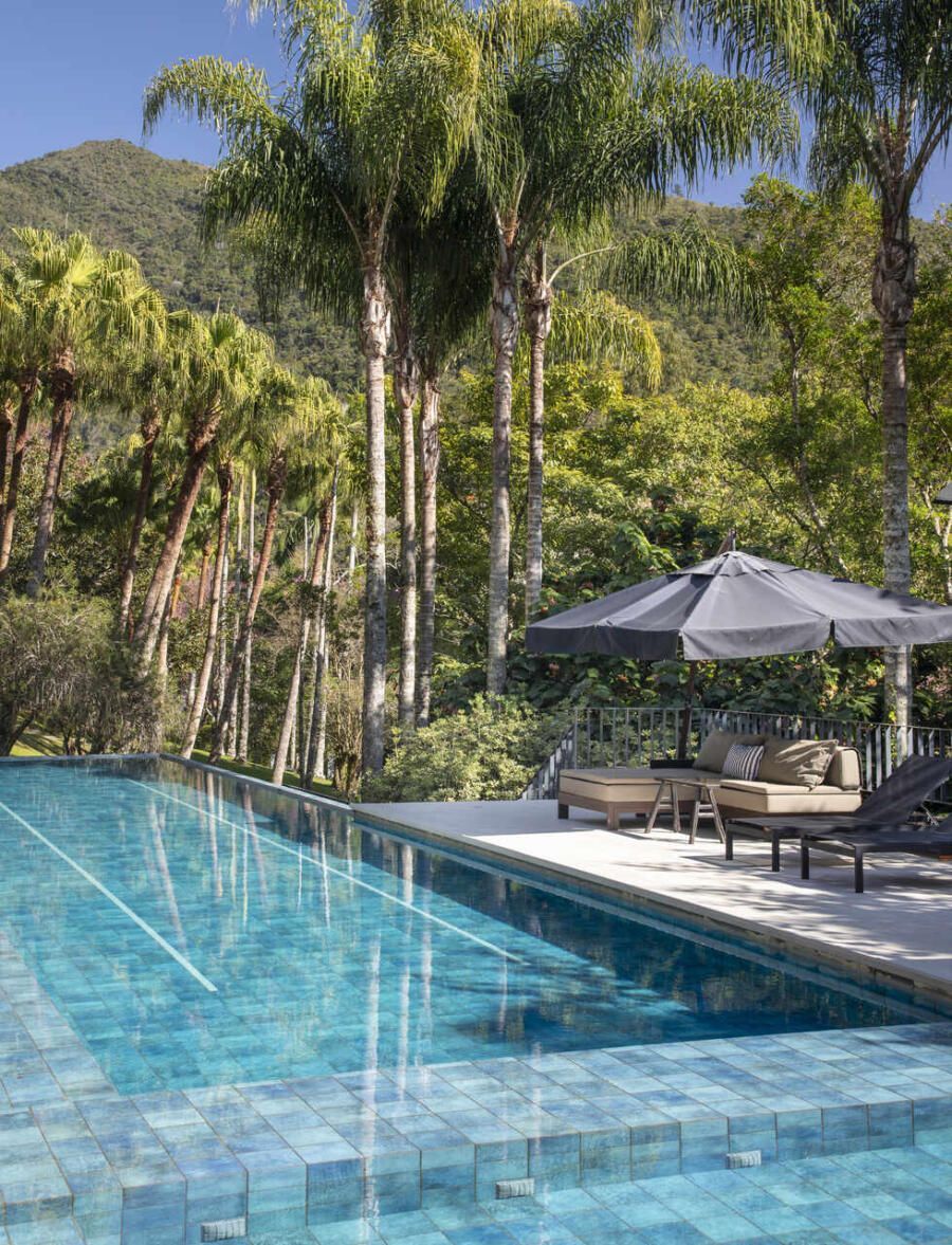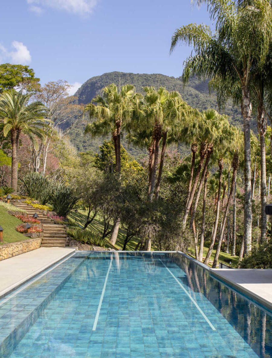 Do lado de fora, a piscina de 26 metros se estende como protagonista do projeto. Reformada integralmente para resolver questões de impermeabilização e receber uma capa automatizada, ela ganhou novo desenho com degraus submersos, prainha e duas raias. O revestimento em cerâmica azul estonado fosco substitui as antigas pastilhas azul royal, criando um contraste delicado com os tons naturais predominantes na arquitetura.