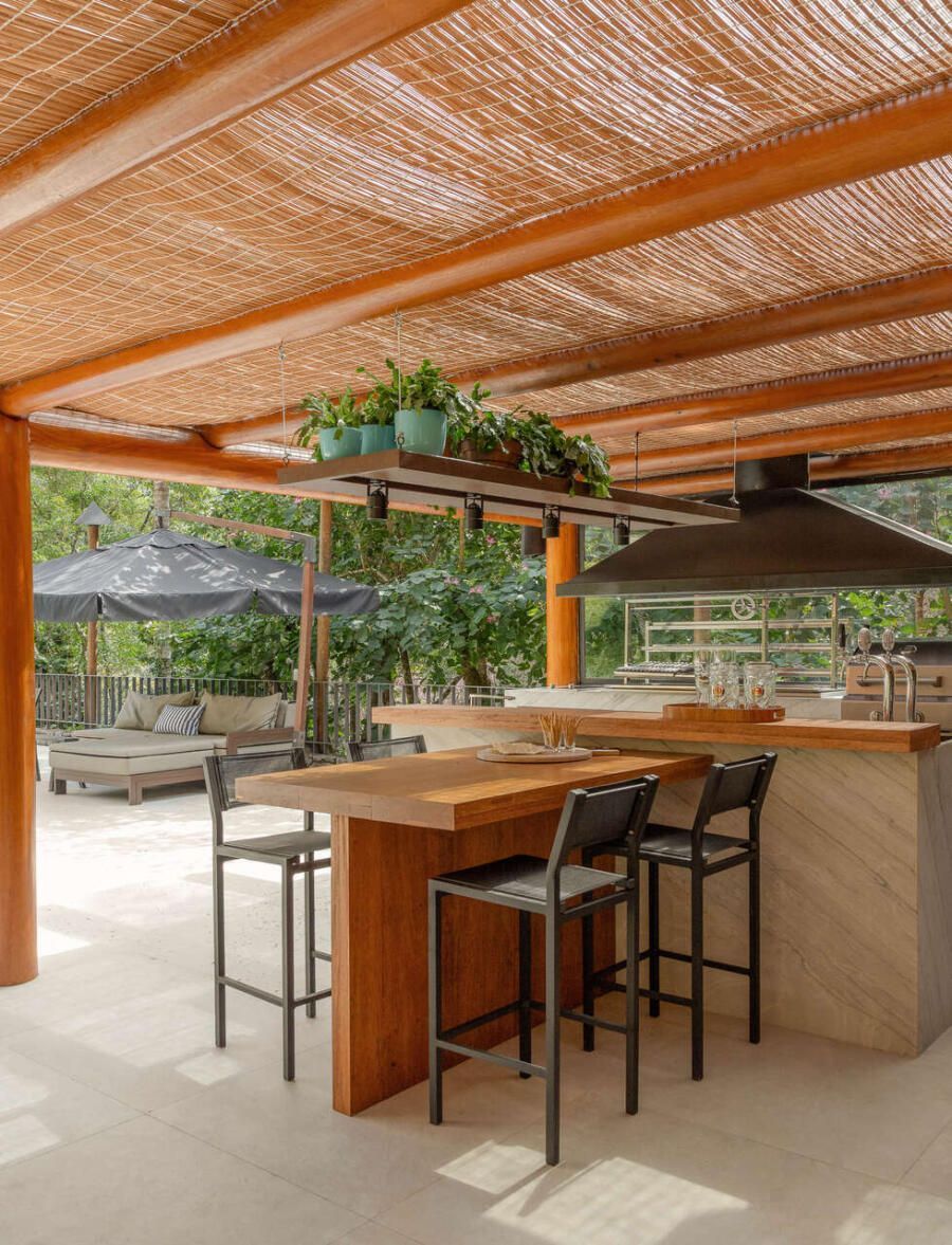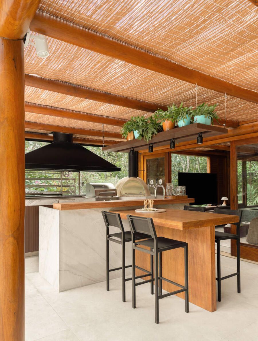 No nível principal, a vida social se desenrola com fluidez entre áreas cobertas e descobertas. A área gourmet é o grande ponto de encontro, equipada com bancada em quartzito Gabana levigado, parrilha a carvão, churrasqueira a gás, cooktop e forno de pizza. A ilha central reúne cuba, chopeira e mesa alta em madeira, convidando para refeições informais e conversas prolongadas. Ao redor, mesas de jantar, área de TV e espaços de relaxamento criam diferentes possibilidades de uso, complementadas por um spa com jacuzzi para sete pessoas, sauna seca e sauna a vapor.