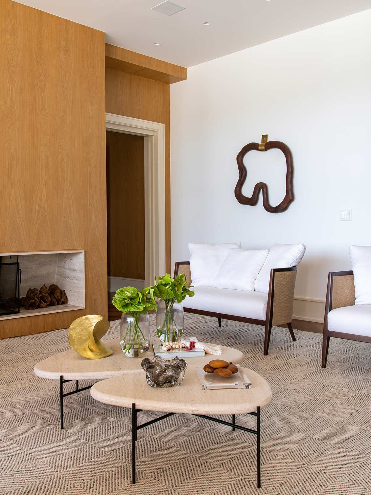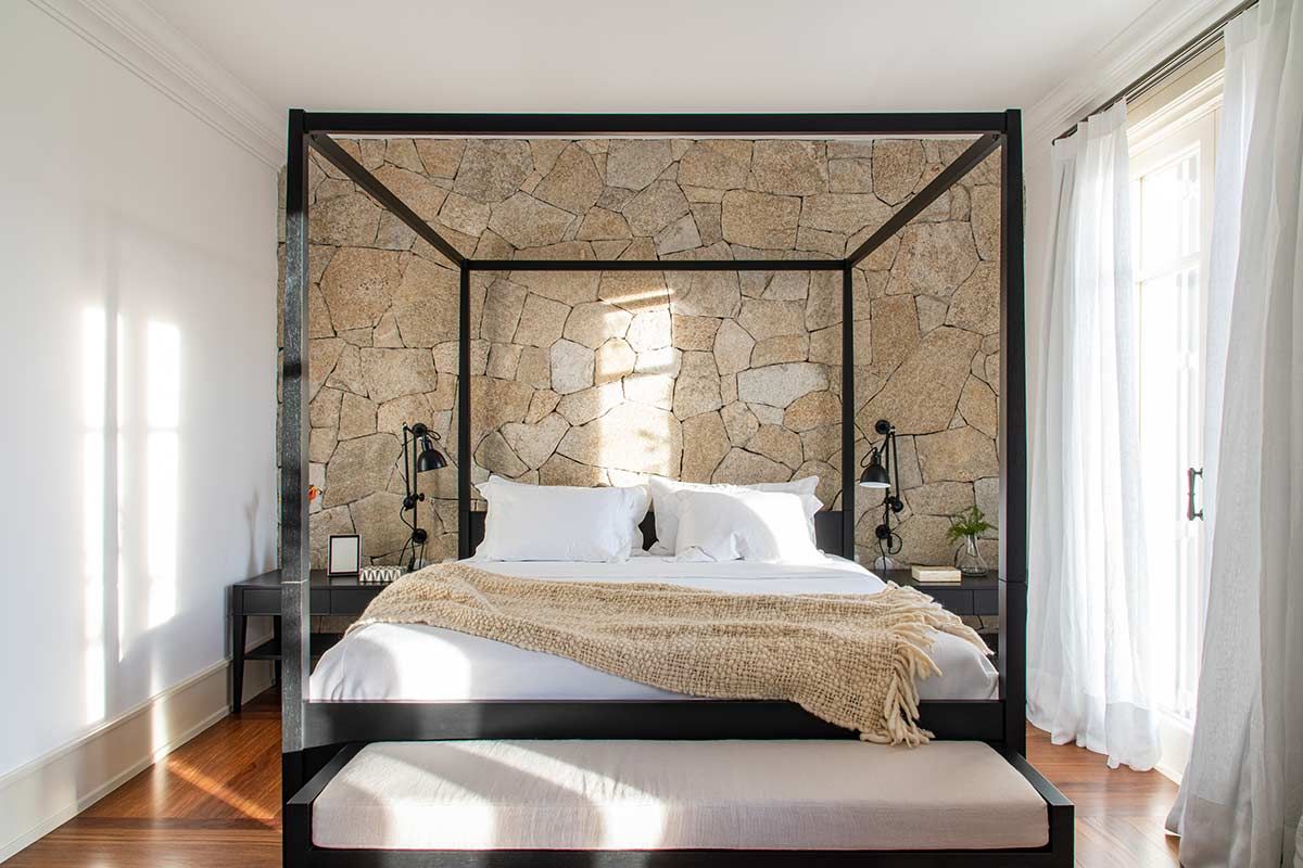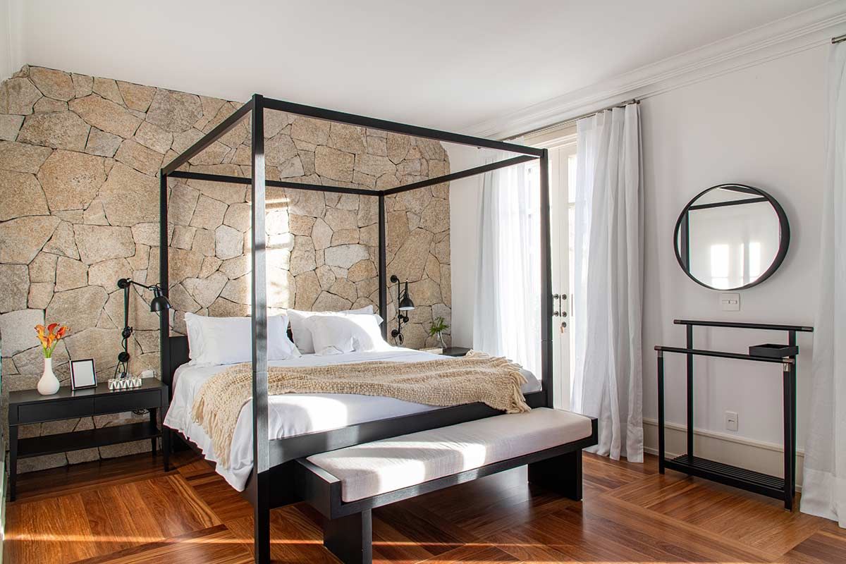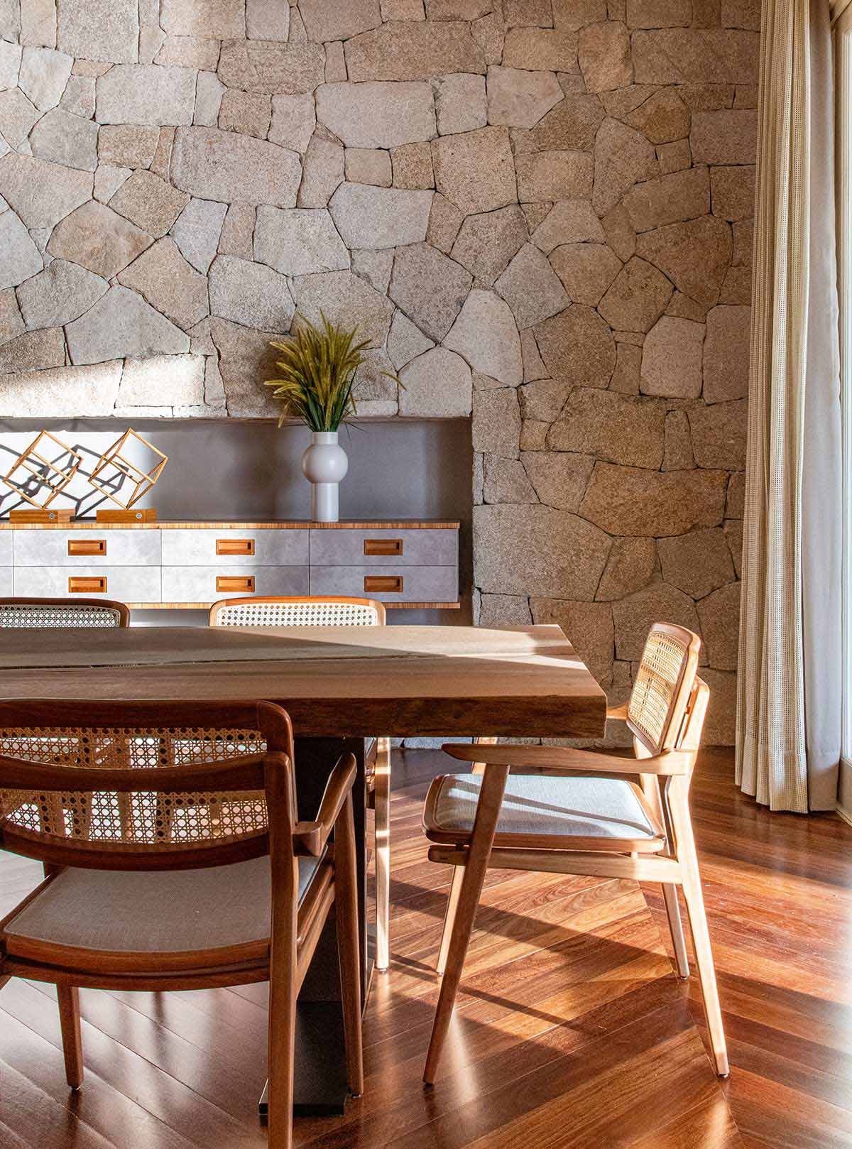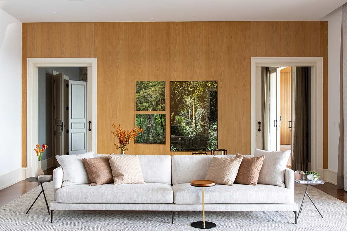 As setes suítes, sala da lareira, TV e jantar foram os únicos espaços estruturalmente mantidos, mas com nova decoração. Em meio a paleta neutra que permeia o branco, cinza e preto, as texturas ressaltam os elementos naturais, agregando conforto aos cômodos e transformando a morada em um lugar de pausa e relaxamento.