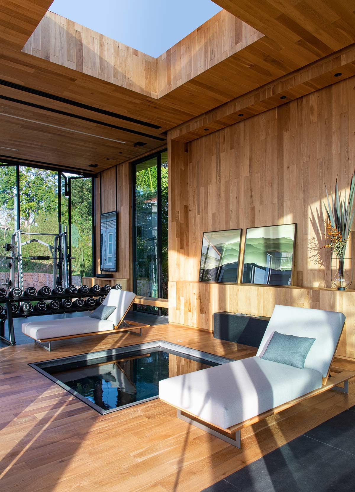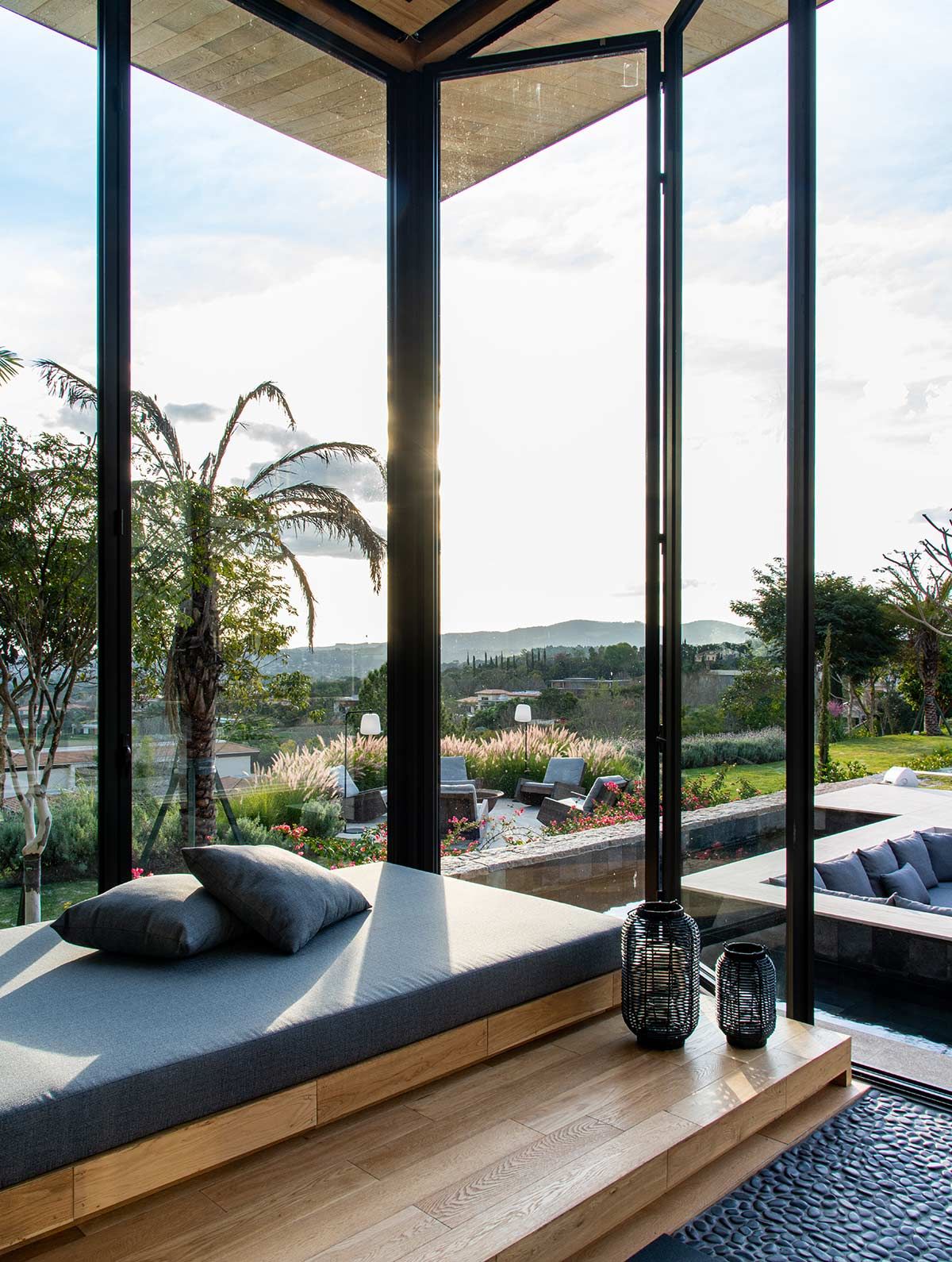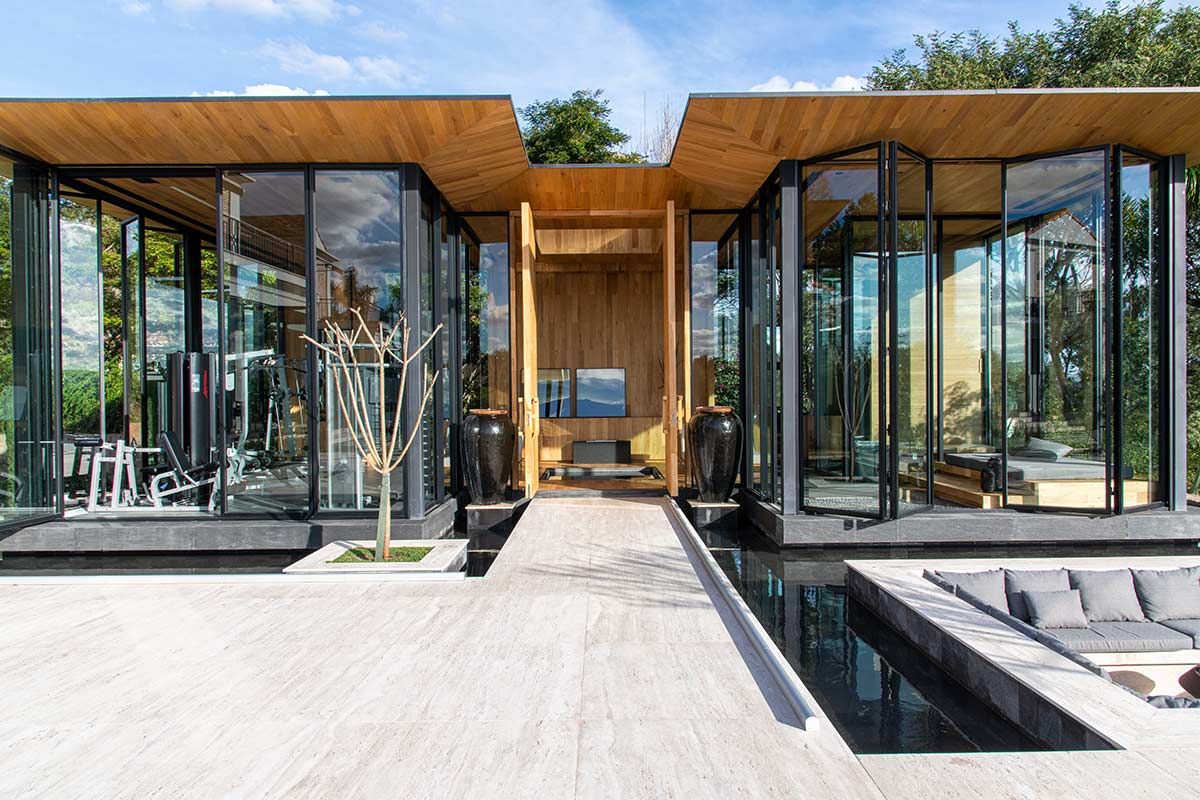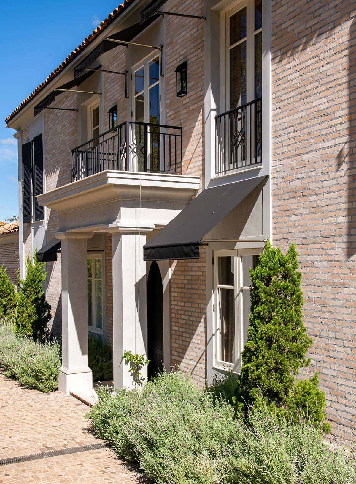 A fachada recebeu boiseries e molduras de cimento, e arandelas para acentuar a imponência. A ampliação das varandas permitiu que essas abraçassem toda a construção, assegurando uma linda vista para a paisagem. A arquiteta projetou ainda um espaço de bem estar, que conta com espelho d’agua, spa, sauna, duchas, espaço para yoga, massagem, cromoterapia e academia; tudo isso envolvido por painéis de madeira vidro que mimetizam o paisagismo.