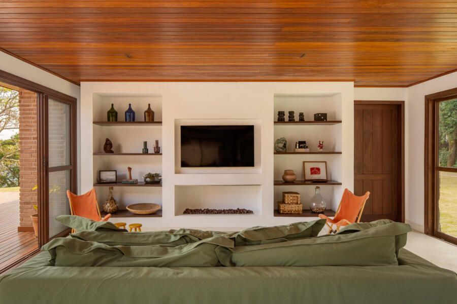 Na sala, o forro de madeira cumaru desenha uma linha quente que guia o olhar, enquanto a marcenaria em muiracatiara tonalizada valoriza as formas construídas. A lareira, desenhada sob medida, cumpre a função de enquadrar a vista, em uma moldura que traz o horizonte para dentro, desfazendo fronteiras entre interior e exterior.