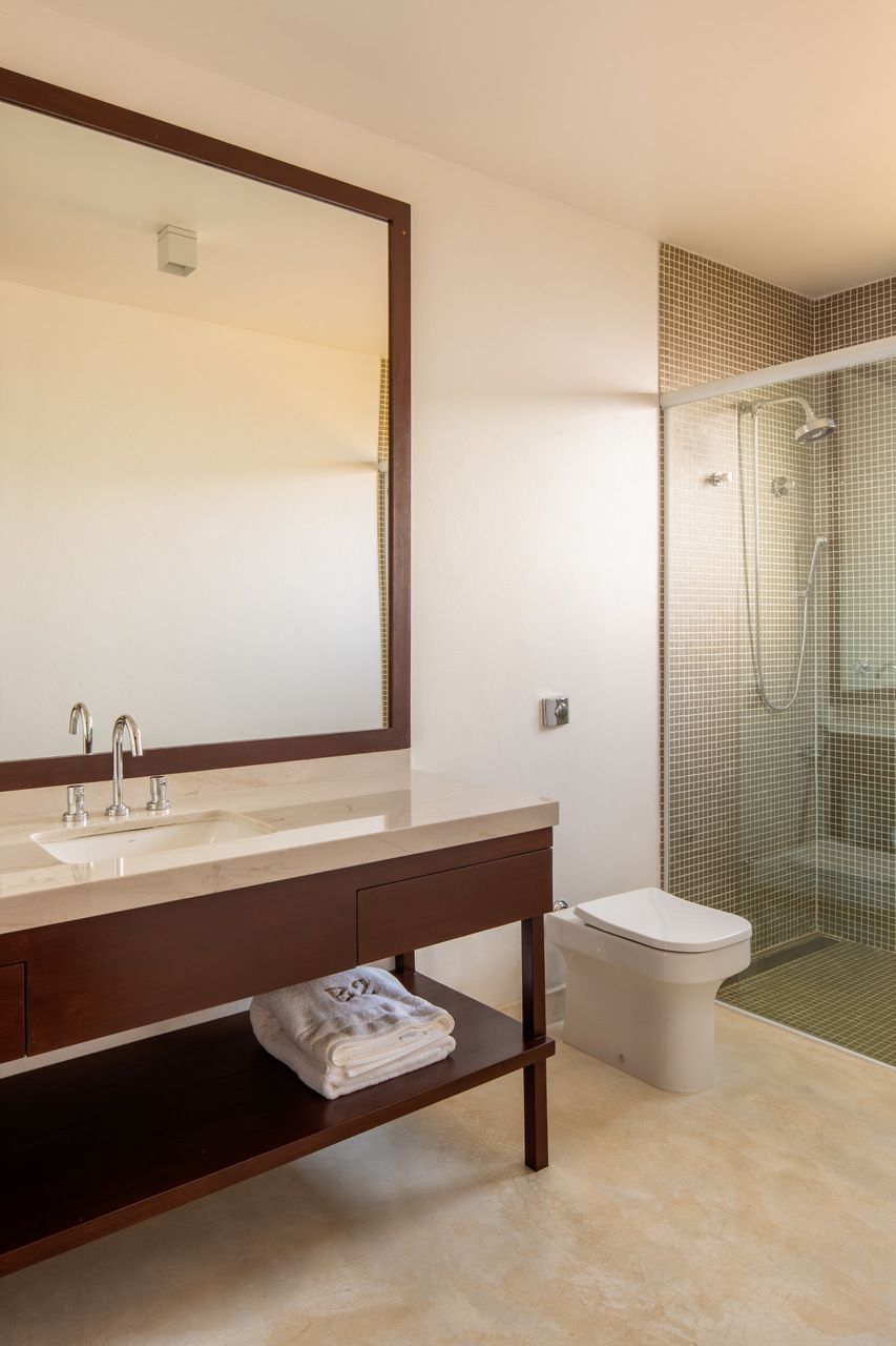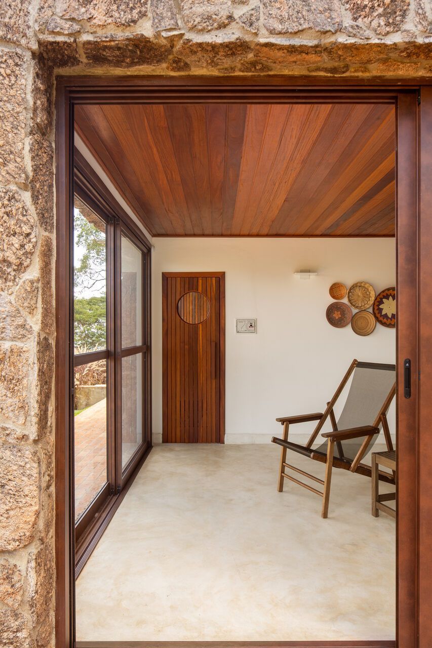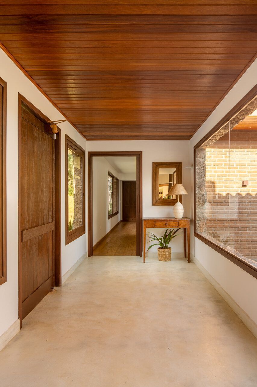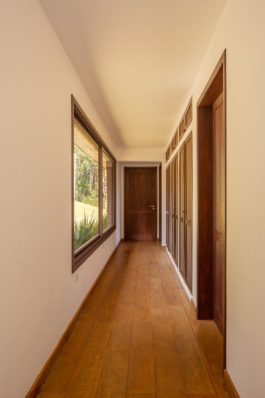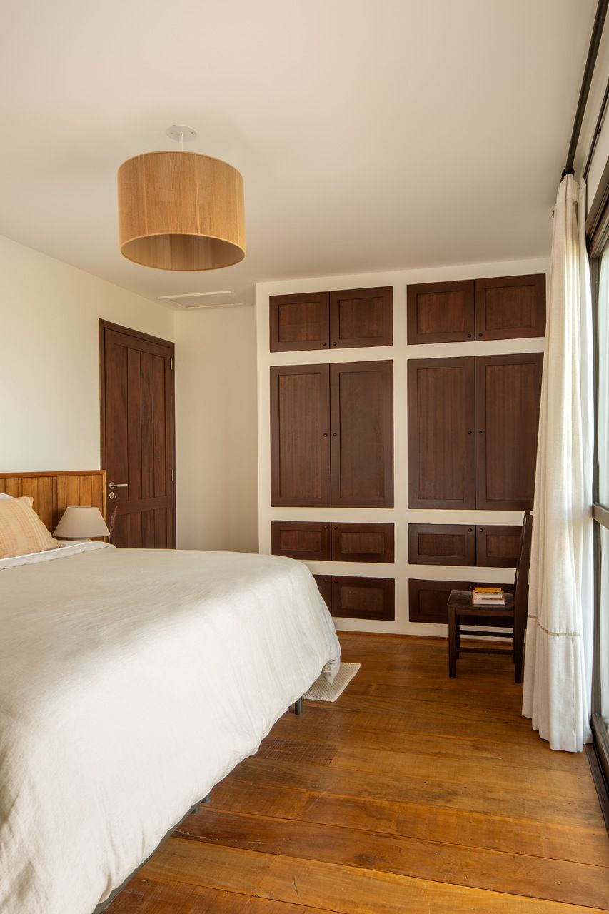 A casa se organiza a partir do fogão a lenha, protagonista absoluto e guardião da atmosfera mineira. Ele aquece, reúne e perfuma, ditando o ritmo dos espaços e servindo como ponto de encontro. Bancadas e piso monolítico em cimento queimado off-white garantem continuidade visual e praticidade essencial para o uso constante da casa de campo. Na área íntima, a madeira de demolição encontrada na região preserva irregularidades e histórias, enquanto as cabeceiras feitas de araucárias caídas no próprio terreno criam um gesto afetivo e respeitoso com o lugar.