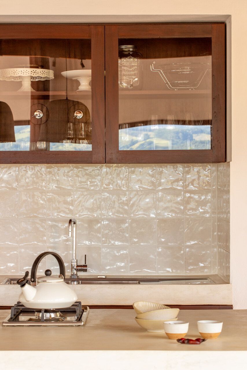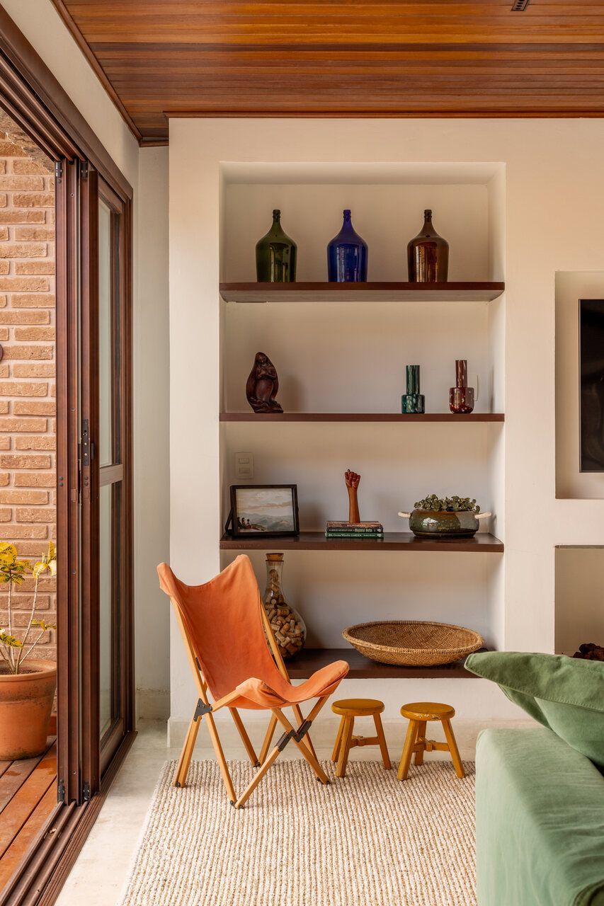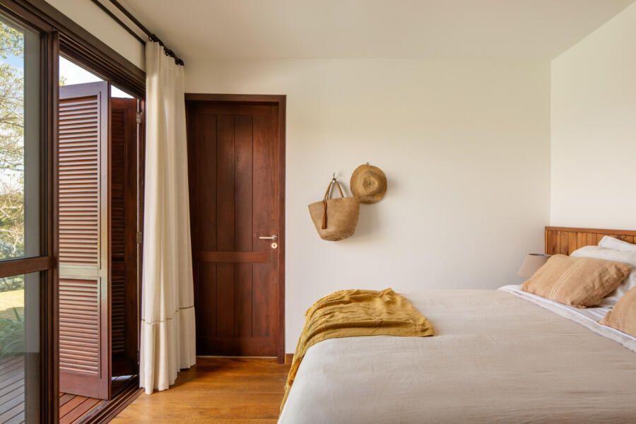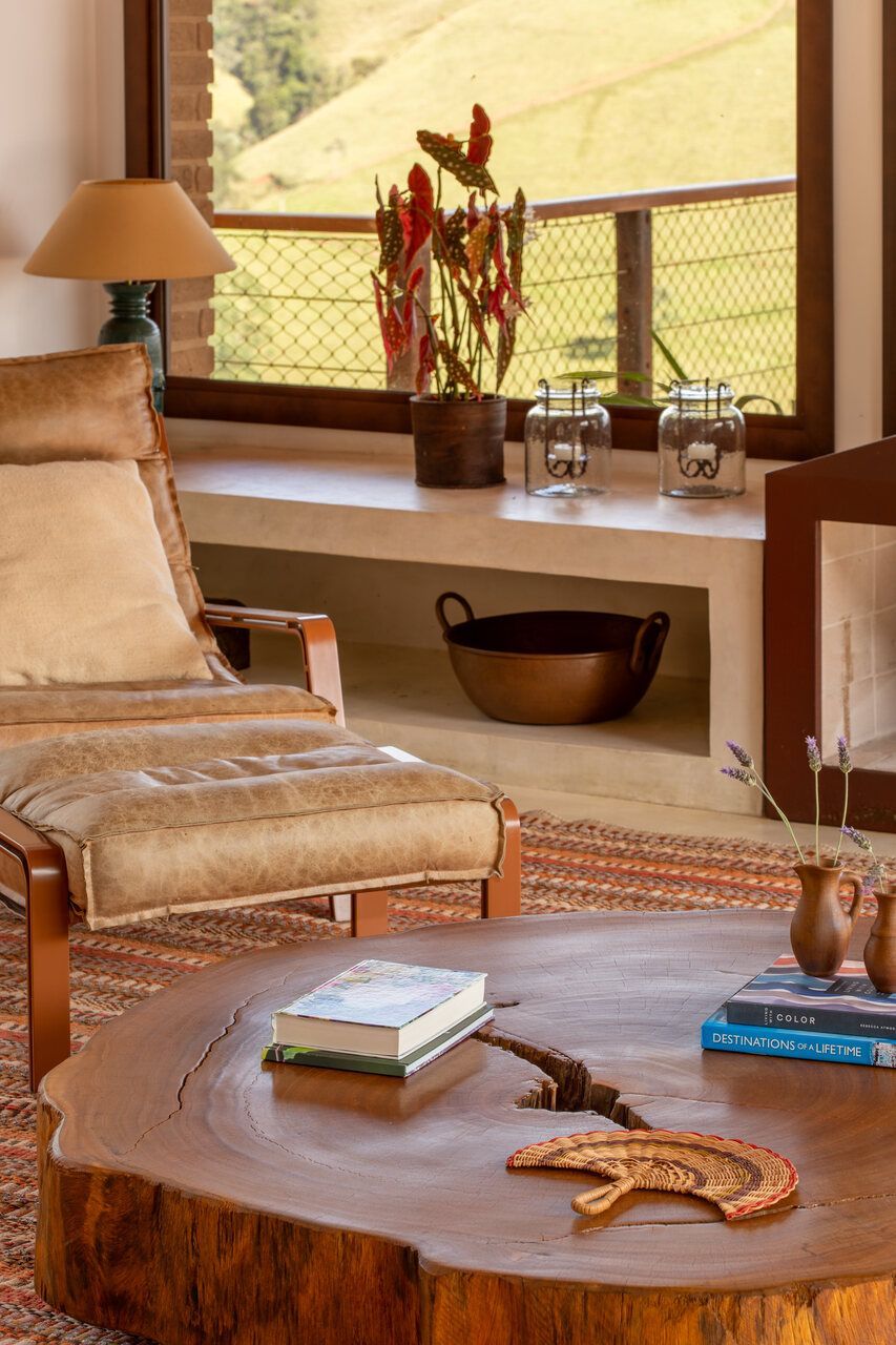 Cerâmica, fibras naturais, mesas de tora maciça, peças garimpadas em antiquários da região e um sofá de veludo compõem um repertório tátil que equilibra rusticidade e conforto. Cada objeto foi escolhido para pertencer, como se sempre estivesse ali. A paleta terrosa, o uso de materiais locais e a presença constante da vista reforçam essa sensação de coerência tranquila.