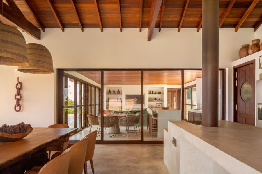 Na sala, o forro de madeira cumaru desenha uma linha quente que guia o olhar, enquanto a marcenaria em muiracatiara tonalizada valoriza as formas construídas. A lareira, desenhada sob medida, cumpre a função de enquadrar a vista, em uma moldura que traz o horizonte para dentro, desfazendo fronteiras entre interior e exterior.
