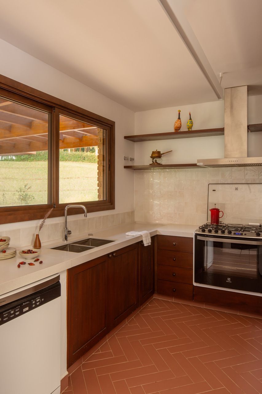 “Os clientes queriam uma casa para reunir amigos, cozinhar sem pressa, aquecer o corpo e a alma nos dias frios, e deixar que a paisagem entrasse sem esforço. Os desafios acompanharam a geografia, a distância do urbano, a mão de obra local, a necessidade de trabalhar com materiais disponíveis na região e fáceis de executar. Transformamos essas limitações em força, optando por elementos vernaculares, texturas naturais e acabamentos que conversam com a cultura da Mantiqueira.”