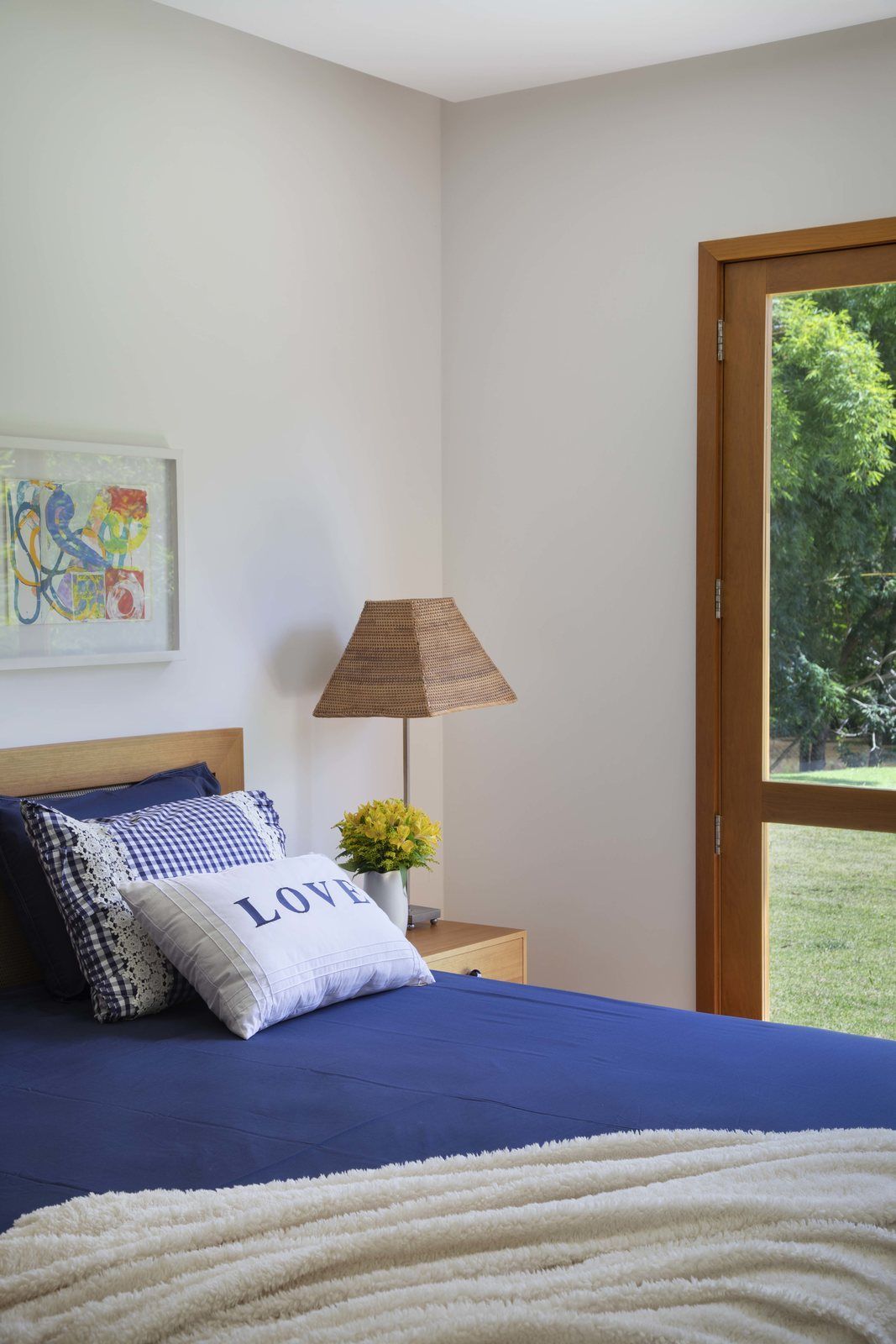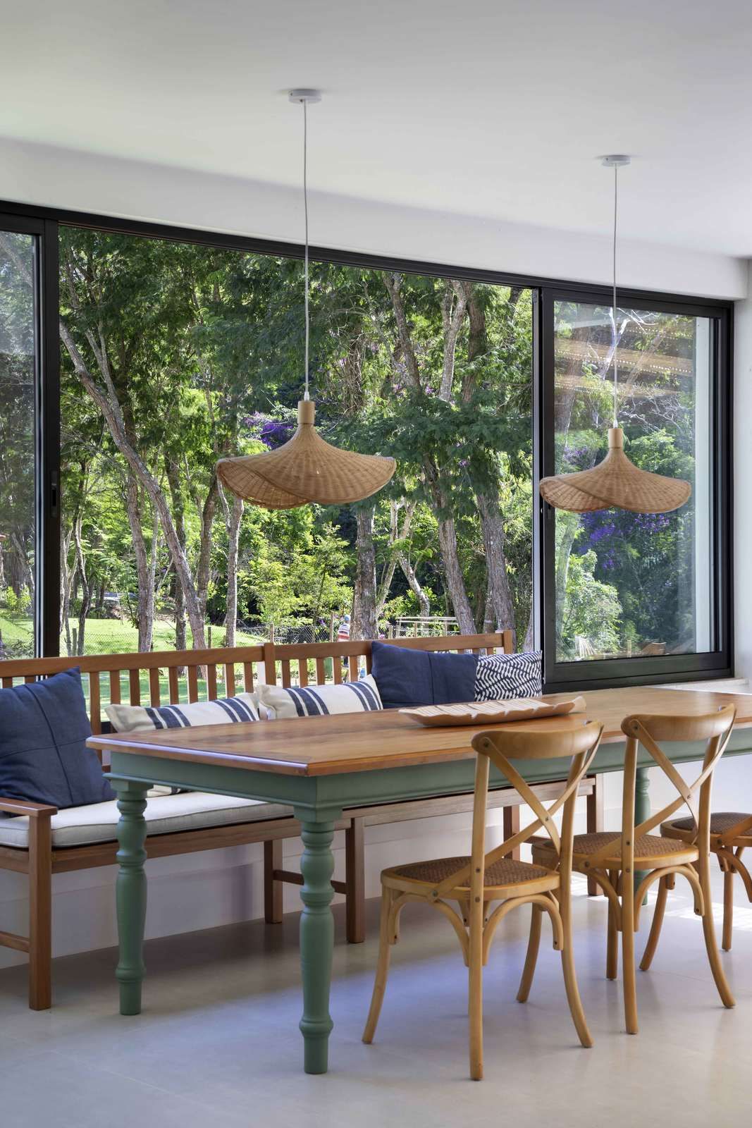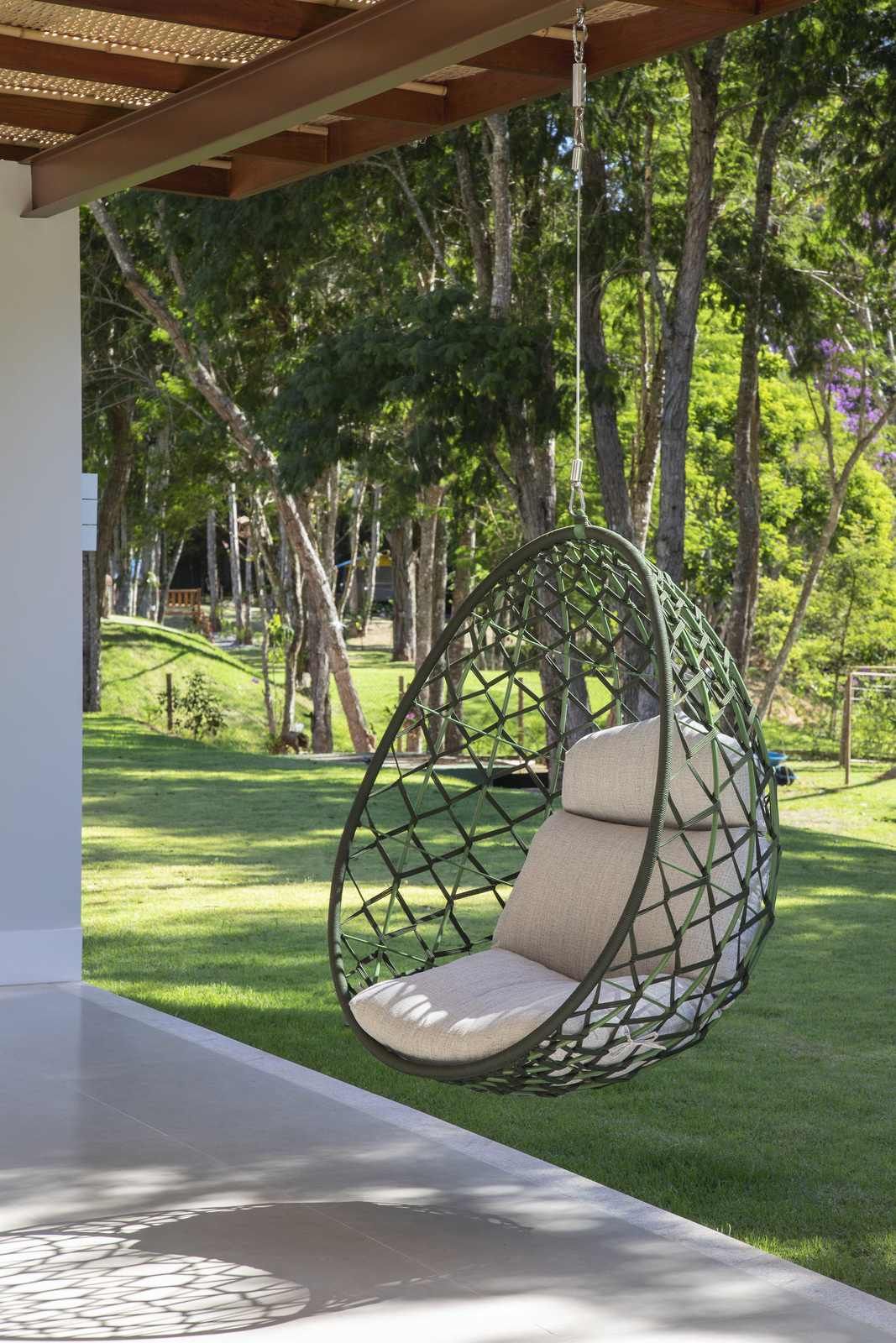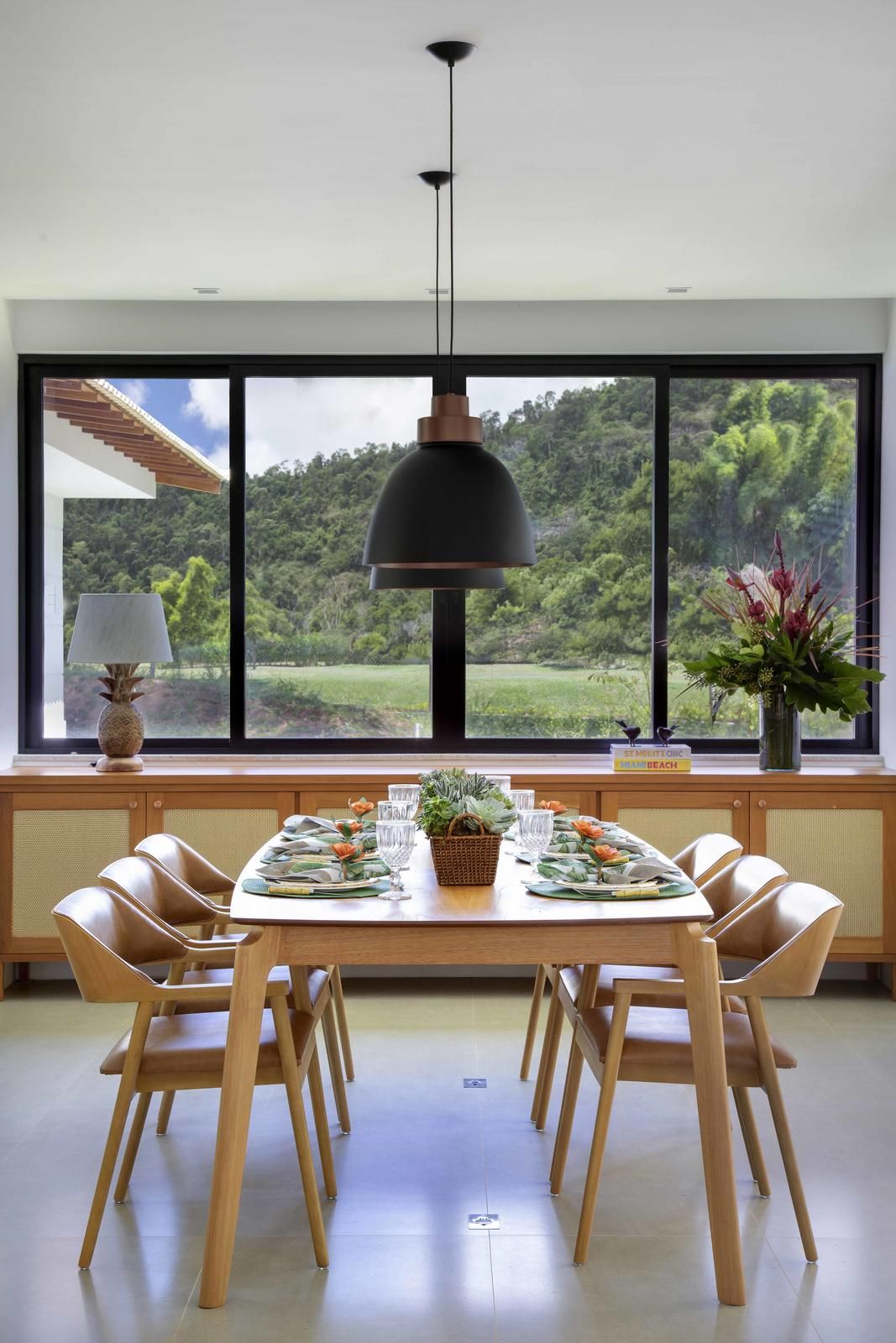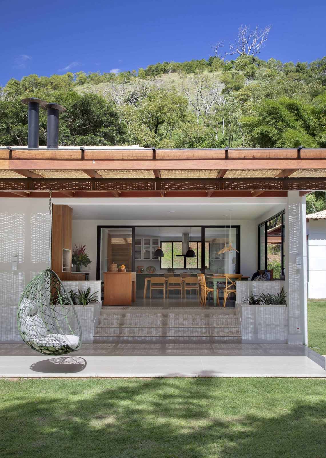 “Trata-se de uma casa pensada para ser confortável e acolhedora. No mobiliário, foram aproveitadas algumas peças de acervo dos moradores, além de um garimpo feito pelo próprio cliente, que tomou a frente para comprar tudo. Fazíamos um caderno de referências e ele procurava pelos móveis, equipamentos e luminárias correspondentes que achasse mais em conta.”