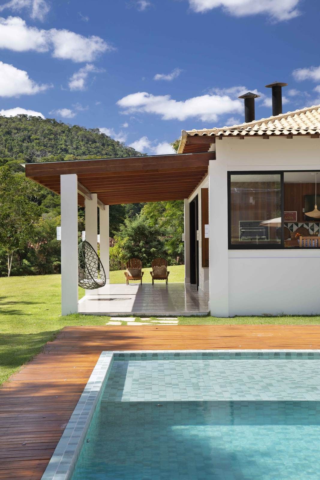 “Este era um sonho futuro dos clientes, afinal o marido está prestes a se aposentar e gostaria de ter um local para passar mais tempo na região, prolongando os finais de semana, mas a demanda por isolamento social dos últimos anos, com a pandemia, acelerou o processo de buscar um terreno e projetar a casa. Eles queriam um projeto com cara de casa de campo, simples, elegante e que coubesse no bolso, para conseguir começar e finalizar as obras sem grandes surpresas.”