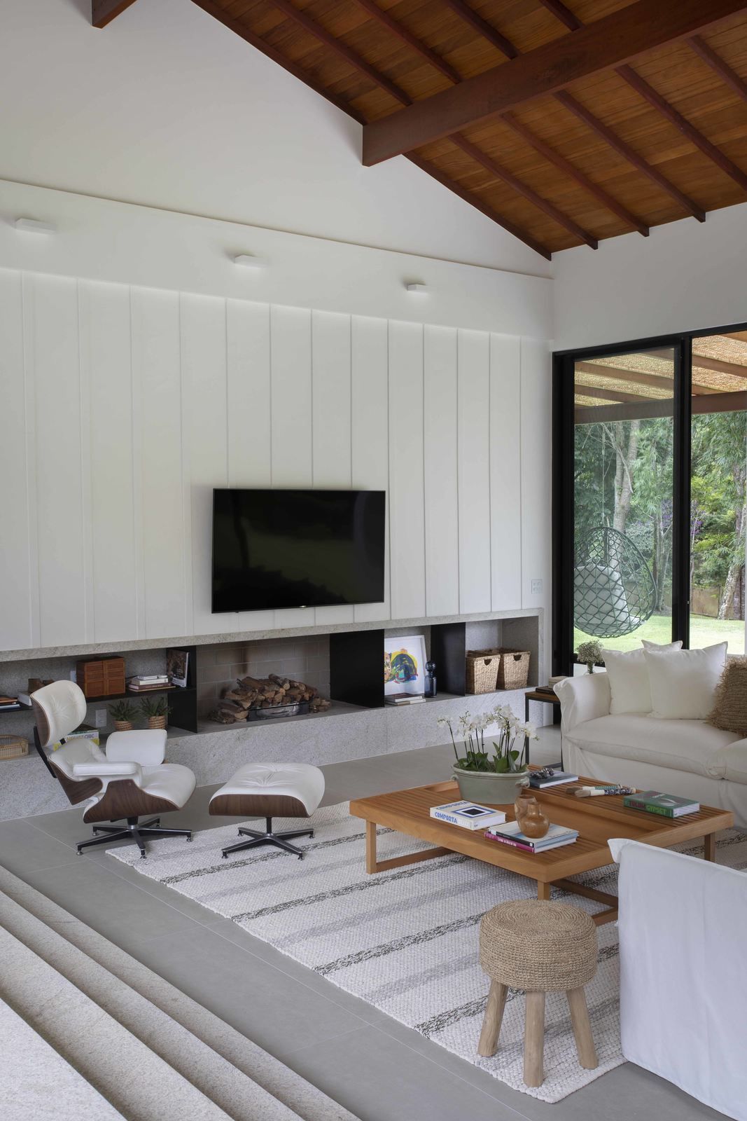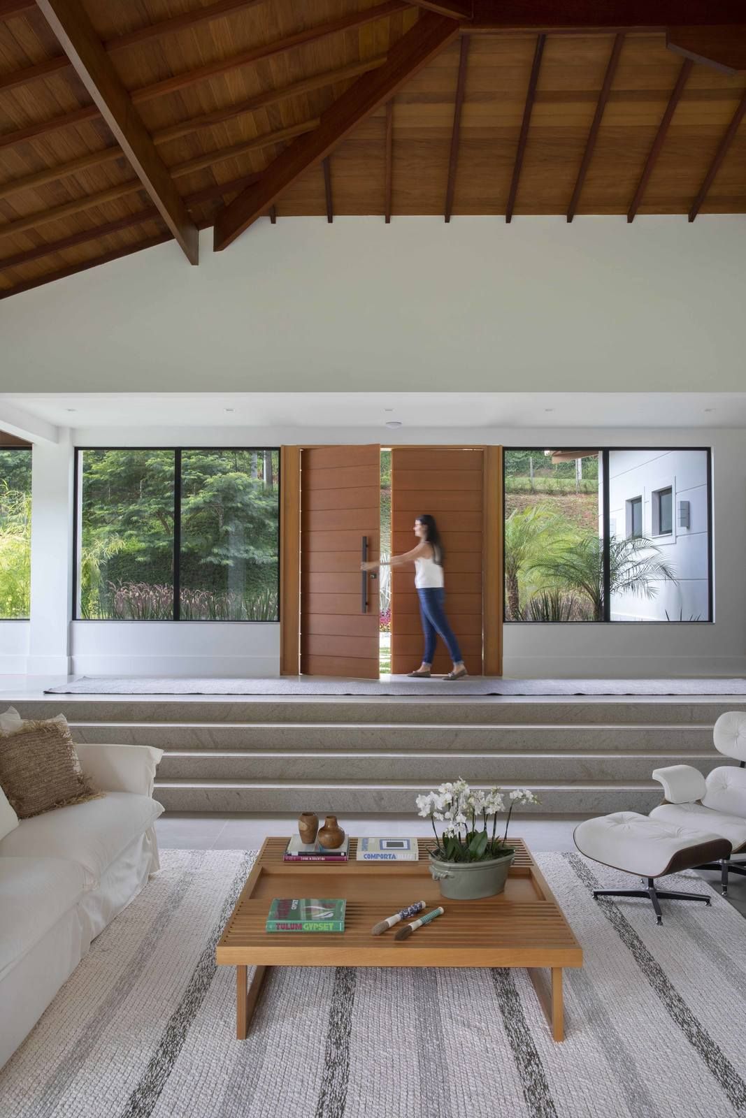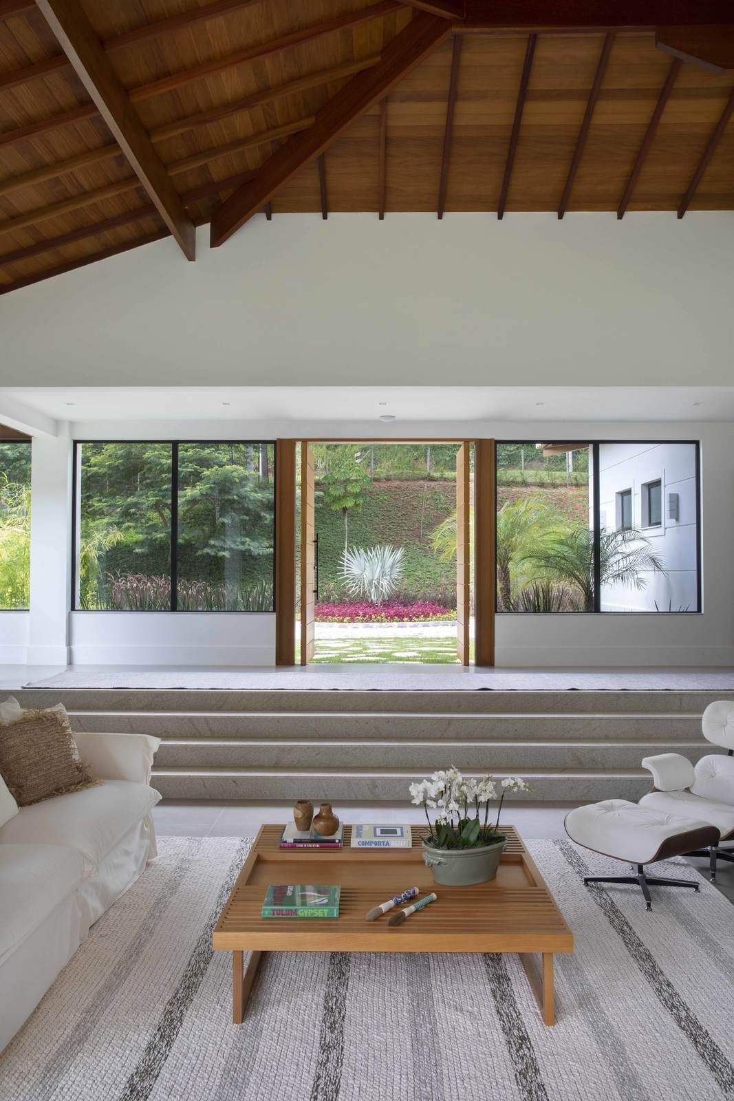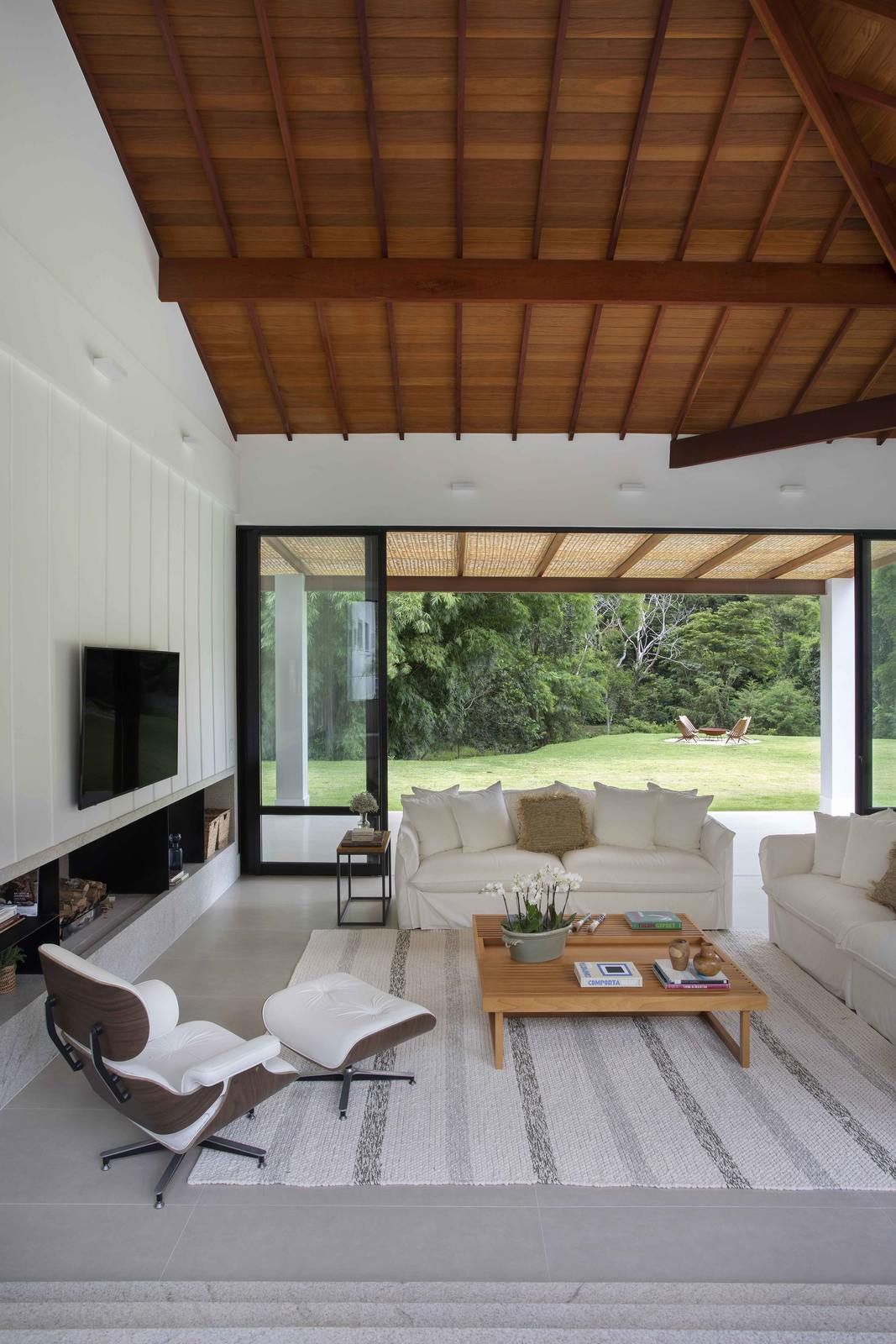 “O conceito do projeto que criamos é uma casa transparente dentro do terreno, com ambientes integrados entre si e com o jardim. Para isso, fizemos os blocos separados e usamos grandes janelas e fechamentos em vidro para trazer o exterior para dentro da casa. Os clientes adoraram essa ideia. Essa proposta predomina especialmente na área social, pois quando você entra na sala, você vê através dela, com o jardim do outro lado. O pé direito alto, com madeiramento do telhado aparente, reforça a sensação de amplitude.”