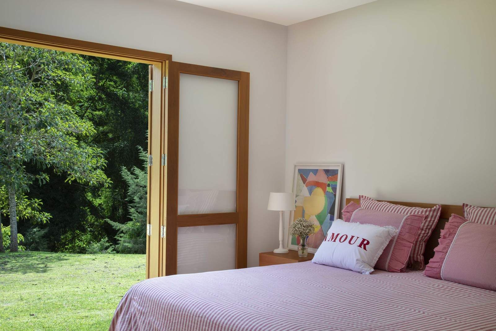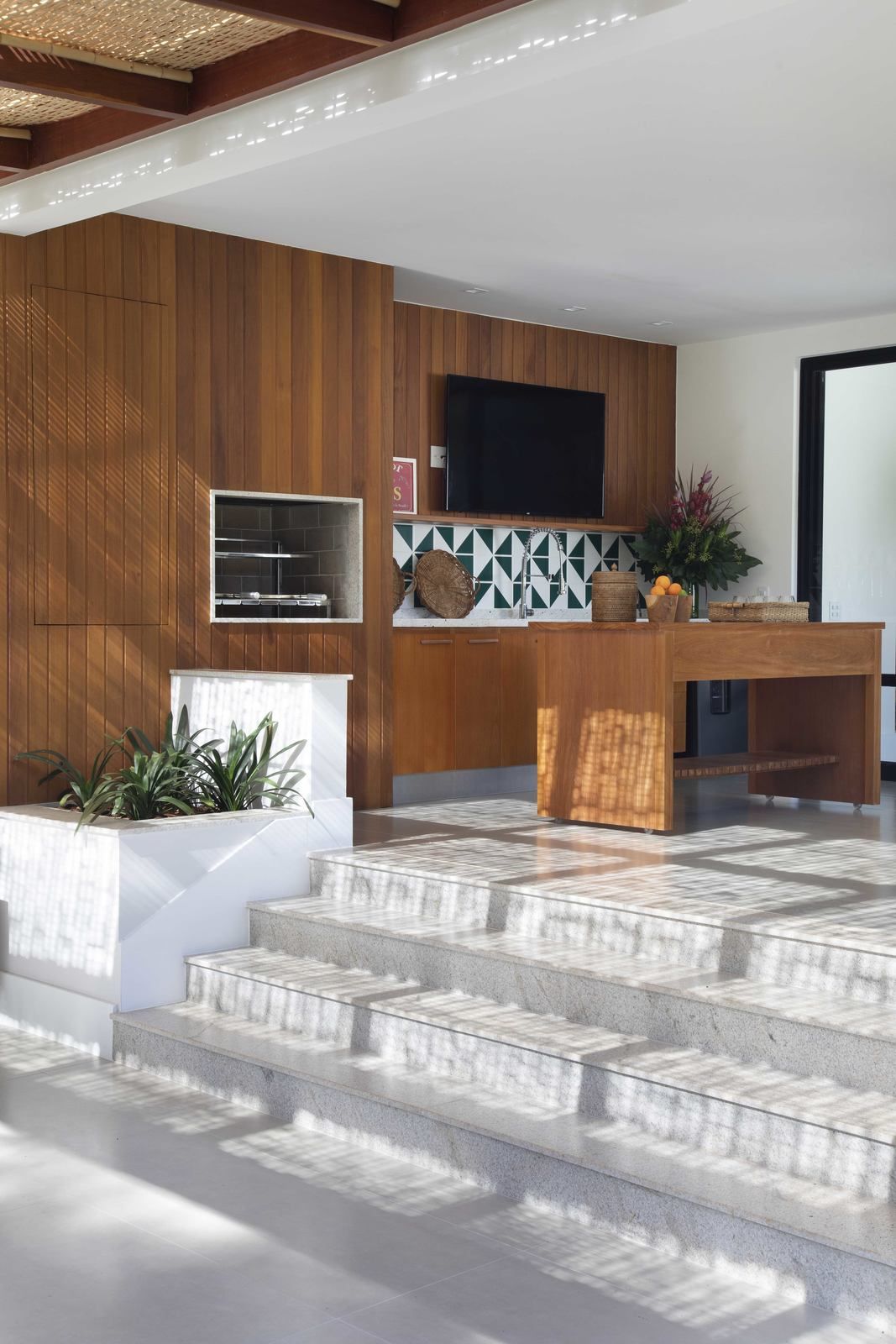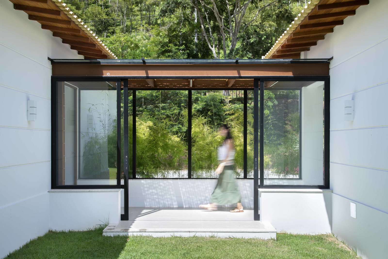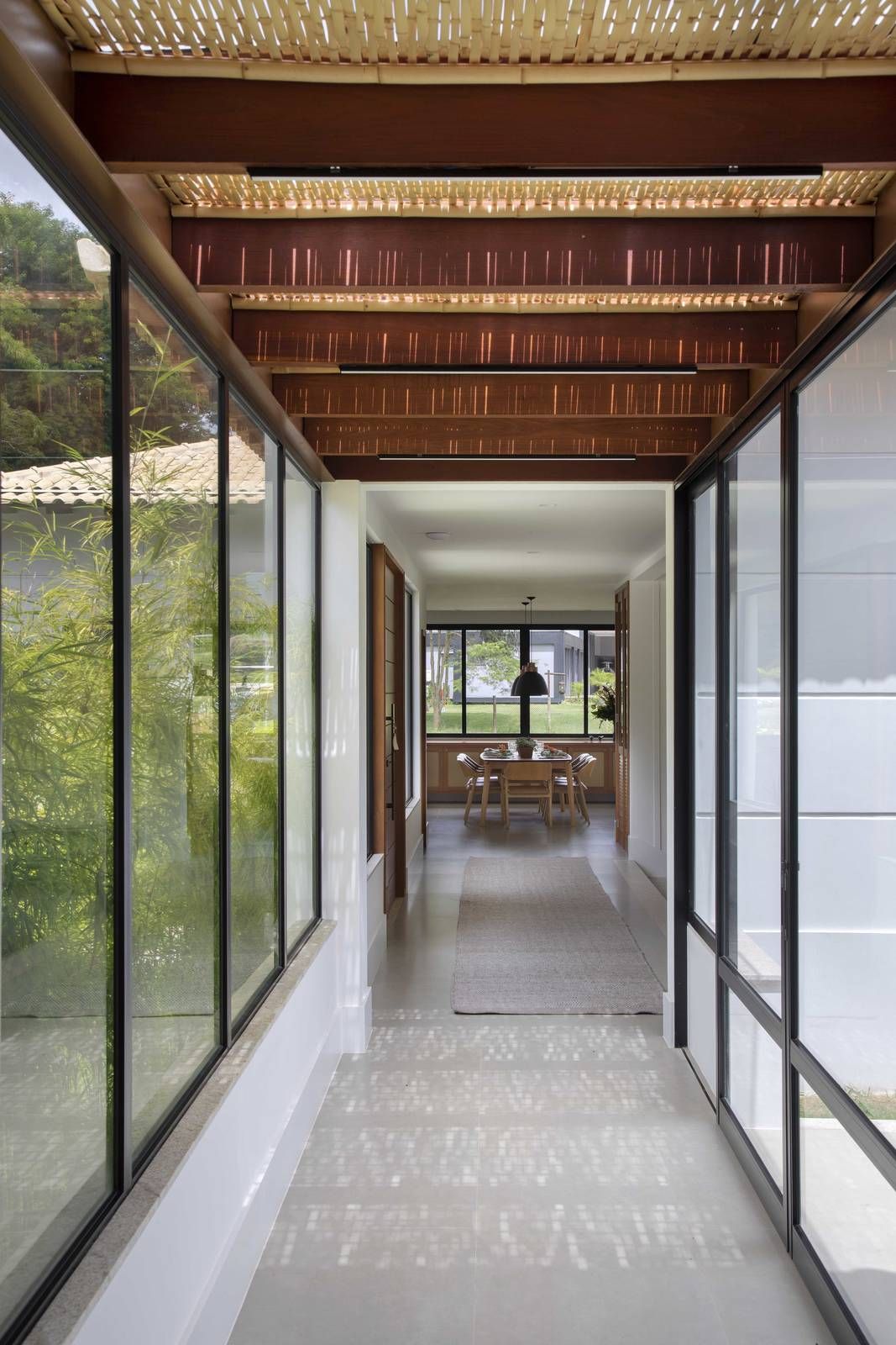 “O conceito do projeto que criamos é uma casa transparente dentro do terreno, com ambientes integrados entre si e com o jardim. Para isso, fizemos os blocos separados e usamos grandes janelas e fechamentos em vidro para trazer o exterior para dentro da casa. Os clientes adoraram essa ideia. Essa proposta predomina especialmente na área social, pois quando você entra na sala, você vê através dela, com o jardim do outro lado. O pé direito alto, com madeiramento do telhado aparente, reforça a sensação de amplitude.”