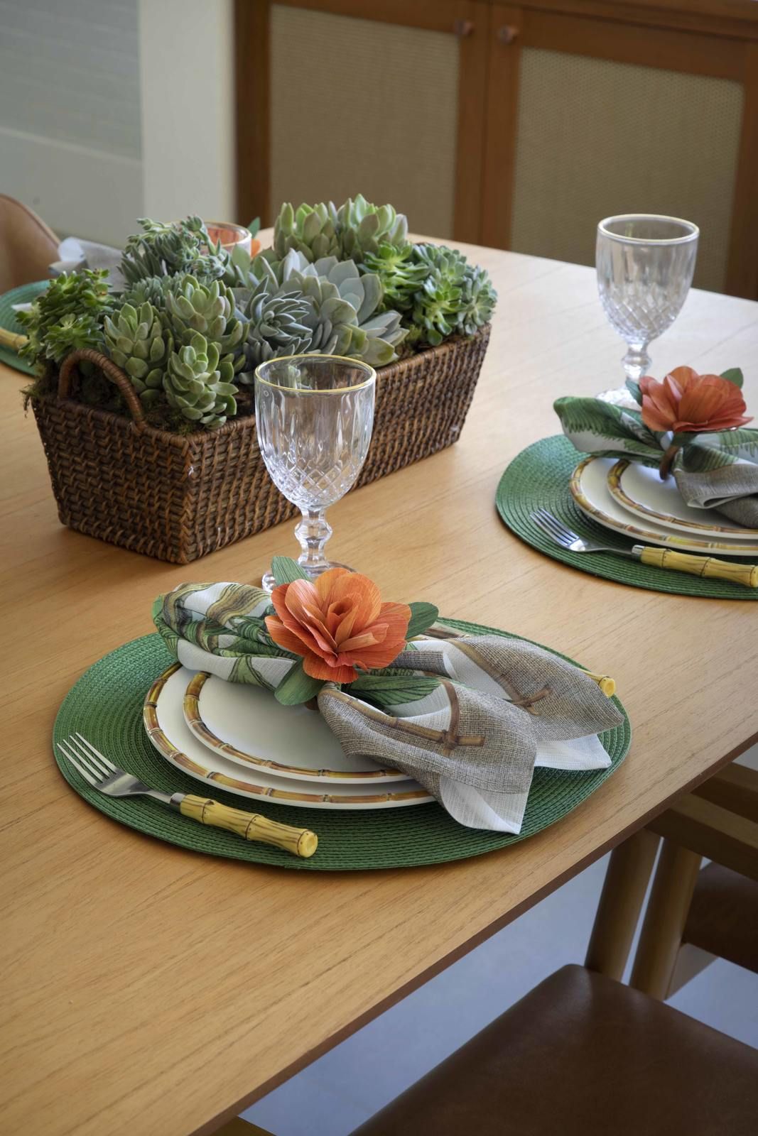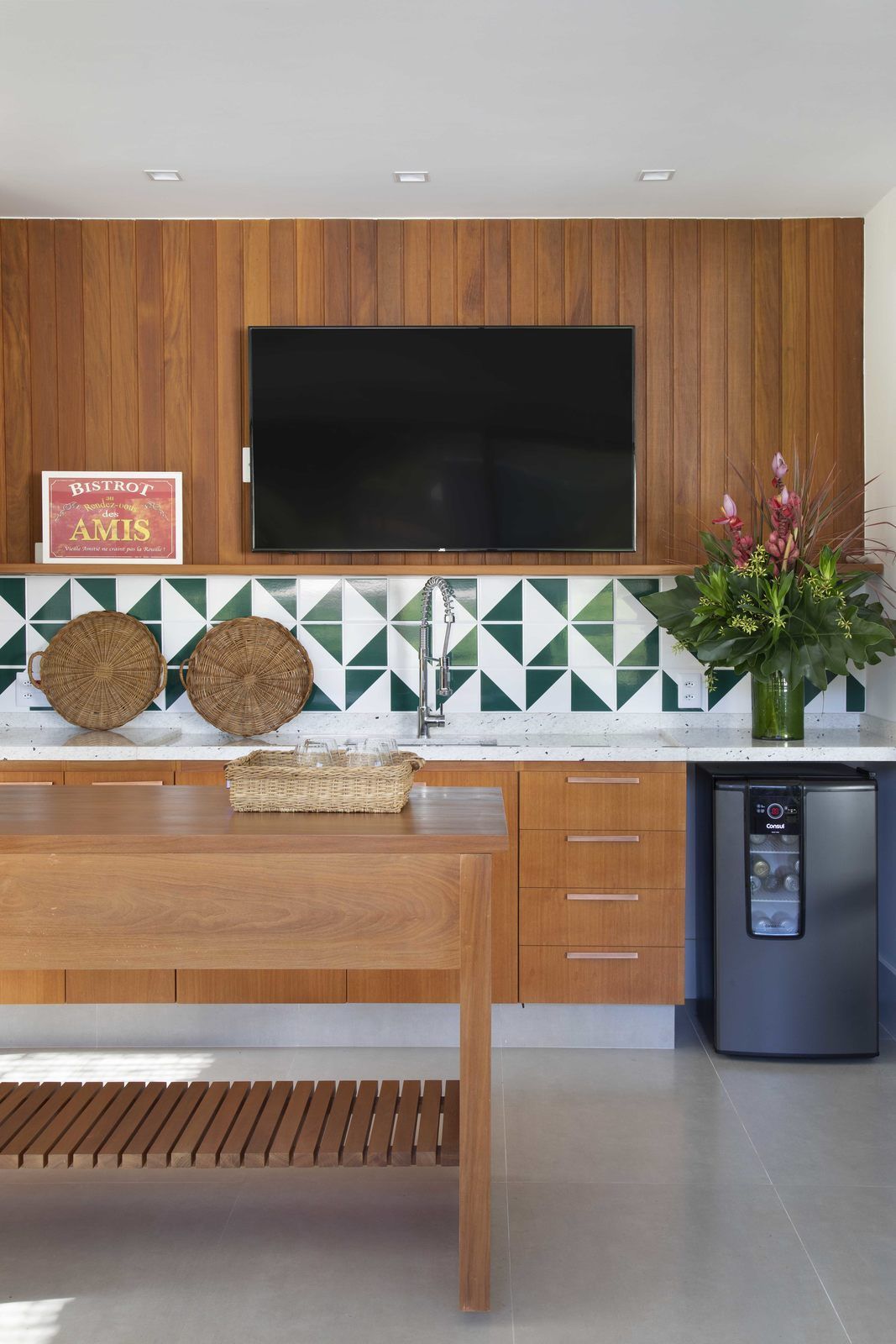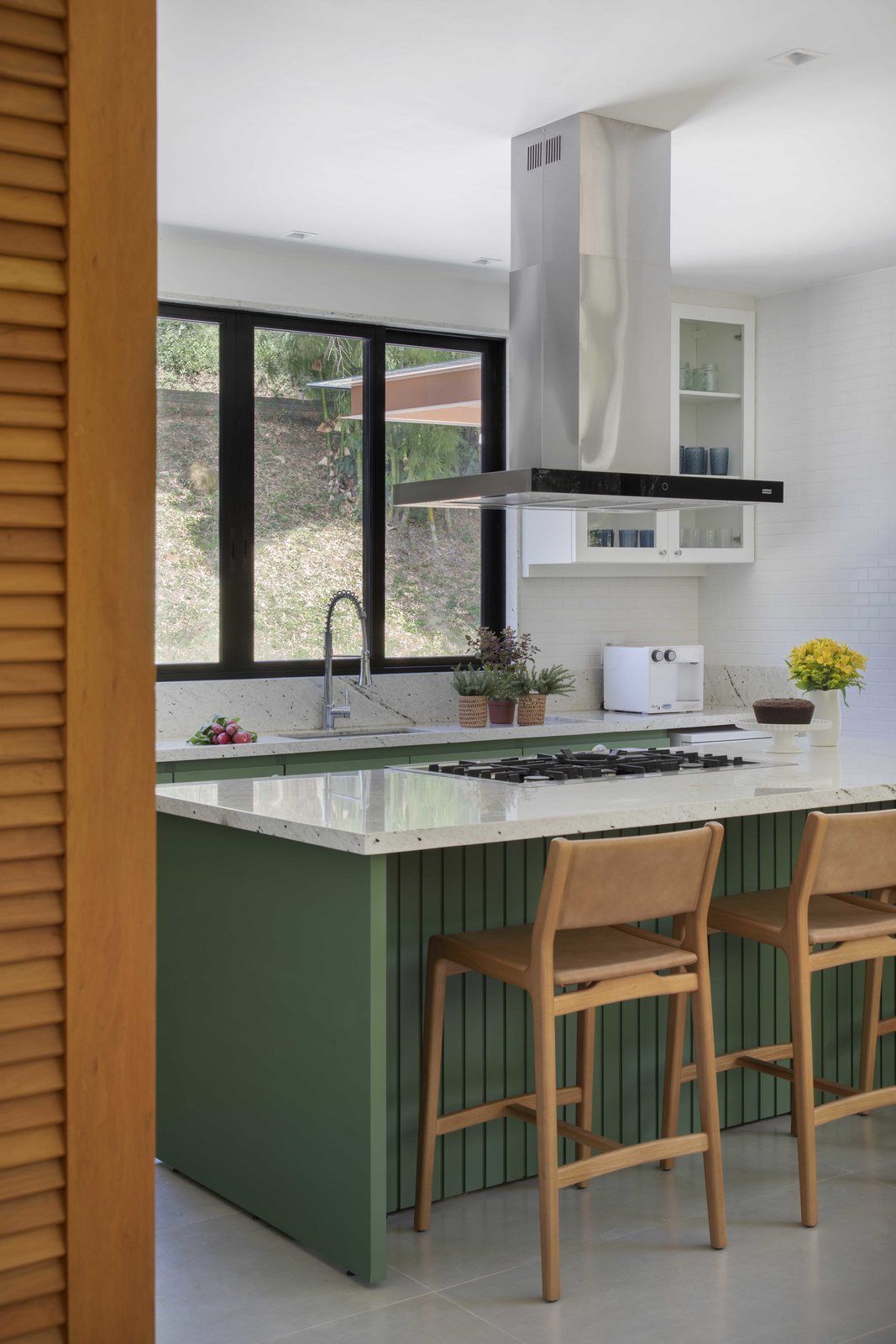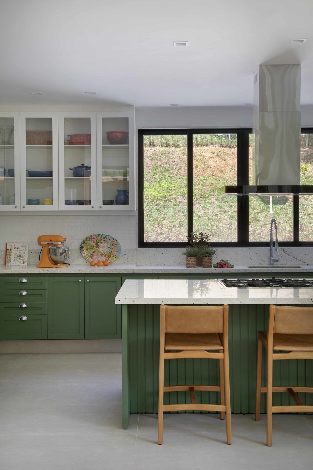 “Optamos por tons suaves e naturais, com elementos em madeira na sala e na varanda gourmet, e toques de verde na cozinha, que ganhou armários laqueados nessa cor. A casa inteira tem o mesmo piso, um porcelanato cinza-claro, em prol da praticidade e facilidade de manutenção.”