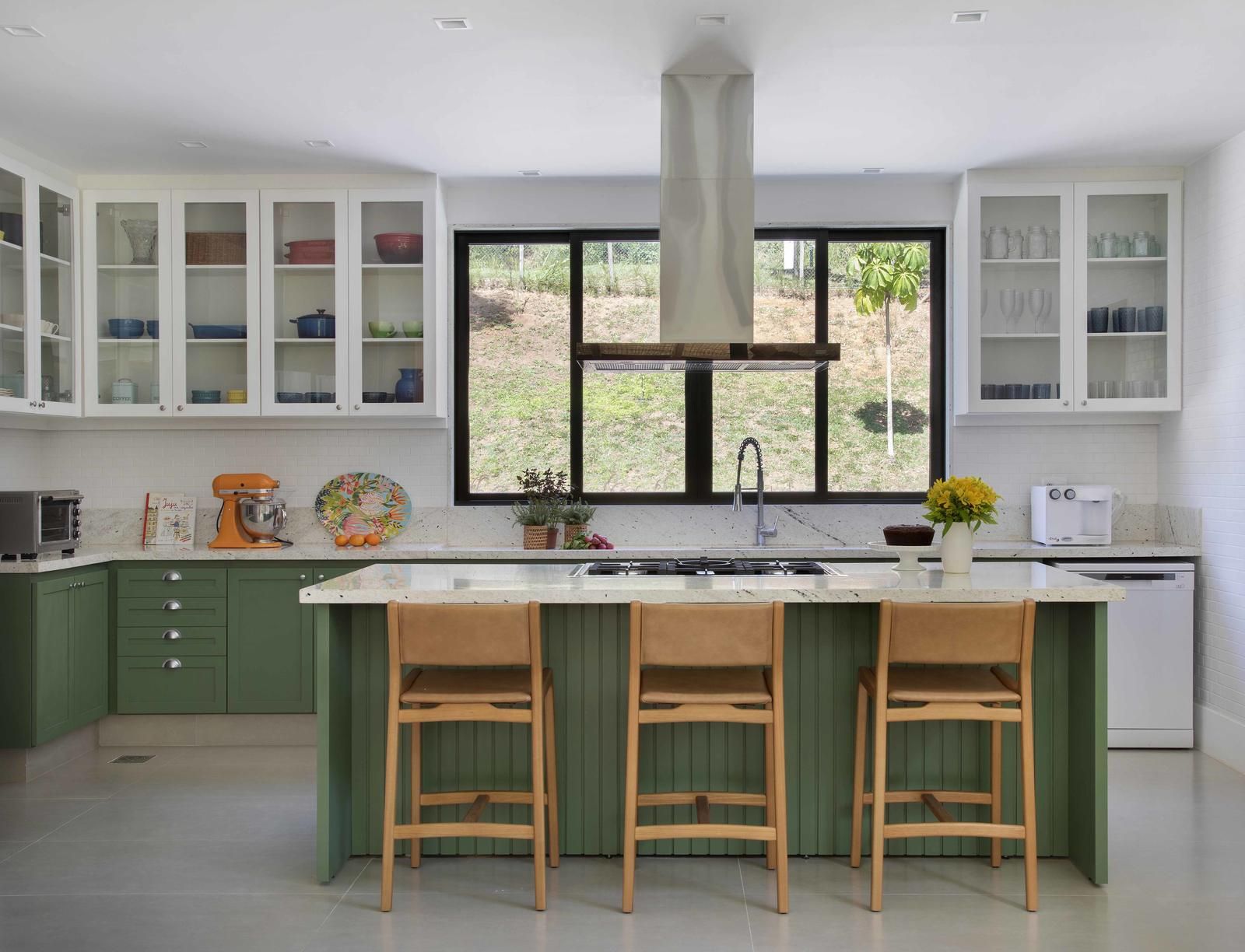 “O espaço é totalmente aberto para a sala de jantar e dispõe de uma ilha central, onde as pessoas podem se acomodar e interagir durante o preparo das refeições.”