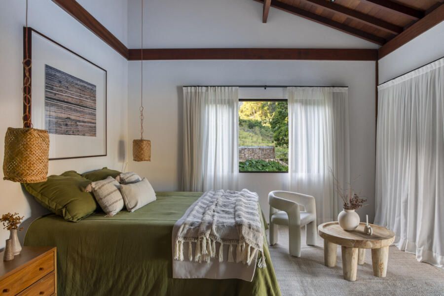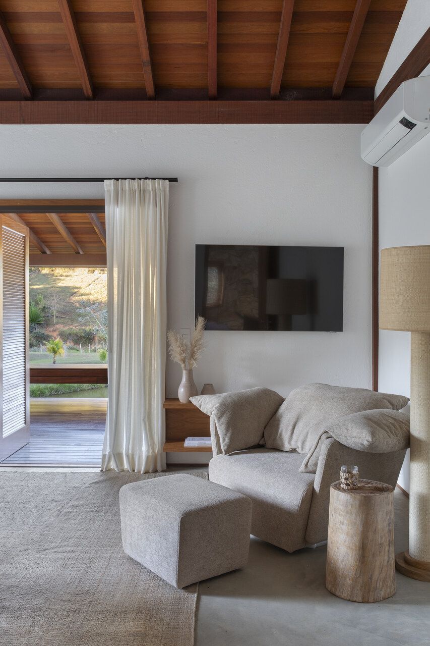 A paleta de cores segue tons terrosos e neutros, reforçando a serenidade do campo e o diálogo com o entorno. O mobiliário, majoritariamente novo, foi escolhido sem excessos, sendo simples, confortável e afetivo, para fazer com que a arquitetura seja a verdadeira protagonista.