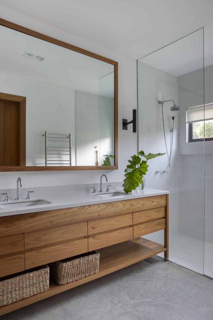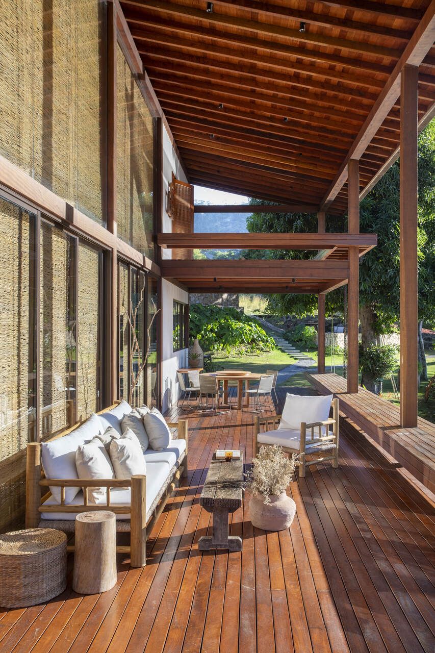 A arquitetura aposta em linhas puras e volumes bem definidos, integrando-se à topografia e ao entorno. Concreto aparente, pedra natural e madeira cumaru criam uma atmosfera rústica e acolhedora, enquanto os brises de madeira no bloco dos quartos garantem ventilação cruzada e privacidade.