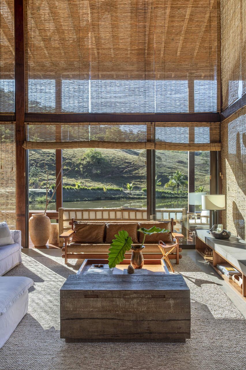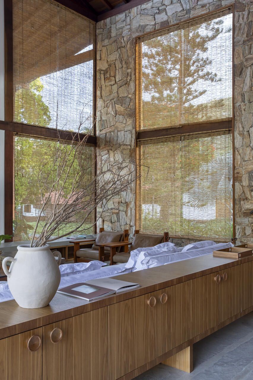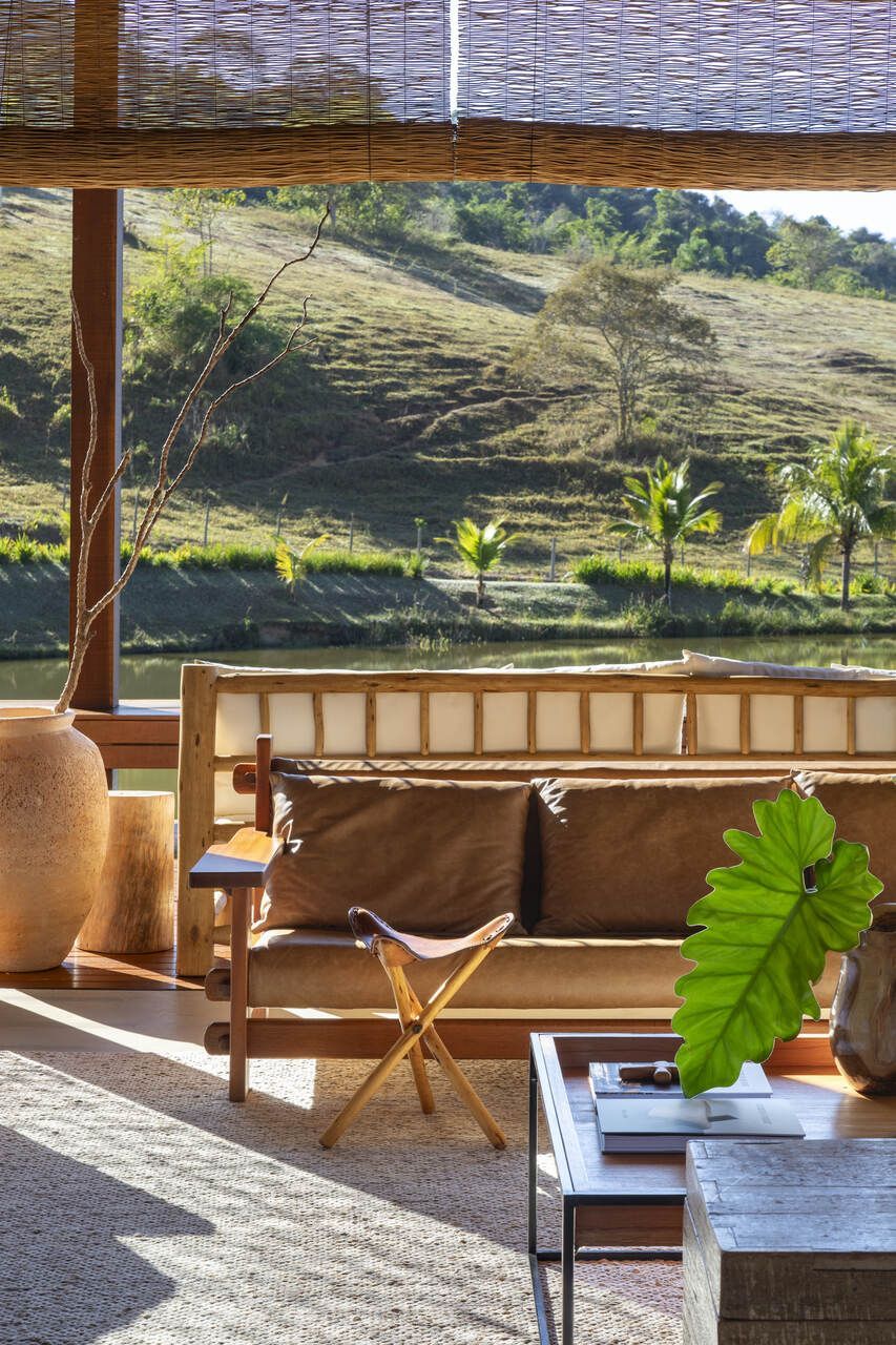 A paleta de cores segue tons terrosos e neutros, reforçando a serenidade do campo e o diálogo com o entorno. O mobiliário, majoritariamente novo, foi escolhido sem excessos, sendo simples, confortável e afetivo, para fazer com que a arquitetura seja a verdadeira protagonista.