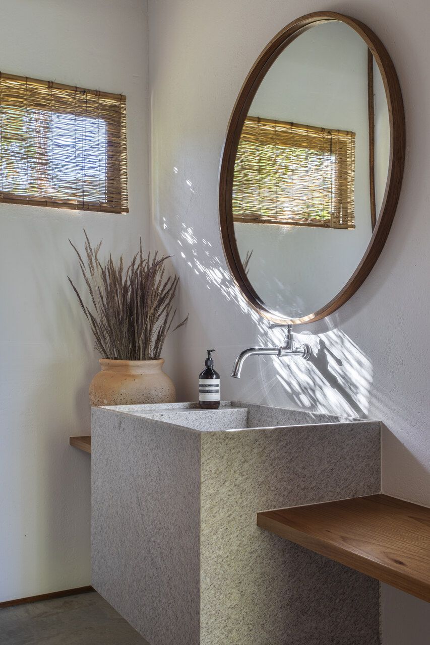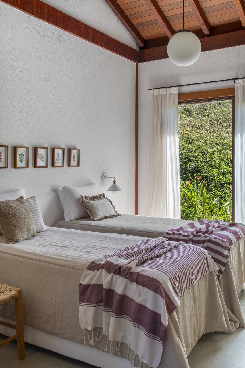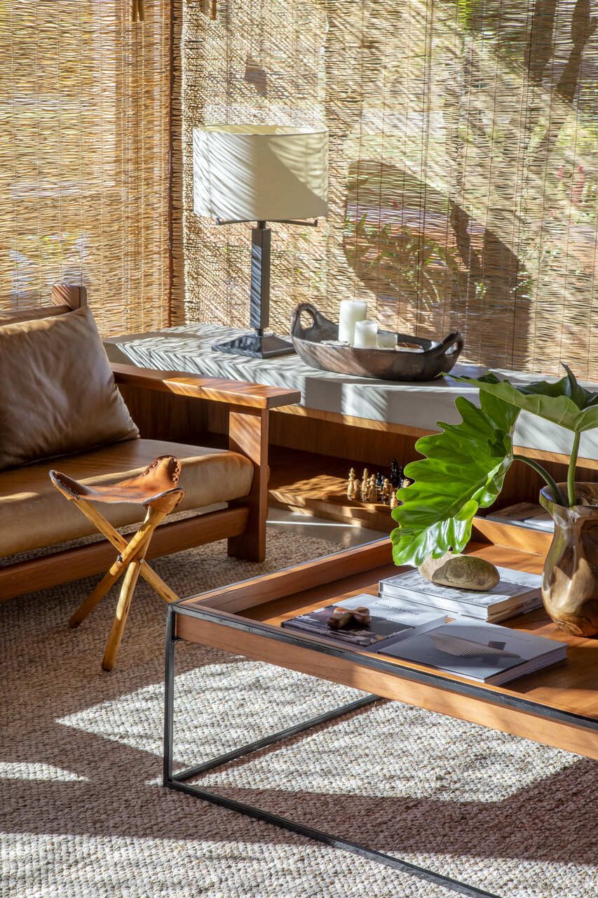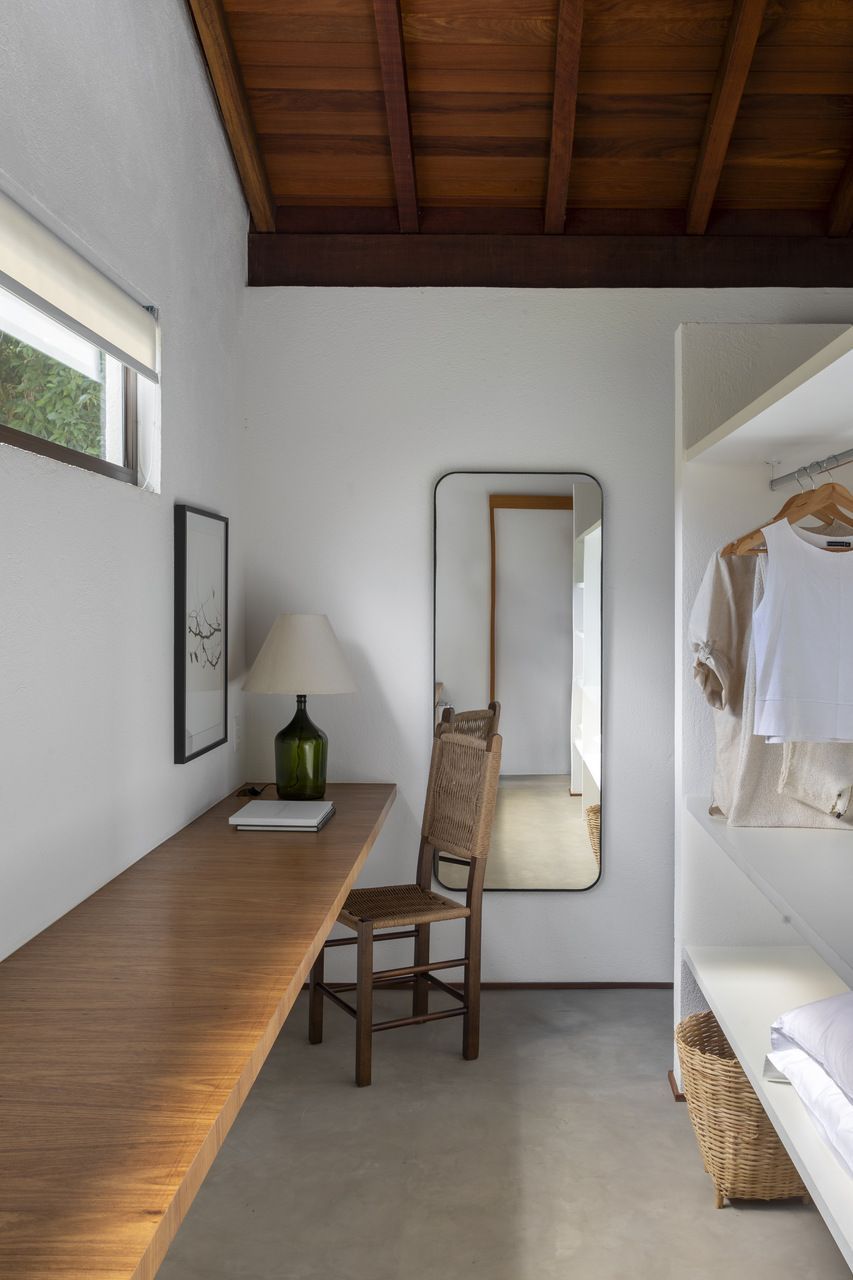 A paleta de cores segue tons terrosos e neutros, reforçando a serenidade do campo e o diálogo com o entorno. O mobiliário, majoritariamente novo, foi escolhido sem excessos, sendo simples, confortável e afetivo, para fazer com que a arquitetura seja a verdadeira protagonista.