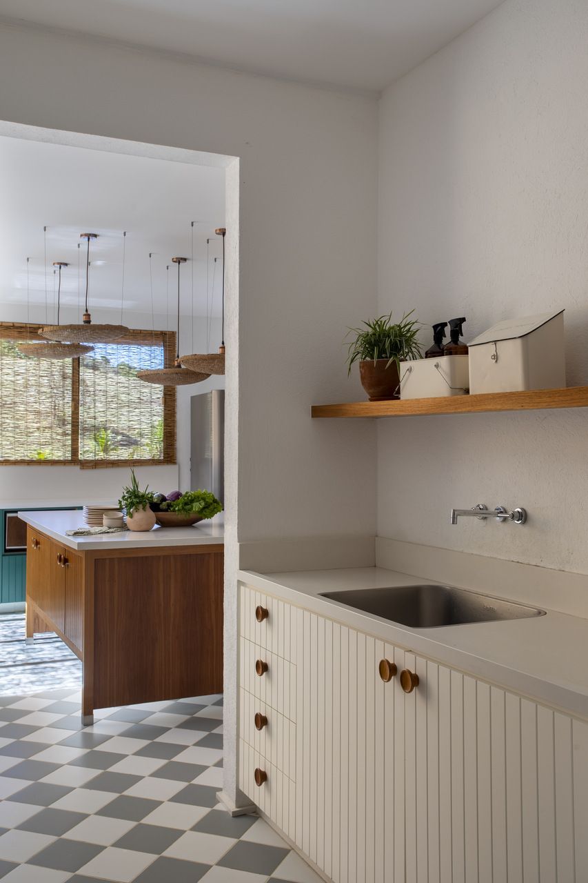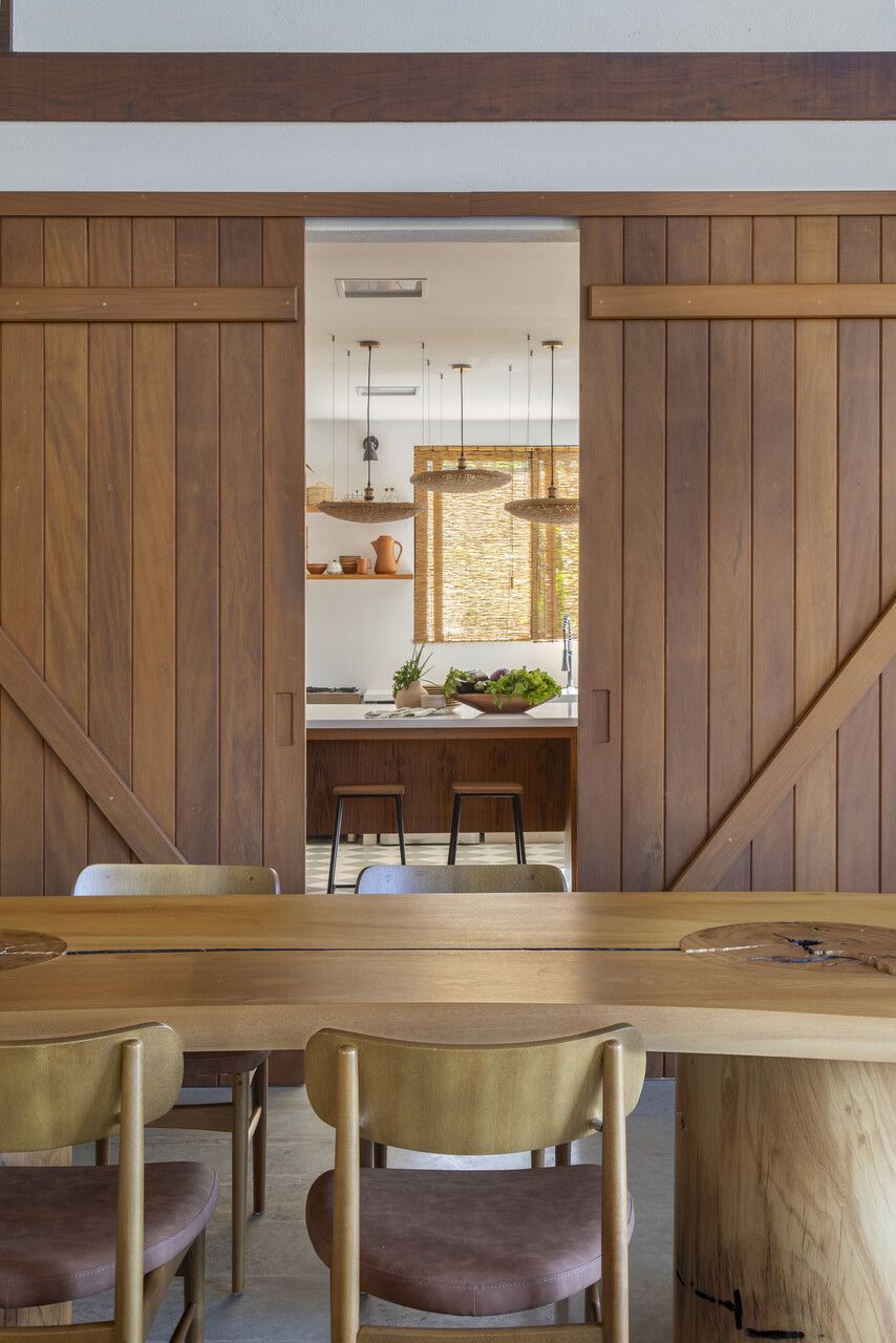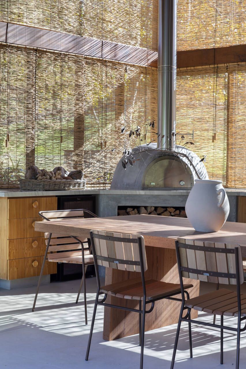 Na área social, amplos painéis de vidro permitem que interior e exterior se fundam. A varanda, projetada sobre o lago, é um dos pontos altos da casa: é nesse espaço que o café da manhã acontece todas as manhãs, com o sol se refletindo sobre a superfície da água e rebatendo na madeira do teto. A cozinha, com despensa e lavanderia integradas, é o coração da casa: um espaço de memória, repleto de referências aos tradicionais almoços familiares.