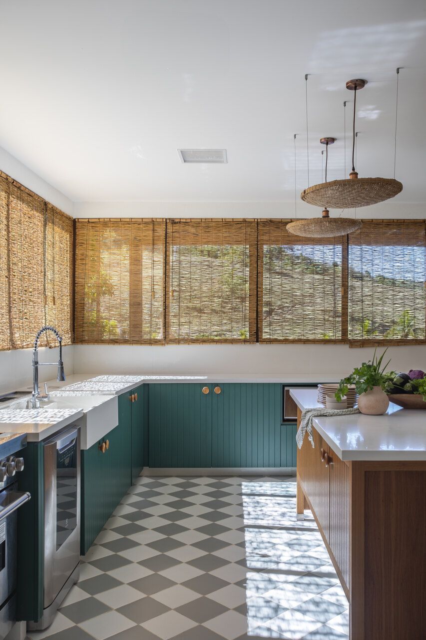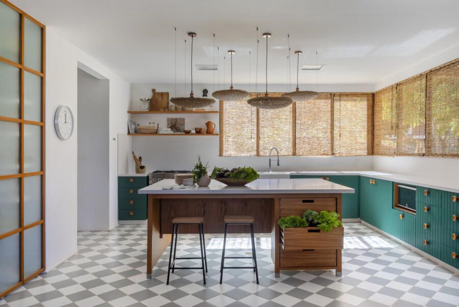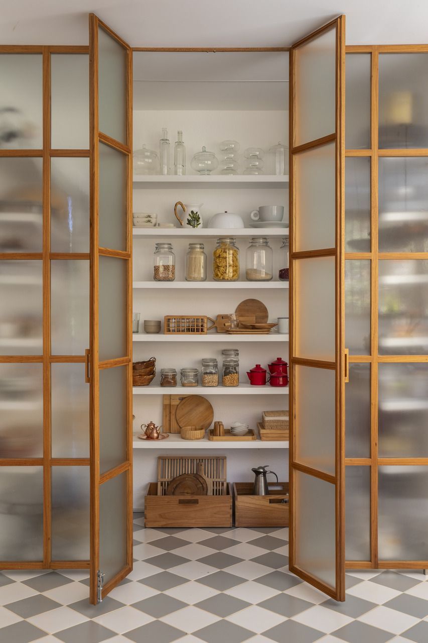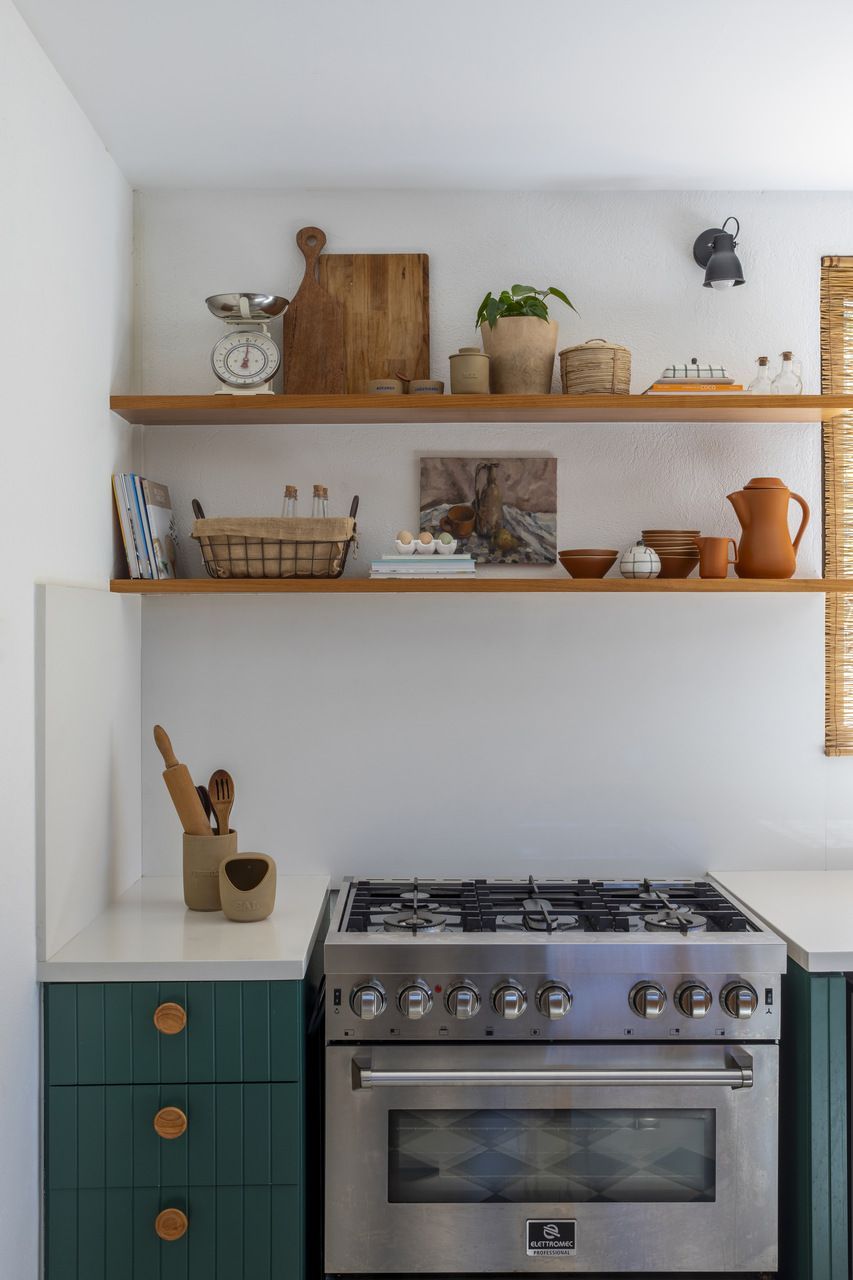 Na área social, amplos painéis de vidro permitem que interior e exterior se fundam. A varanda, projetada sobre o lago, é um dos pontos altos da casa: é nesse espaço que o café da manhã acontece todas as manhãs, com o sol se refletindo sobre a superfície da água e rebatendo na madeira do teto. A cozinha, com despensa e lavanderia integradas, é o coração da casa: um espaço de memória, repleto de referências aos tradicionais almoços familiares.