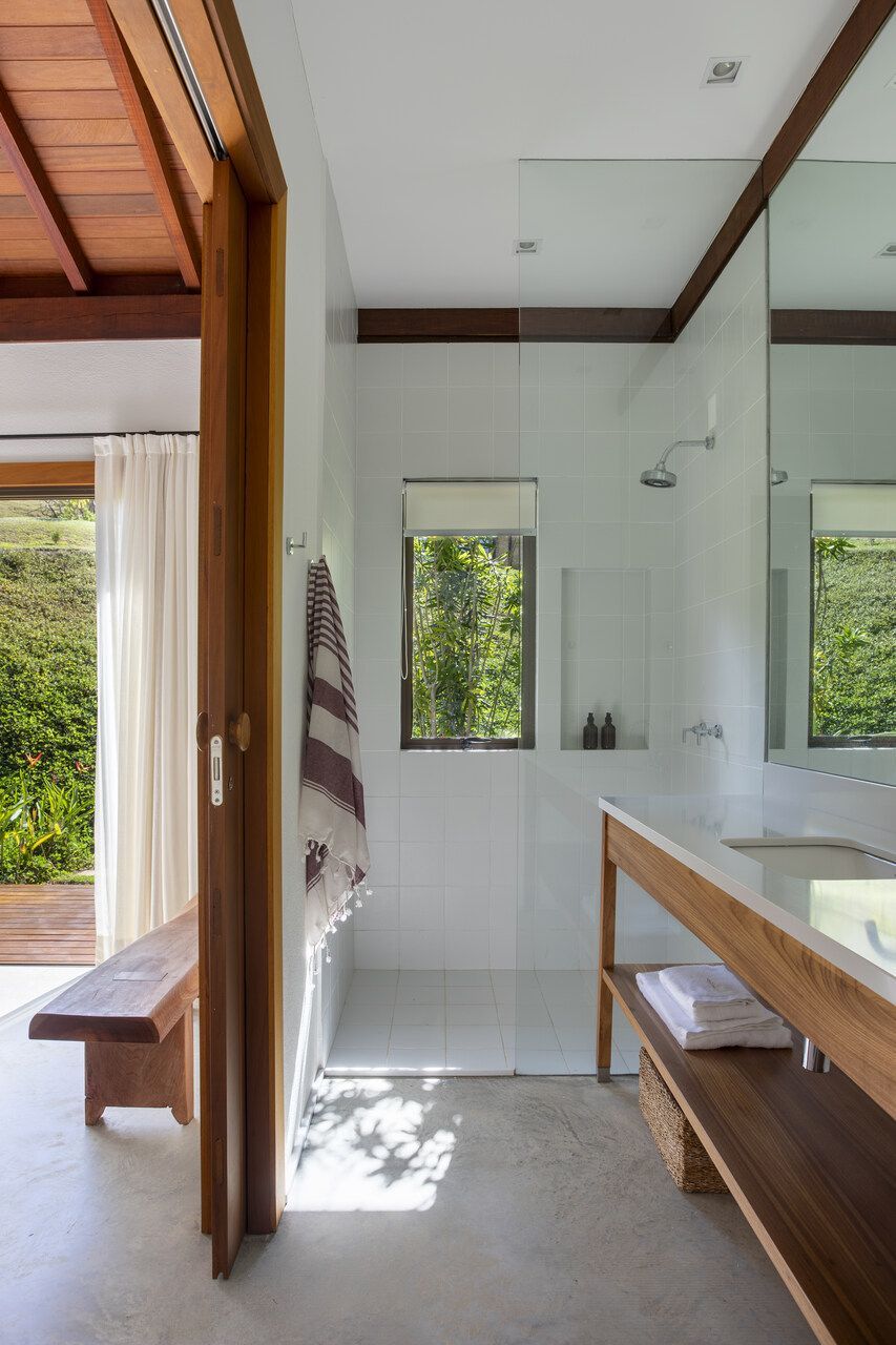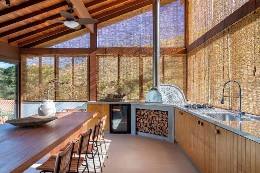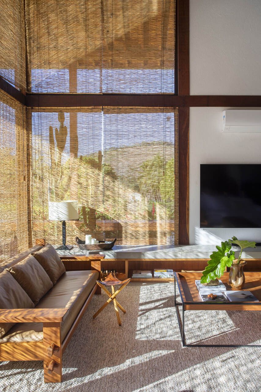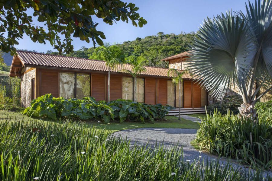 A arquitetura aposta em linhas puras e volumes bem definidos, integrando-se à topografia e ao entorno. Concreto aparente, pedra natural e madeira cumaru criam uma atmosfera rústica e acolhedora, enquanto os brises de madeira no bloco dos quartos garantem ventilação cruzada e privacidade.