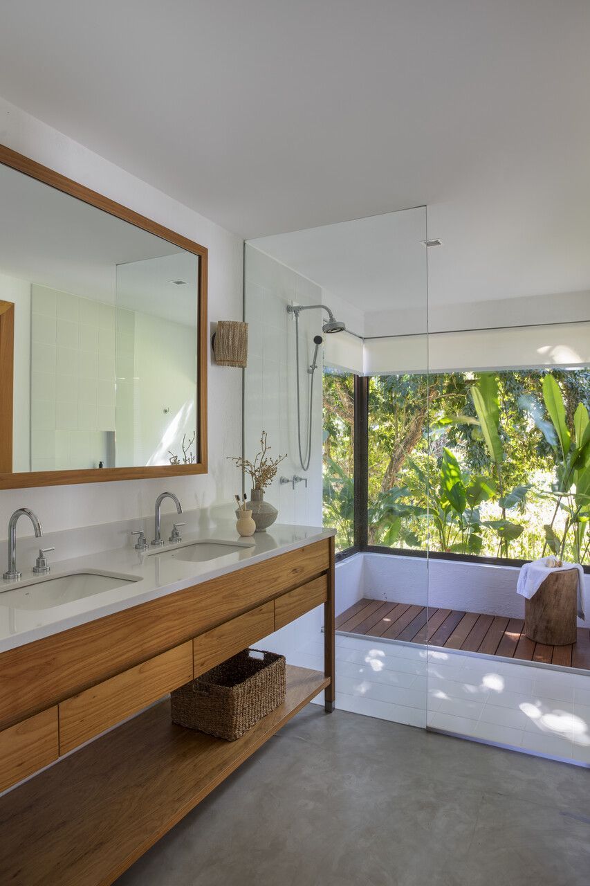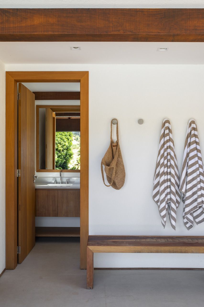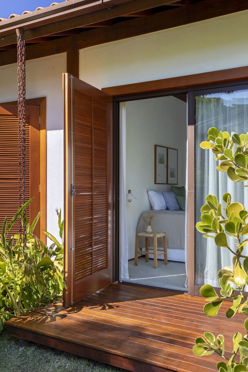 A arquitetura aposta em linhas puras e volumes bem definidos, integrando-se à topografia e ao entorno. Concreto aparente, pedra natural e madeira cumaru criam uma atmosfera rústica e acolhedora, enquanto os brises de madeira no bloco dos quartos garantem ventilação cruzada e privacidade.