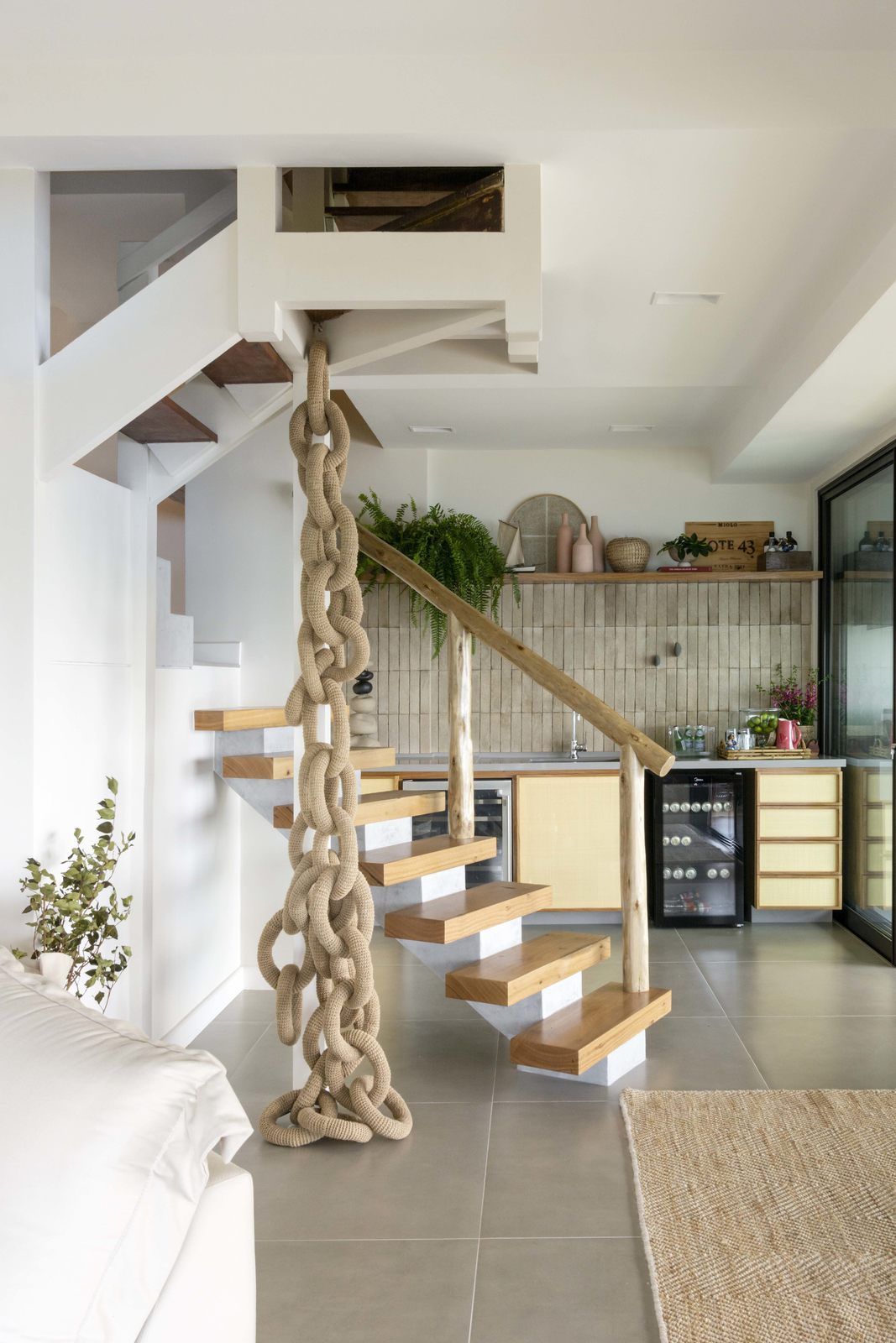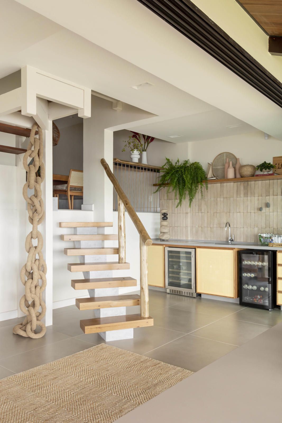 “A escada para o segundo piso era um problema: originalmente posicionada no meio da sala de estar, ela interrompia o fluxo e deixava o espaço espremido, pouco usual, comprometendo a distribuição das funções. Por isso, foi feita uma nova escada, implantada na diagonal, promovendo maior fluidez com eficiência e leveza. Sua estrutura recebeu uma base metálica central, com degraus moldados em concreto no local. E o guarda-corpo em tora de eucalipto certificado contribui para a segurança, além de ser um elemento muito charmoso.”