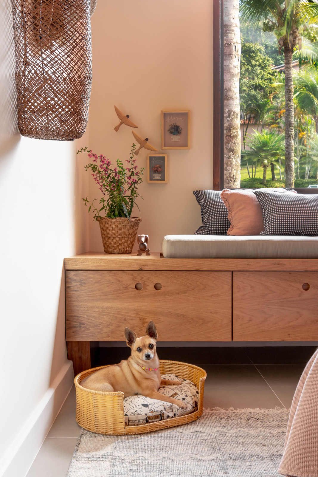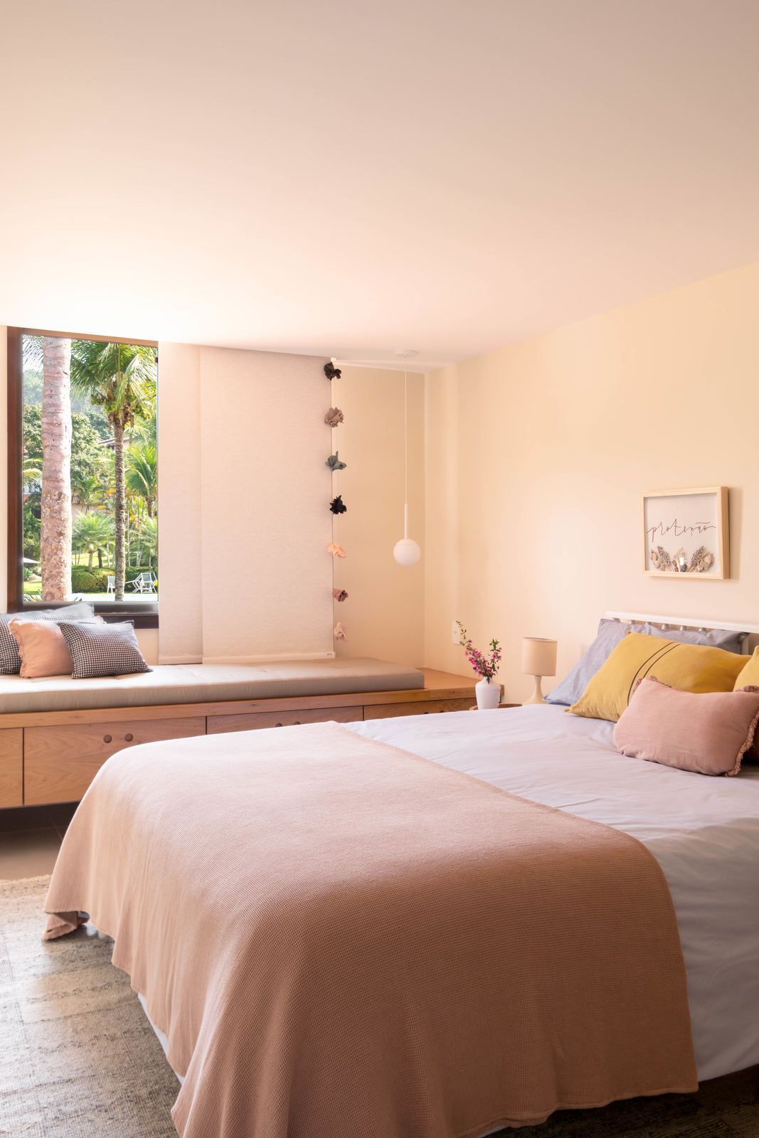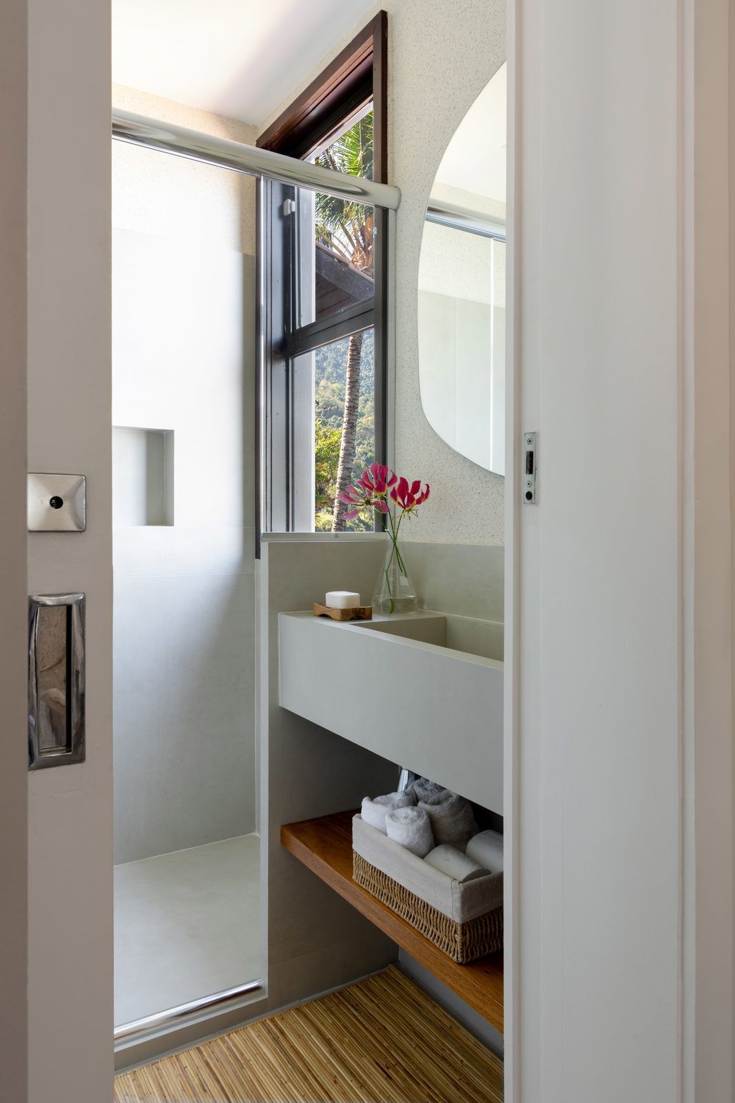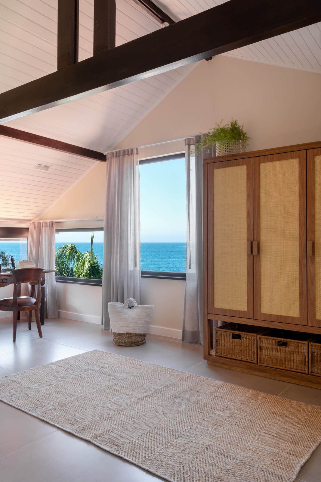 “O objetivo foi proporcionar fluidez, refletida na decoração com cores da natureza, como os verdes, crus e caramelos mais quentes, que evocam a sensação de tranquilidade, prazer e relaxamento. O quarto do casal recebeu amplos panos de vidro e todas as esquadrias originais frontais foram reorganizadas, de forma que fosse possível contemplar o visual do mar. É uma casa generosa, que realmente parece fazer um carinho em quem lhe confia seu tempo precioso para esquecer o mundo lá fora.”