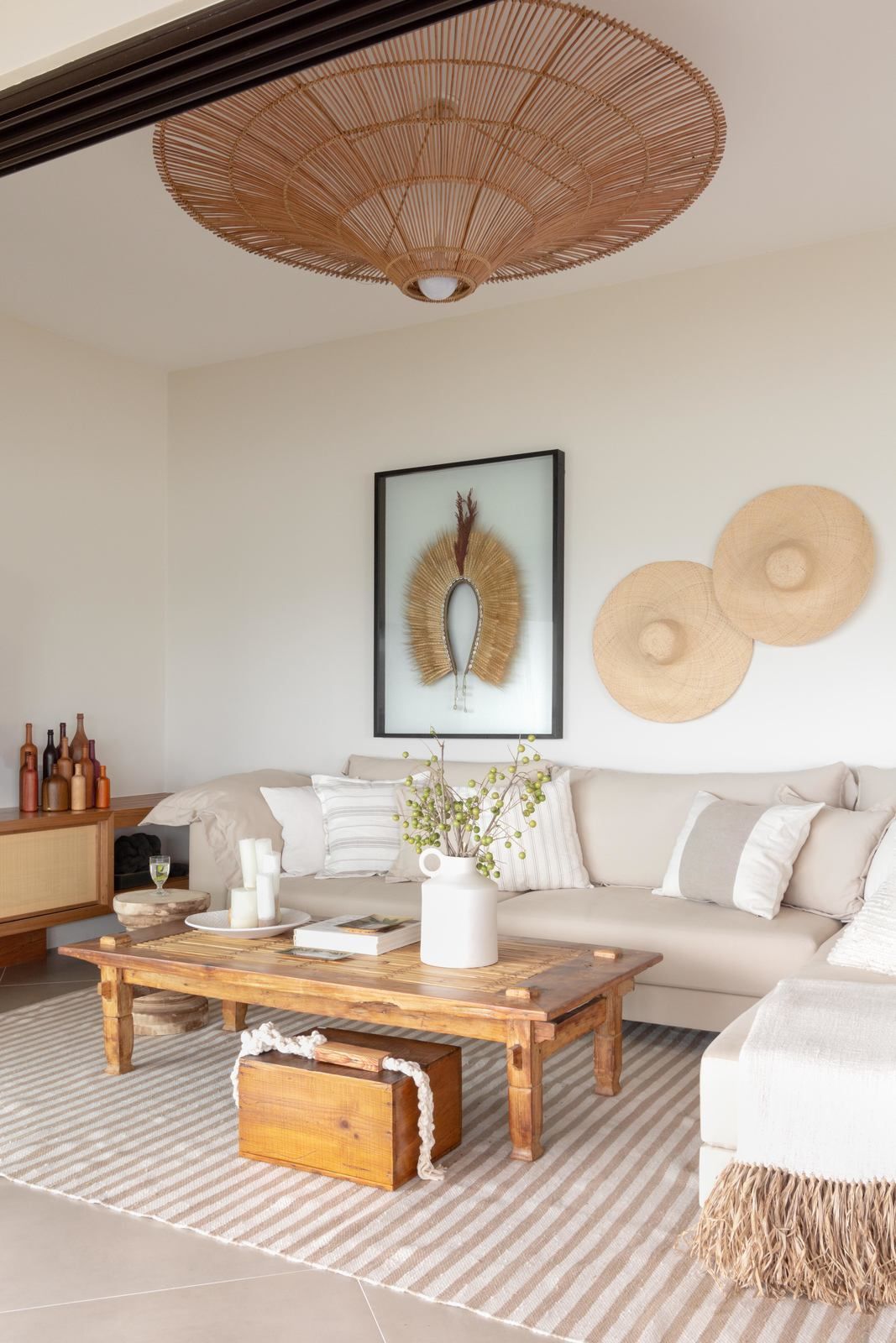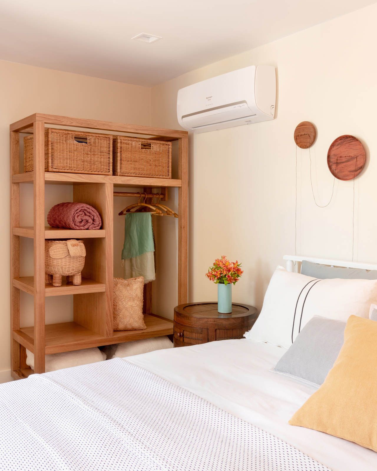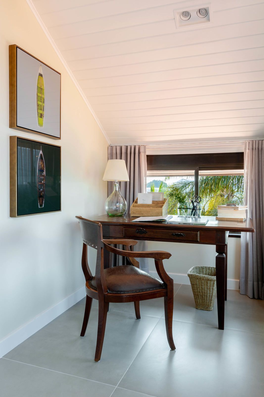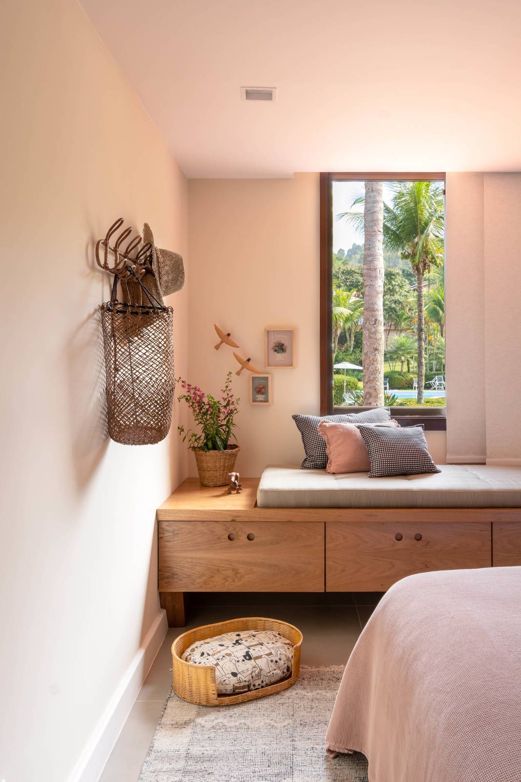 “O objetivo foi proporcionar fluidez, refletida na decoração com cores da natureza, como os verdes, crus e caramelos mais quentes, que evocam a sensação de tranquilidade, prazer e relaxamento. O quarto do casal recebeu amplos panos de vidro e todas as esquadrias originais frontais foram reorganizadas, de forma que fosse possível contemplar o visual do mar. É uma casa generosa, que realmente parece fazer um carinho em quem lhe confia seu tempo precioso para esquecer o mundo lá fora.”