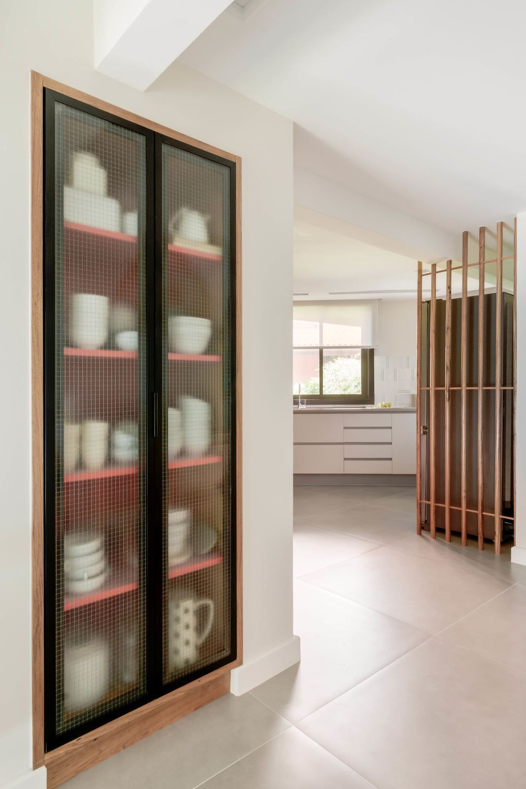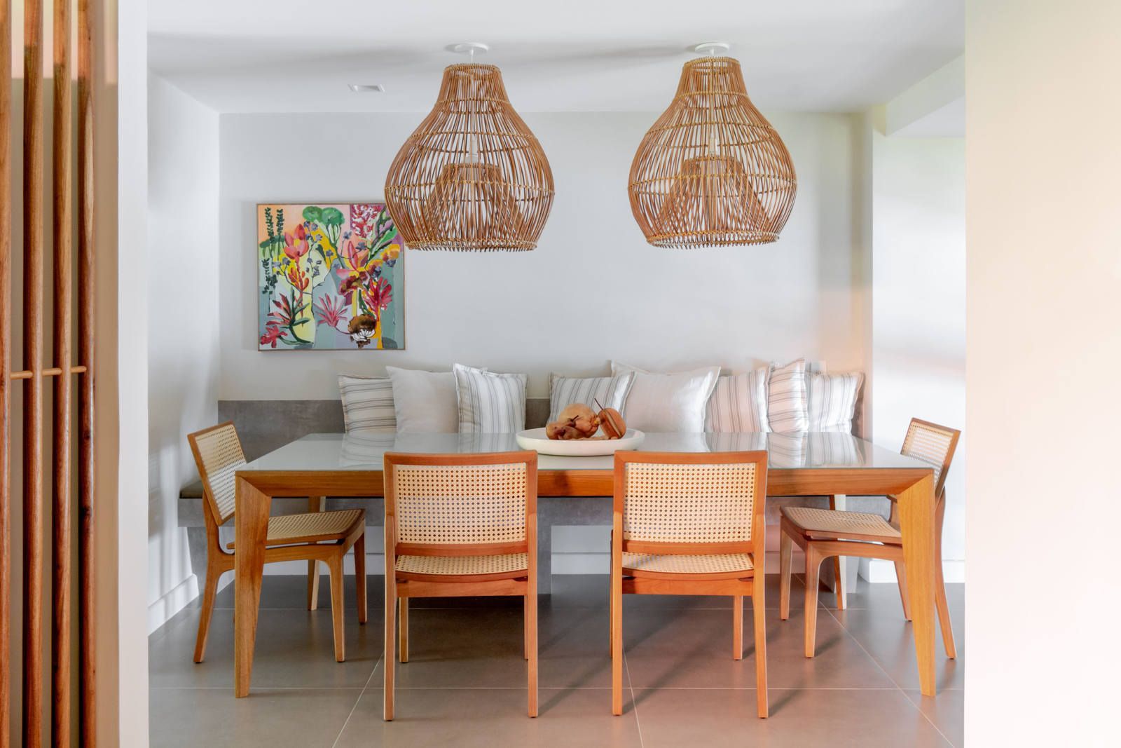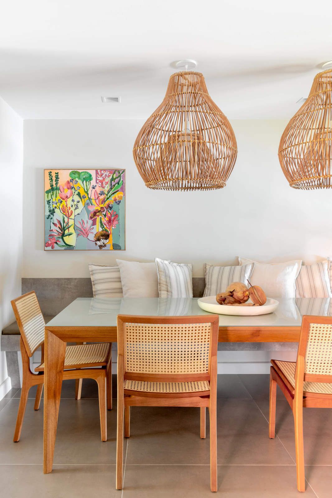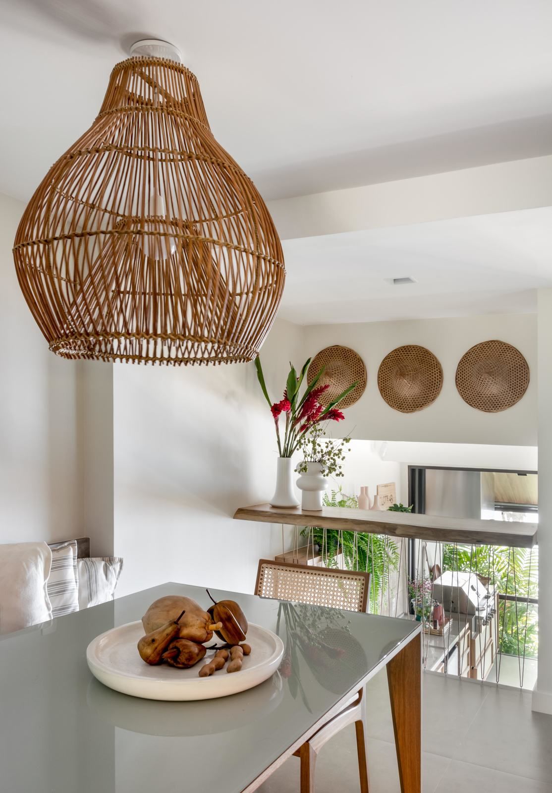 “Objetos com forte valor sentimental conversam com itens rústicos e muitas peças da família. O acervo super original foi garimpado em lojas de artesanato e feiras, além de peças adquiridas pela própria cliente ao longo do processo de reforma. Houve uma troca permanente de sugestões com a cliente e muita pesquisa.”