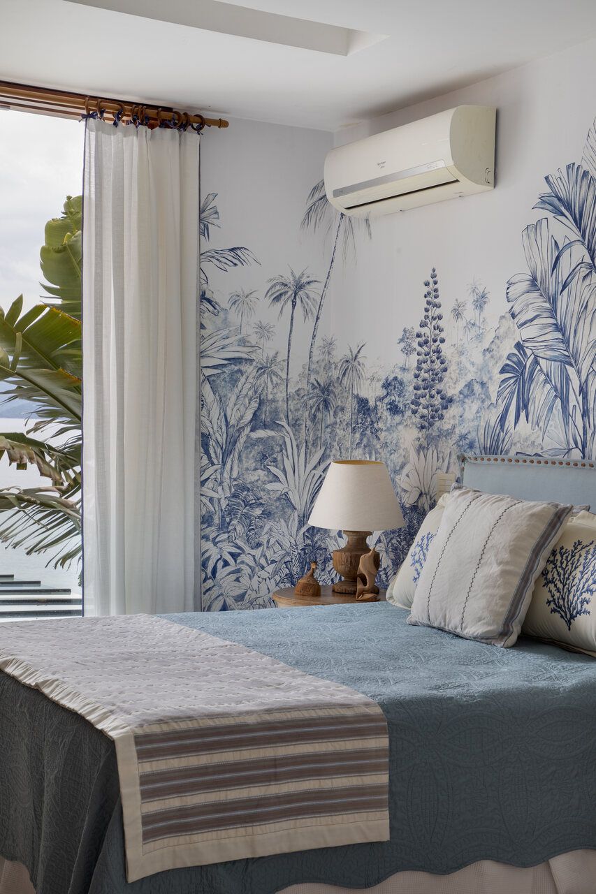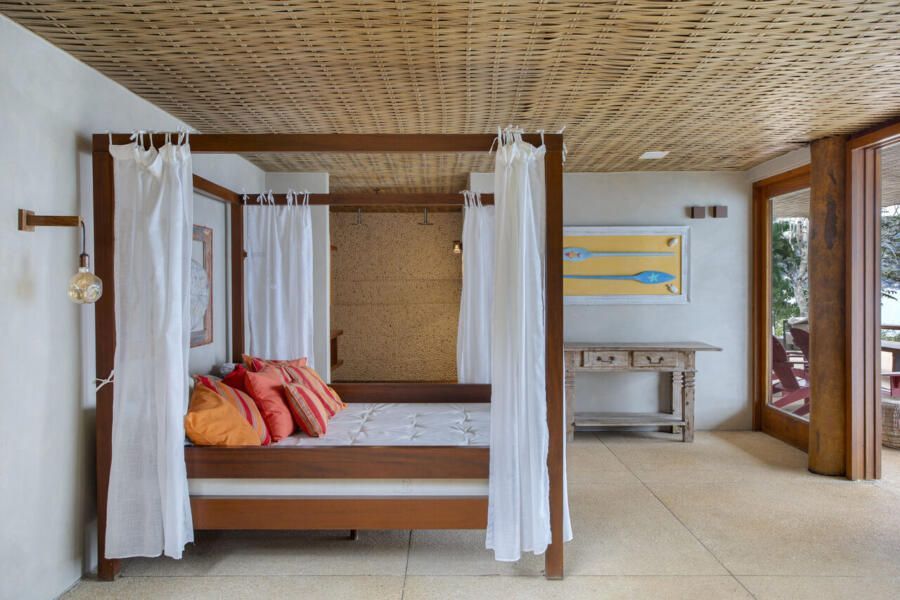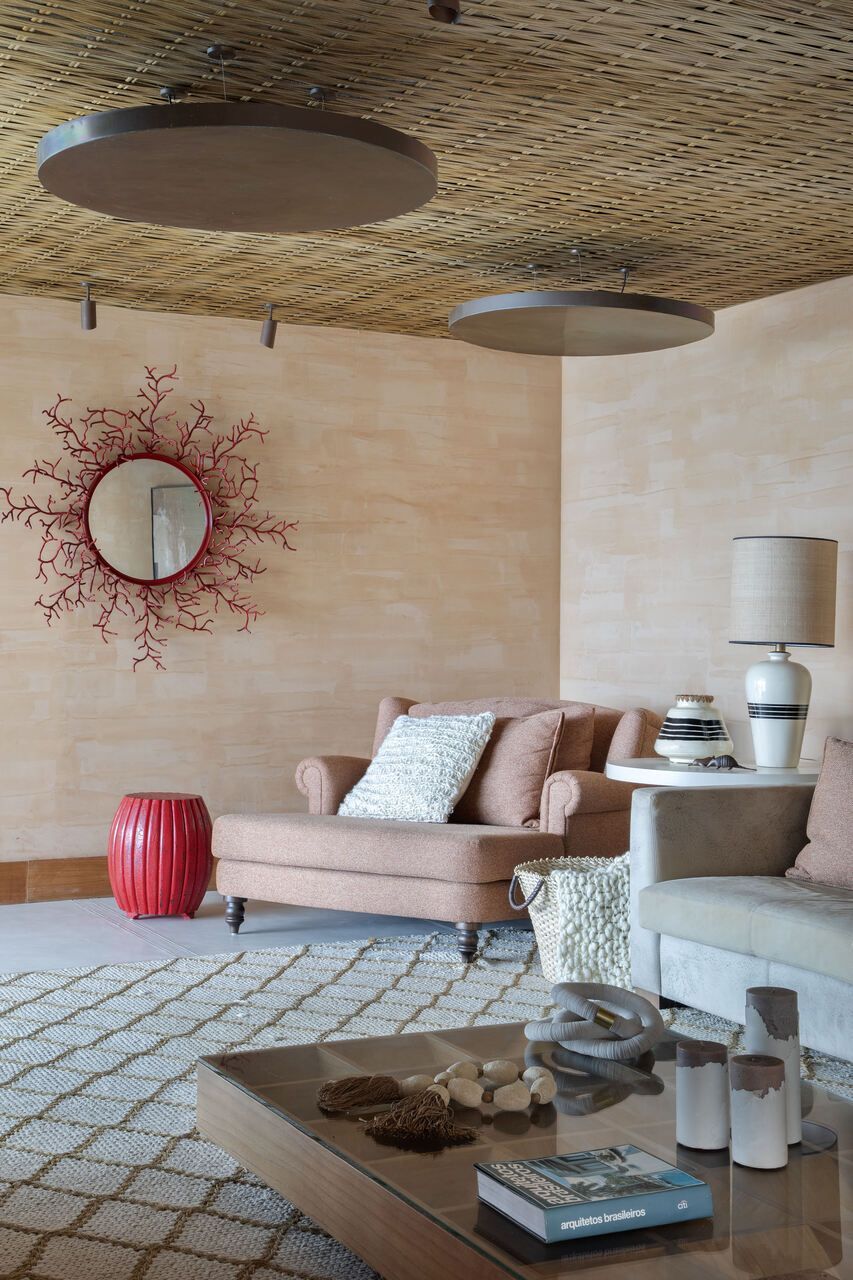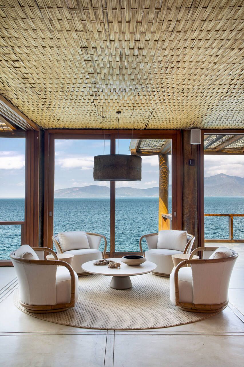 Na decoração, poucas peças foram mantidas, como a cama e as mesas de cabeceira da suíte do casal, a mesa de jantar e o camão no spa. O restante do mobiliário foi escolhido para incentivar o relaxamento e a contemplação da paisagem, com peças grandes, confortáveis e integradas ao entorno. Entre os destaques estão as poltronas Astúrias, de Carlos Motta, posicionadas na varanda voltada para o mar, que equilibram design assinado e descontração. A paleta de cores neutra, com branco, bege e off-white, recebe toques de azul e verde-água, além de madeira clara e palha, criando um pano de fundo elegante para valorizar a vista.